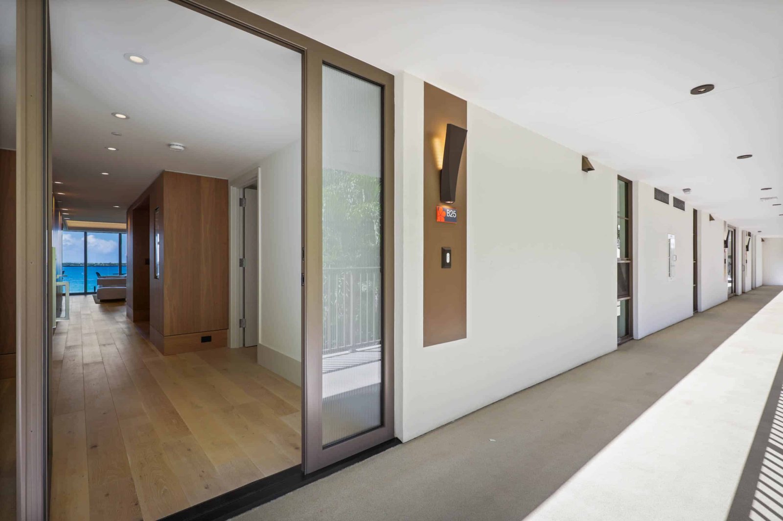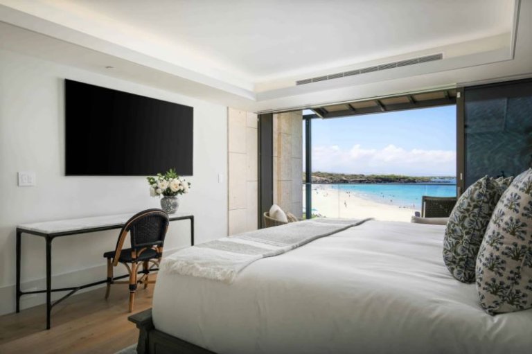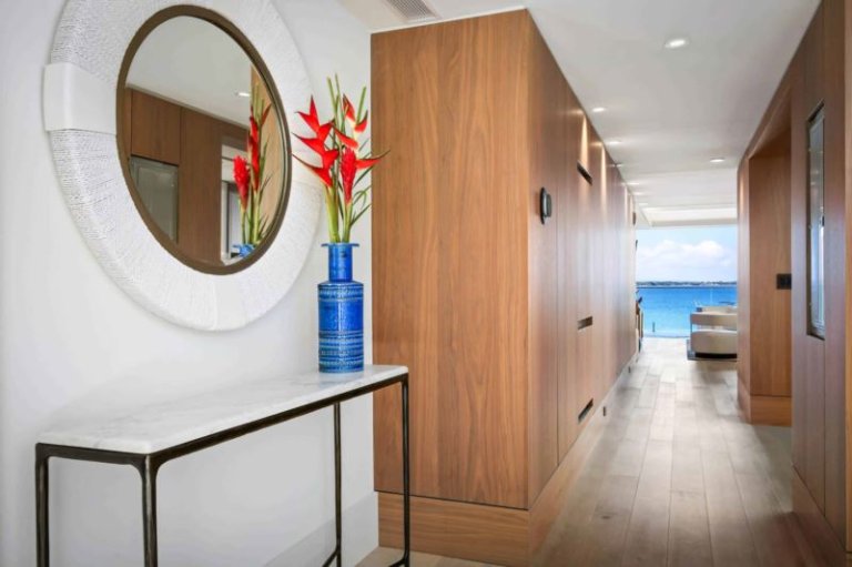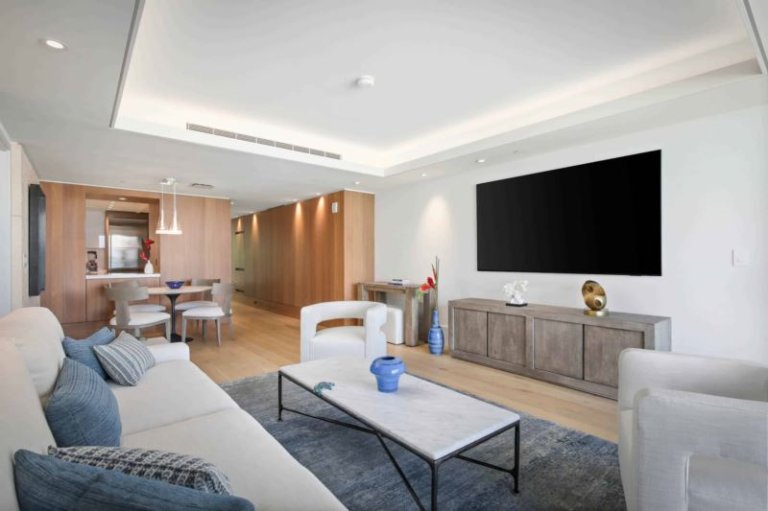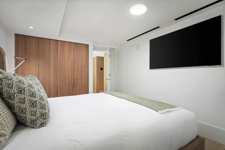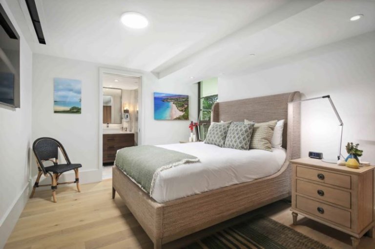 At night, sliding screens allow the master suite guests to drift asleep to the gentle crash of ocean waves while enjoying the comfort of a king-size, handcrafted Aireloom mattress. In addition to a walk-in closet with a dresser, the master suite includes an oversized marble bath with a soaking tub, rain shower, and Toto bidet. The second suite includes a queen-size Aireloom mattress with a private, full bath that includes a rain shower and a Toto bidet toilet. With its attached bath and separation from the living area, the second suite is naturally private. This unit also includes a fully equipped chef's kitchen with Wolf, Sub-Zero, and Miele appliances. The master and living rooms each offer a desk for those that need to work remotely. An Asko washer/dryer, central air conditioning, and complimentary high-speed WiFi (> 100Mbps up/down) create all the comforts of home. For entertainment, the living room includes an 85” Samsung Smart TV with multiple streaming services. The master and second suite each have the same TV model with 75” and 65” screens, respectively.