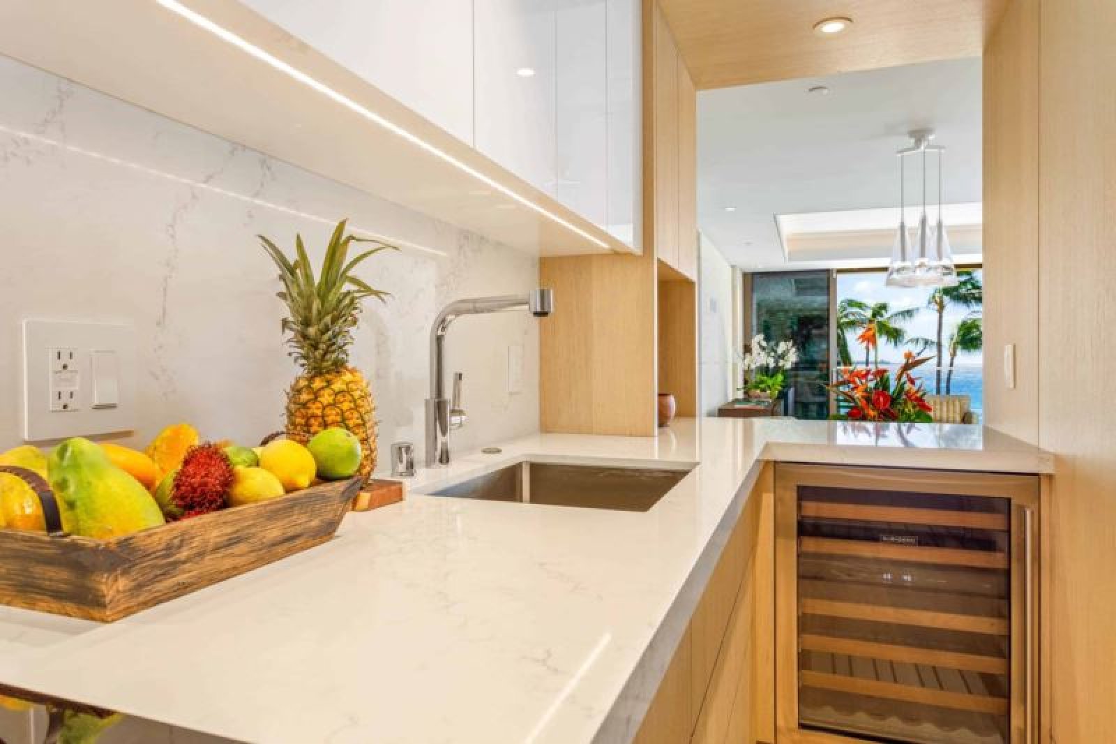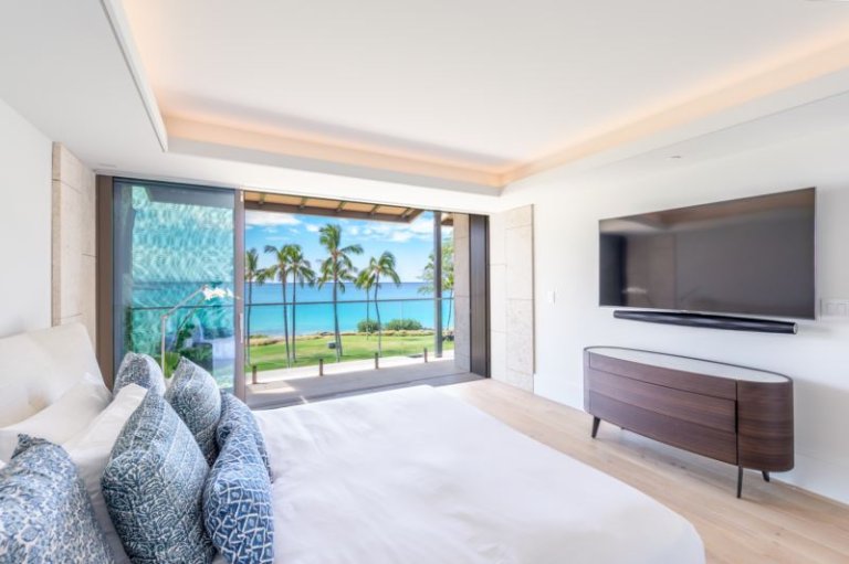 This refined, oceanfront, newly-constructed, third level island masterpiece offers floor-to-ceiling sliding window walls that create indoor/outdoor living space, a chef’s kitchen outfitted with professional-grade Wolf, Sub-Zero and Miele appliances, wine storage and hand-crafted cabinetry. Additional features include two guest suites, each with a retreat-like, attached bath and sumptuous king size bed, an Asko washer/dryer, air conditioning and furnished lanai. This residence is steps from the Hapuna Golf Course Clubhouse.