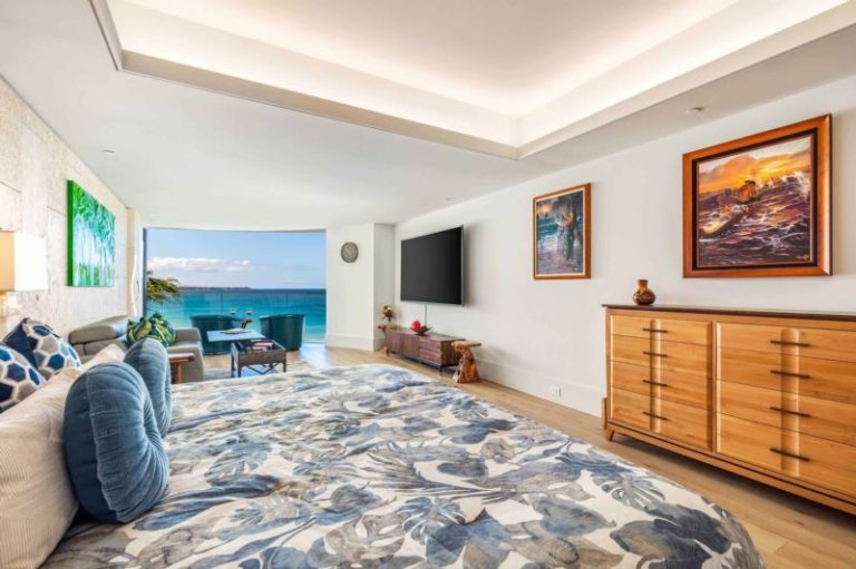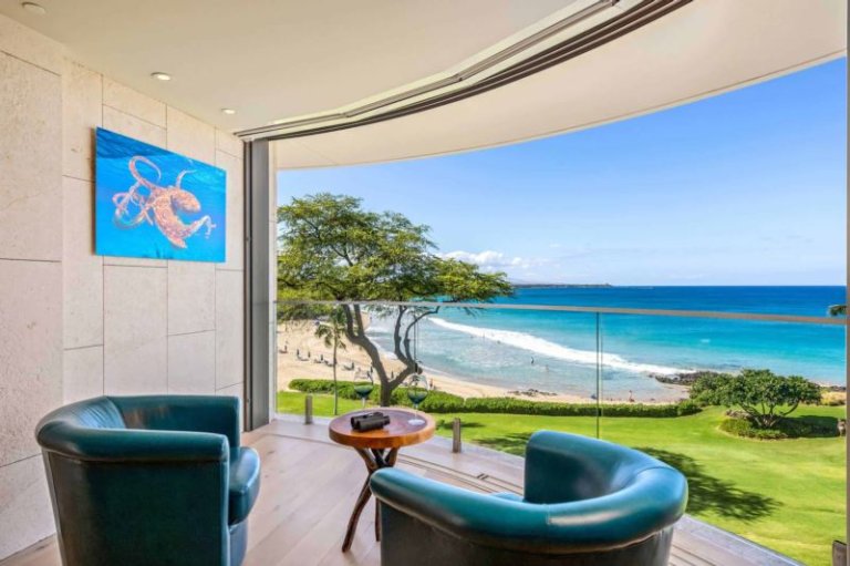 Relax in the luxurious comfort and privacy of this oceanfront, deluxe studio penthouse, just steps from the white sands of world famous Hapuna Beach. Enjoy spectacular sunset ocean views from the unique, four floor-to-ceiling radius glass pocketing slider doors. This newly-constructed, top floor studio offers a full chef’s kitchen outfitted with professional-grade Wolf cooktop, Sub-Zero refrigerator and Miele appliances, 42 bottle wine storage, dishwasher plus a dining niche. Additional features include an attached bath, large shower, king Purple mattress with adjustable zero gravity base, LG 86” smart TV, Orren Ellis Ozawkie genuine leather queen sleeper sofa with memory foam mattress, separate laundry room with Asko washer/dryer.