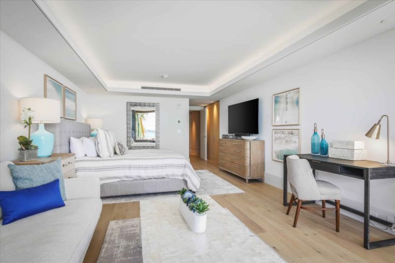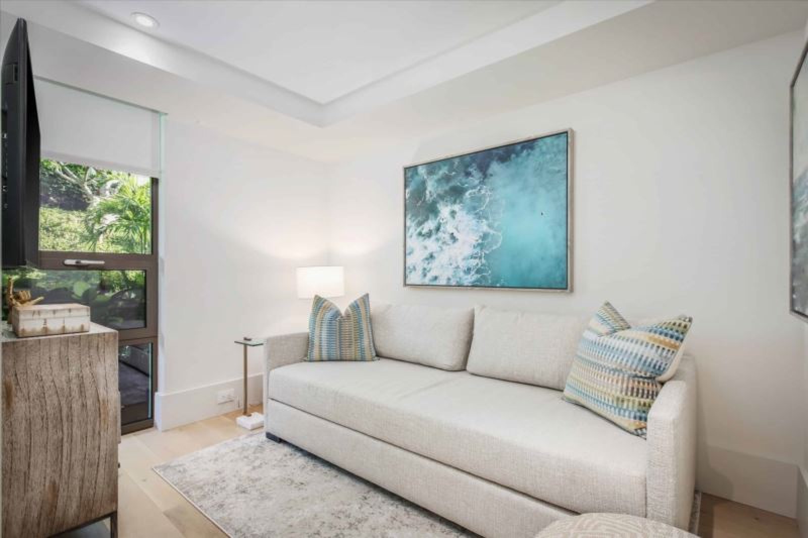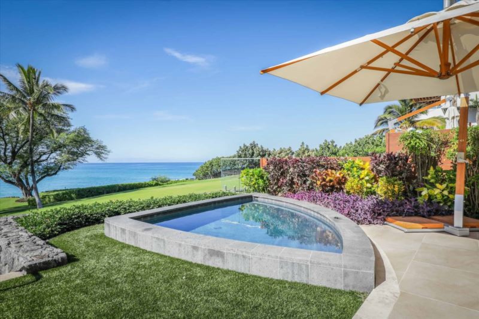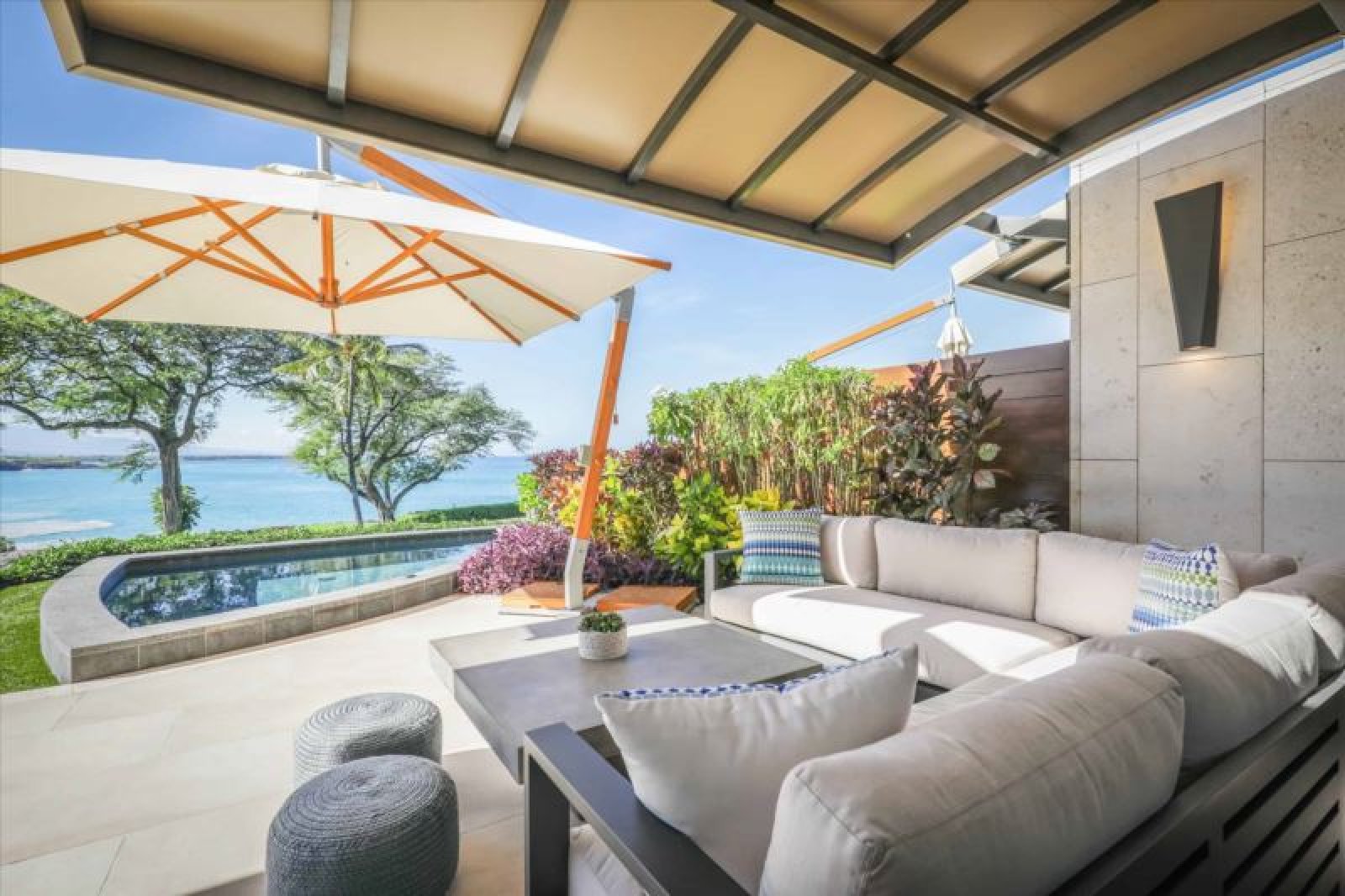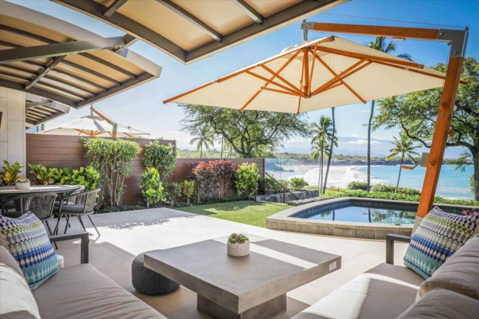 This oceanfront, newly-constructed, island masterpiece offers floor-to-ceiling sliding window walls that create indoor/outdoor living space, a gourmet kitchen with Wolf and Sub-Zero appliances, custom cabinetry and lighting, plus a dining table for six. Additional features include a grand master suite with a king size bed, desk/work space, sitting area and attached, spa-inspired bathroom, a guest bedroom with a queen size bed and garden view, a den/bonus room with sleeper sofa, air conditioning, washer/dryer, a private plunge pool, and a superbly-furnished lanai overlooking the ocean. This residence is steps from the Hapuna Golf Course Clubhouse.