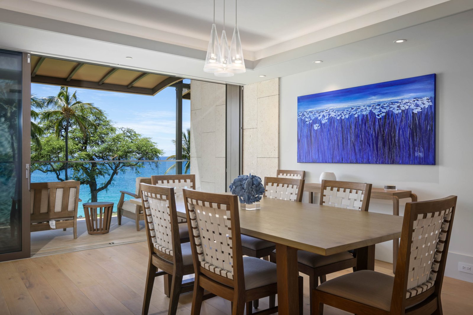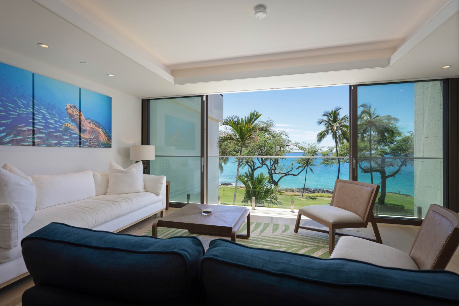 This opulent, oceanfront, third level island masterpiece offers floor-to-ceiling sliding window walls that create indoor/outdoor living space, an epicurean kitchen outfitted with professional-series Wolf and Sub-Zero appliances, including double ovens and wine storage, as well as a dining table for six+. Additional features include three guest suites, each with a spa-inspired, attached bathroom (two have California king beds, the third has two twin beds that can be converted into a king), a complete laundry room, a twin sleeper sofa, air conditioning and furnished lanai. This residence is steps from the Hapuna Golf Course Clubhouse.