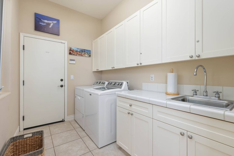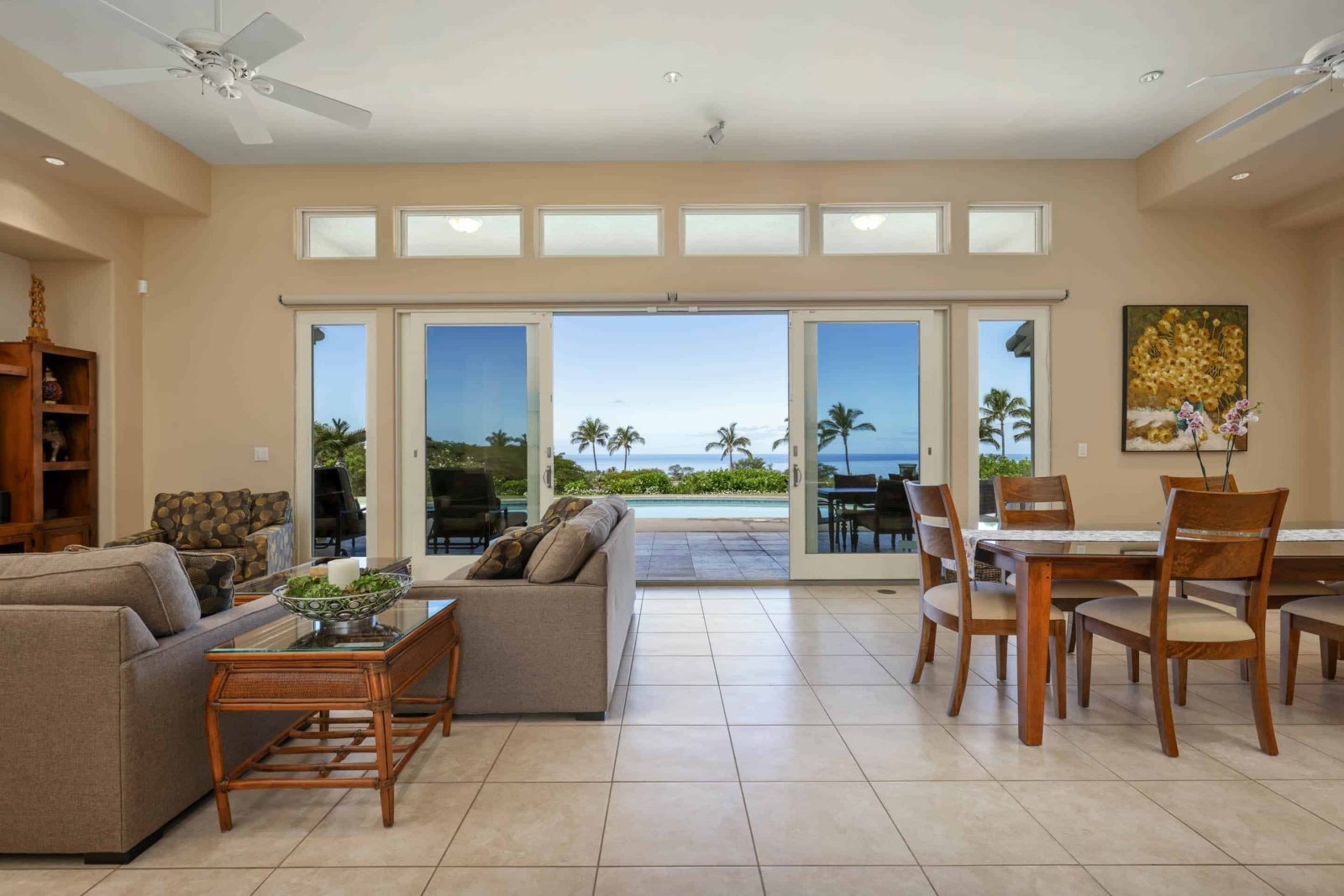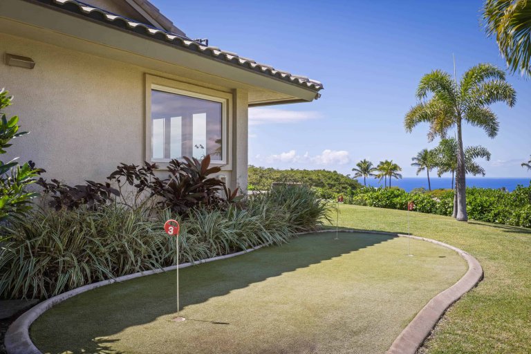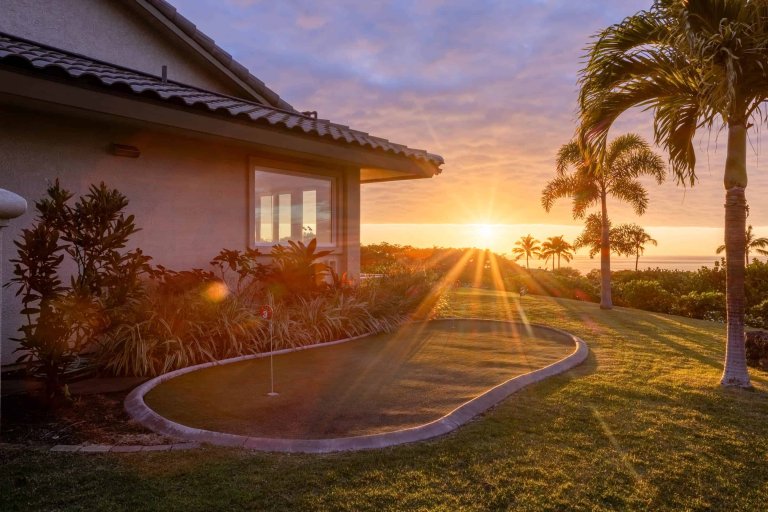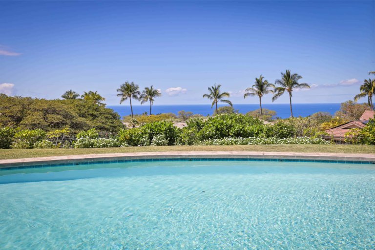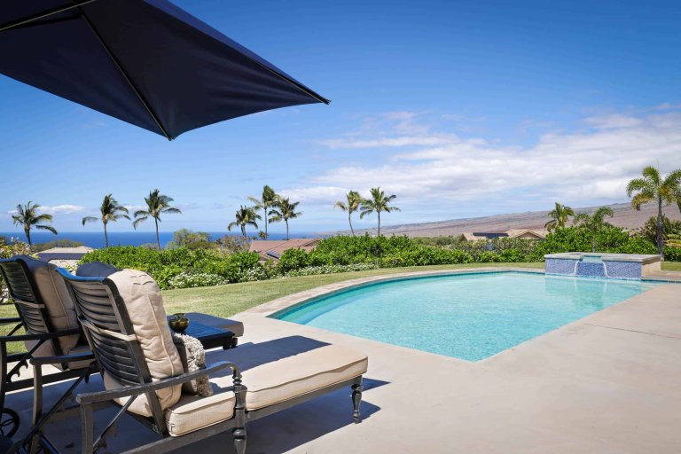 Set on a large corner lot, this magnificent, ‘upcountry’ oceanview residence offers a great room with glass doors for indoor/outdoor island living, courtyard, custom cabinetry and furniture, a chef’s kitchen outfitted with dishwashers and gas cooktop as well as a den with sleeper sofa. Additional features include air conditioning and ceiling fans, washer/dryer, an outdoor shower, private putting green, swimming pool, hot tub, furnished lanai with BBQ, plus a two-car garage. Guests will enjoy commanding golf, mountain and ocean views - from Kona Coast and Kawaihae Harbor. This residence is about 1 mile from the ocean.