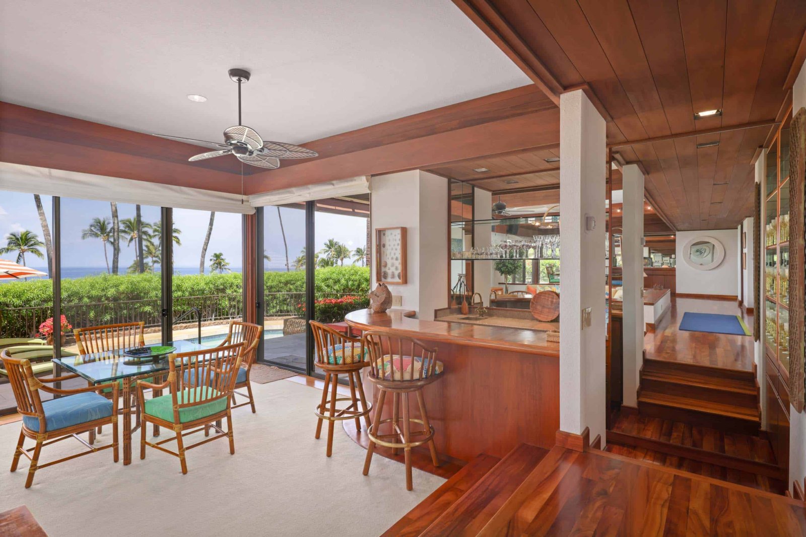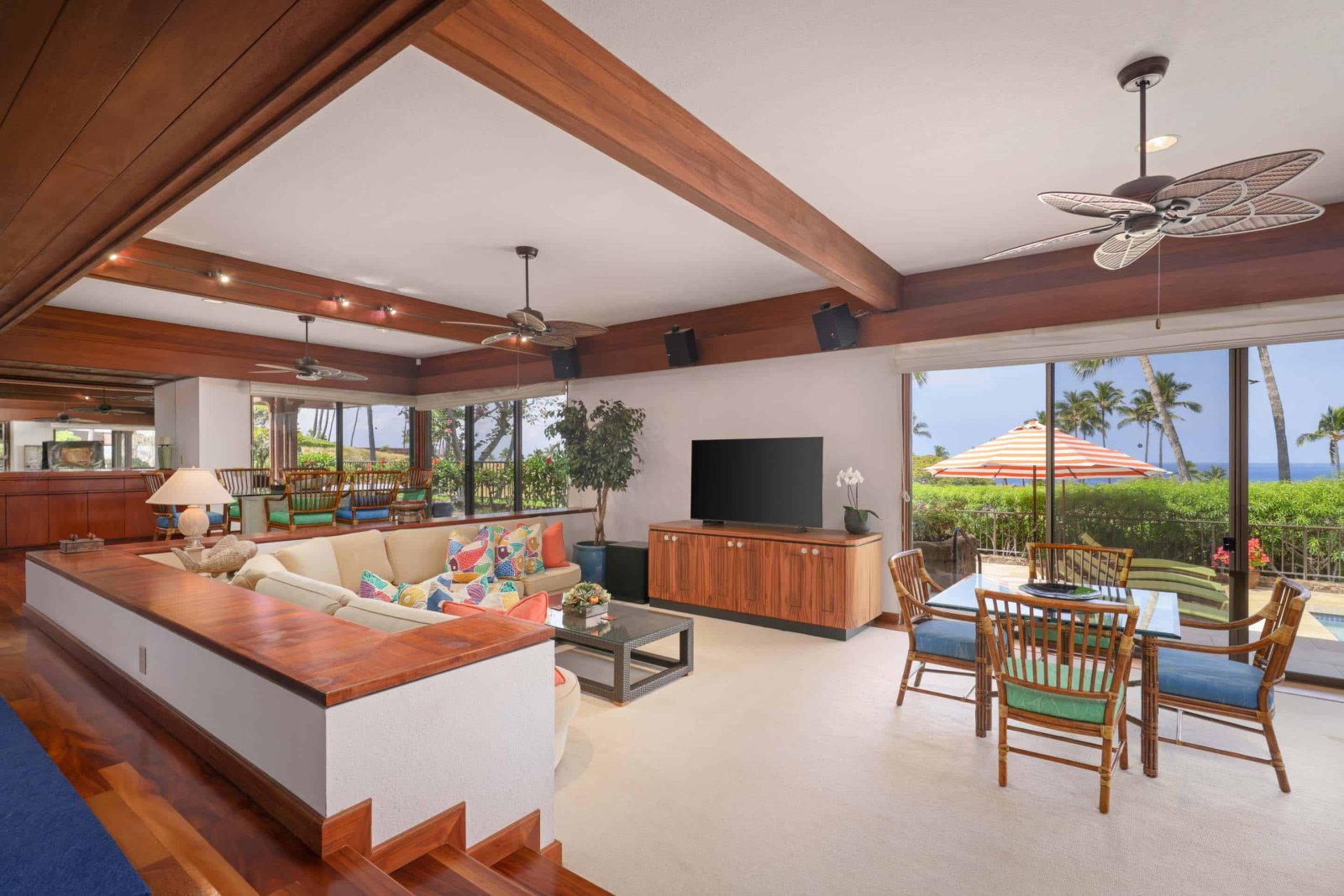 Within walking distance of Mauna Kea Resort, Mauna Kea Villas offers classic Hawaiian luxury with stunning ocean views and seamless indoor-outdoor living. This single-level residence features a sunken living room with a wet bar and sliding glass doors leading to a private deck with a pool and BBQ. The primary suite boasts a king bed and an ensuite bath. The secondary suite offers flexibility with two double beds and an ensuite bathroom. Additional amenities include air conditioning, a washer/dryer, and a private garage.