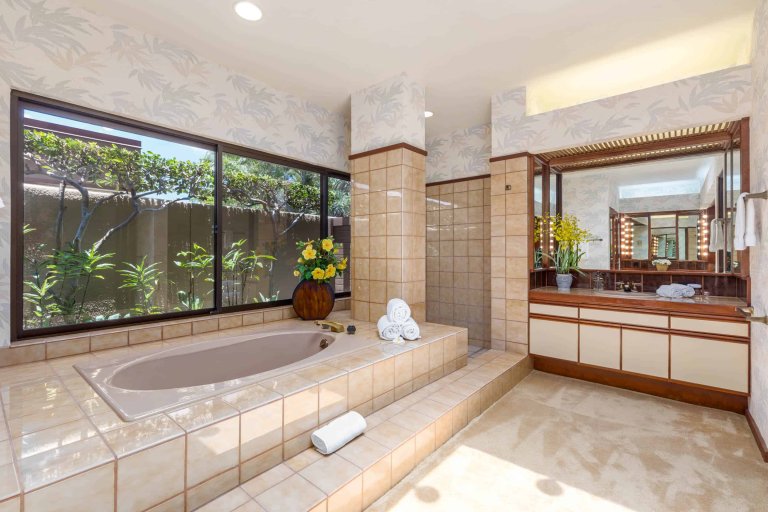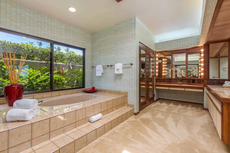 This dazzling, single-level, oceanfront estate offers a sunken living room with sliding glass pocket doors for indoor/outdoor island living and Sonos system, a chef’s kitchen with Wolf and Sub-Zero appliances/wine refrigerator, a dining area with adjoining wet bar, a master suite with an indoor/outdoor tub, a second suite with 2 queen beds. Additional features include solar panels, a laundry room, air conditioning and ceiling fans, a private swimming pool, and furnished lanai with BBQ. This residence is a 10-minute walk from the beach, golf and Mauna Kea Beach Hotel.