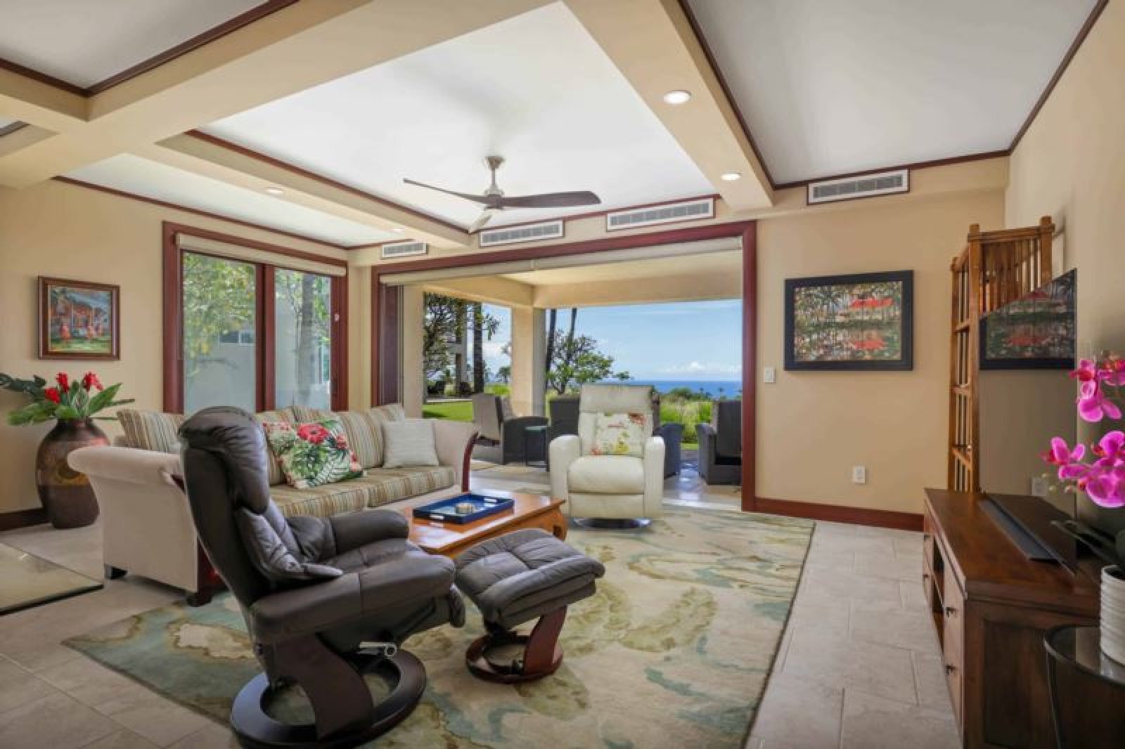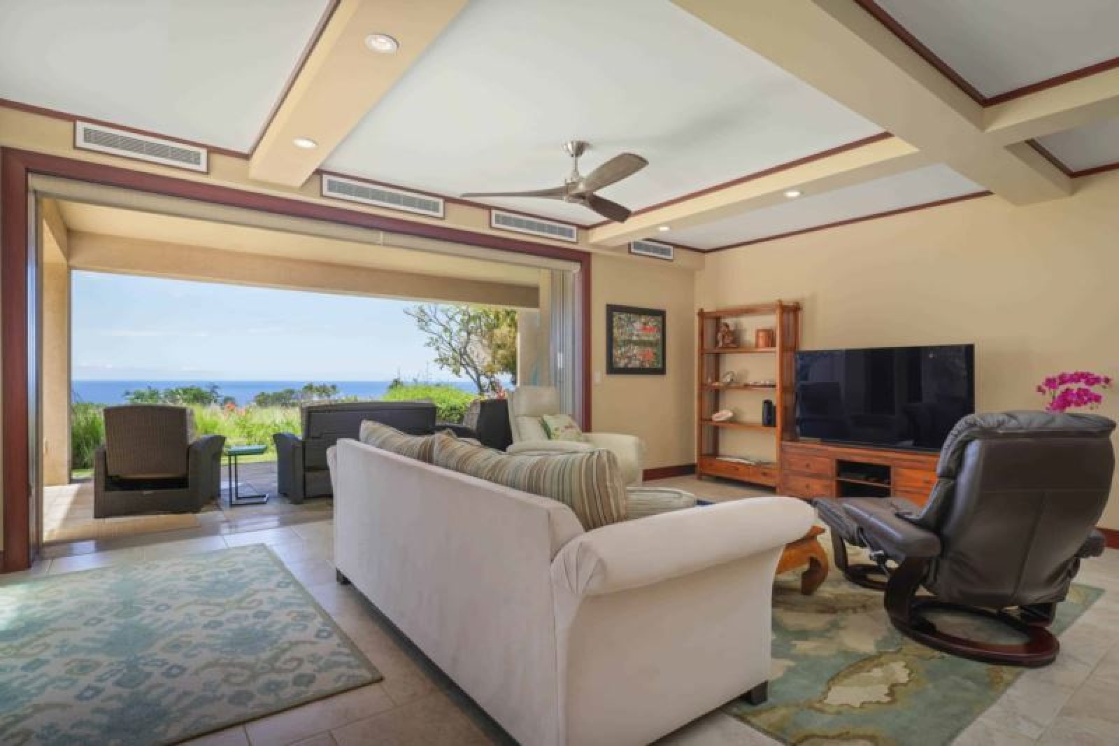 This magnificent, ground-level, oceanview residence offers a great room with sliding glass pocket doors for indoor/outdoor island living, a chef’s kitchen outfitted with stainless steel gas range/appliances, granite countertops and wine refrigerator, as well as a dining table for six, Additional features include dual guest suites, each with a lavish, attached bathroom (the first has a Cal king bed, the second has a king bed, the third bedroom has a queen), air conditioning and ceiling fans, washer/dryer, wine refrigerator and a furnished lanai with a Wolf outdoor kitchen (BBQ, refrigerator). This residence is about 1 mile from the ocean. Guests will enjoy ocean, golf and mountain views, resort charging privileges and access to Hale Ikena Recreation Center, which is walking distance from this residence.