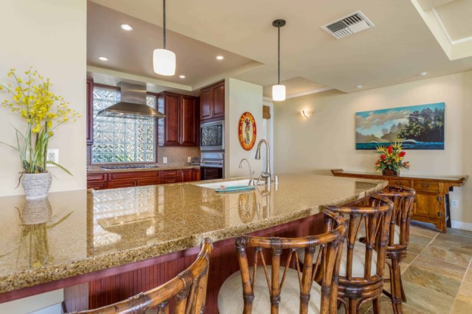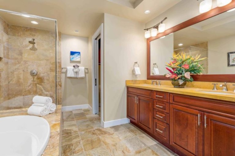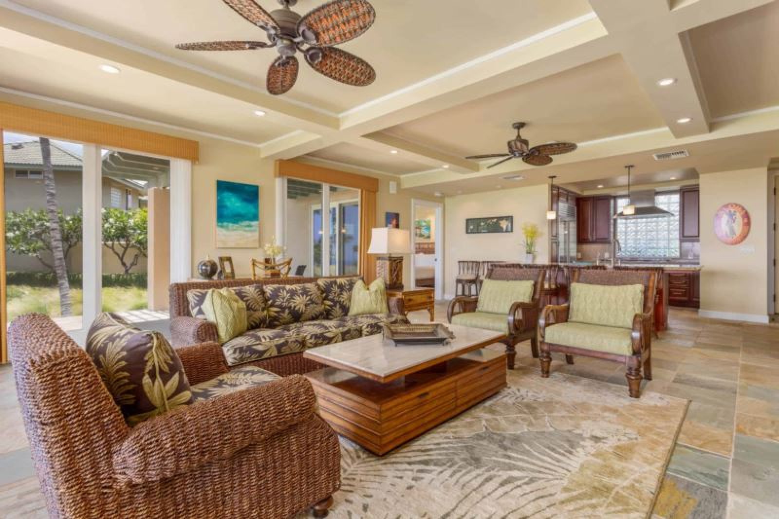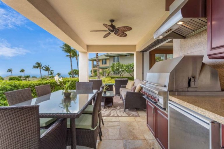 This ground-level, corner, oceanview residence offers a great room with sliding glass pocket doors for indoor/outdoor island living, a chef’s kitchen outfitted with Sub-Zero and Wolf appliances/gas range and dual master suites. Additional features include air conditioning and ceiling fans, washer/dryer, a furnished, wrap around lanai with Wolf outdoor kitchen (BBQ, refrigerator) and one-car garage. This residence is about 1 mile from the ocean. Guests will enjoy ocean, golf and mountain views, resort charging privileges and access to Hale Ikena Recreation Center, which is walking distance from this residence.