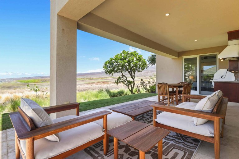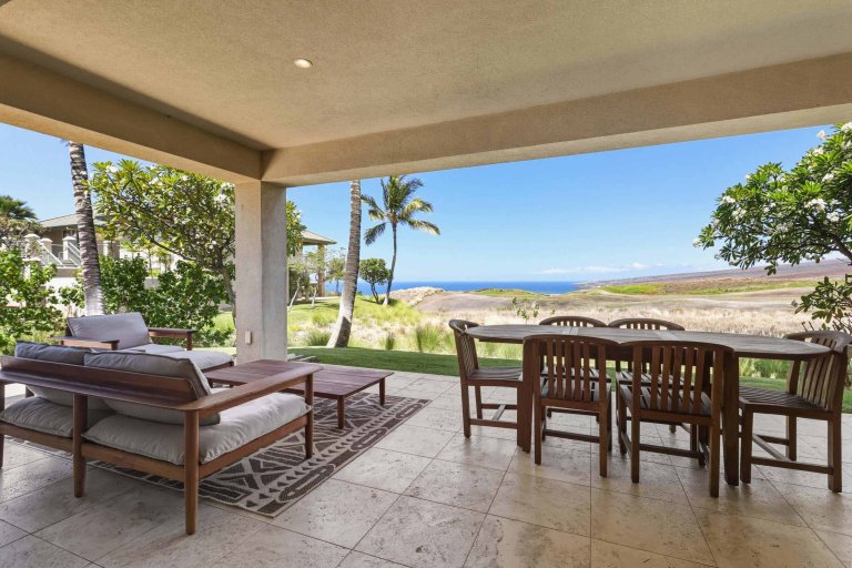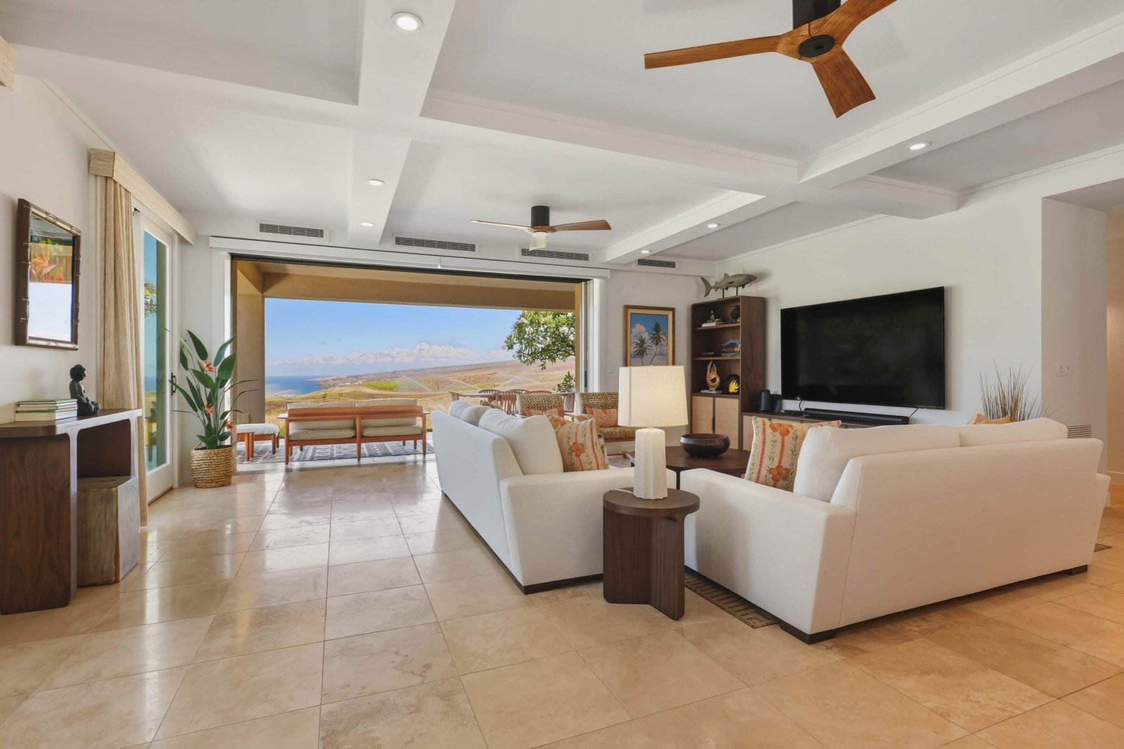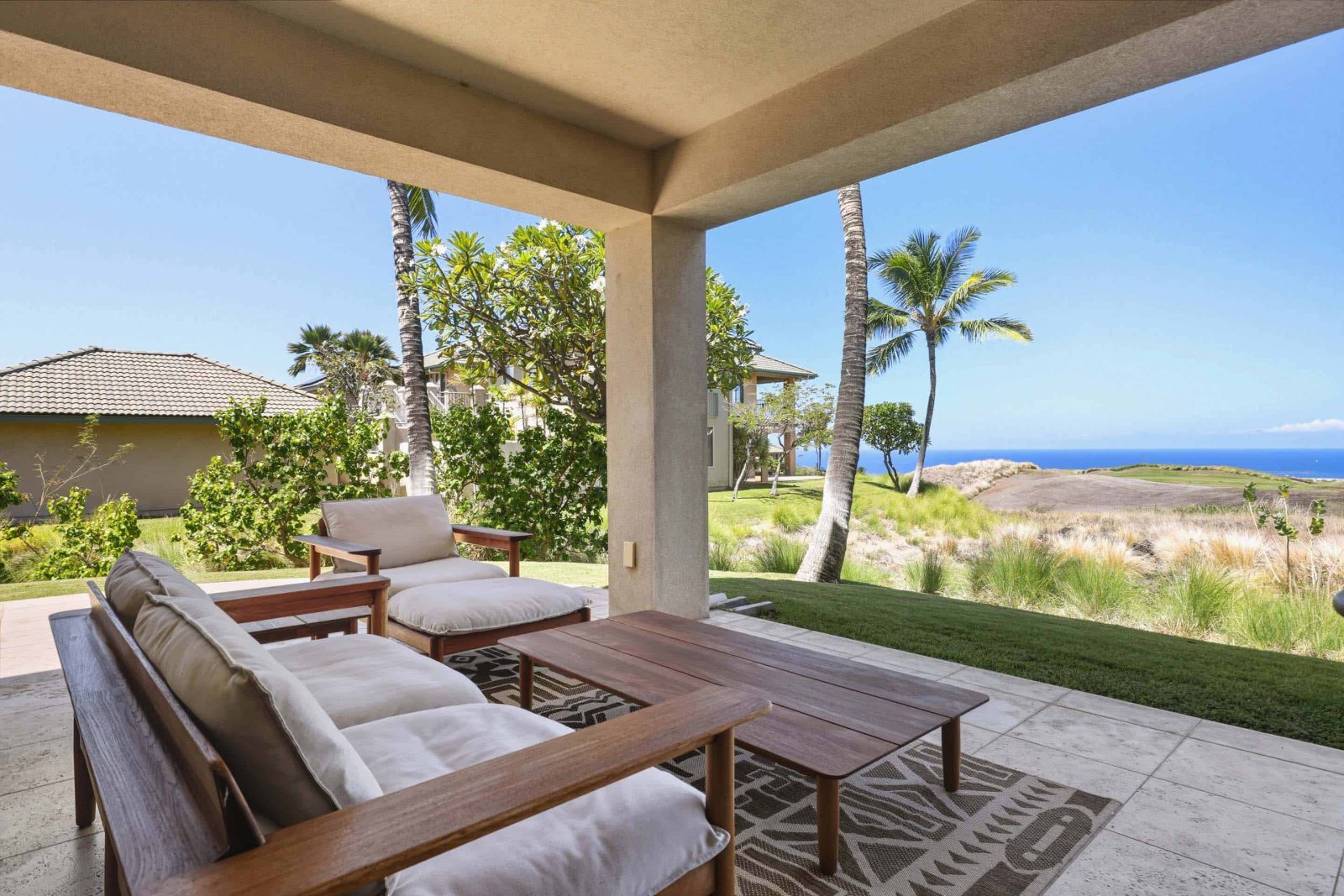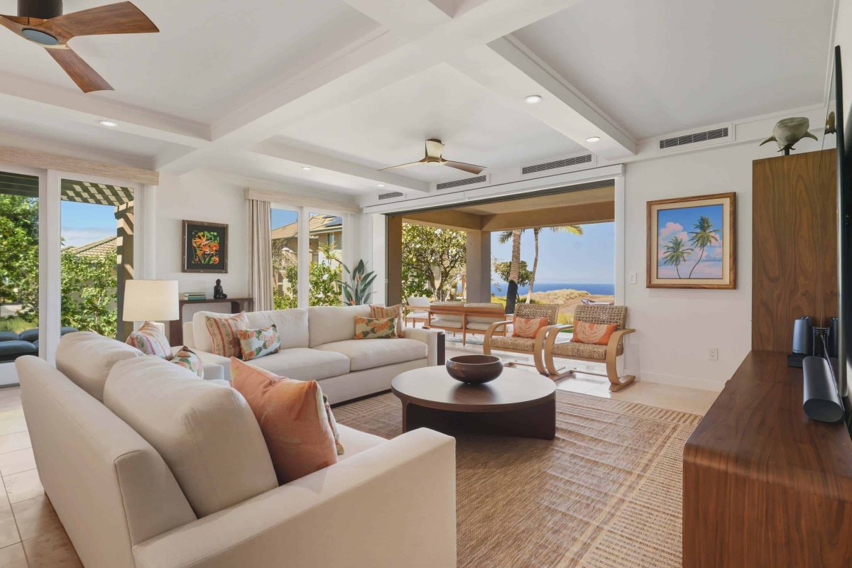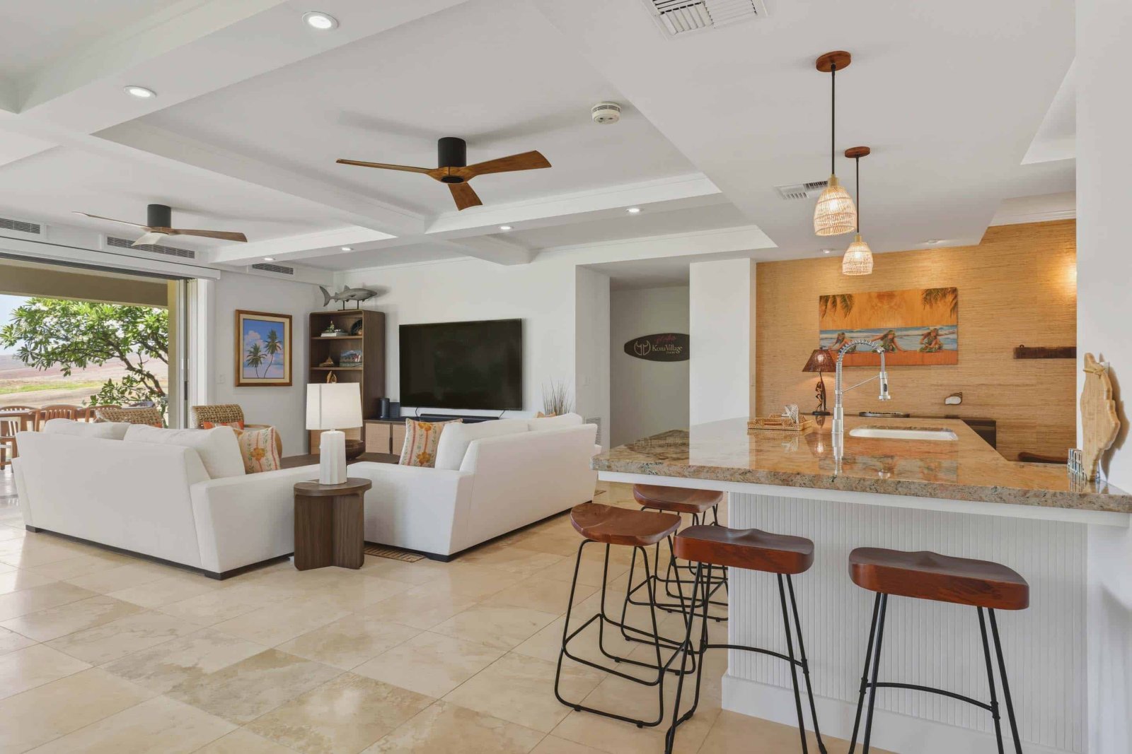 Perched in the uplands of the prestigious Mauna Kea Resort, this stunning villa offers sweeping views of the Kohala Coast, where breathtaking sunsets and lush golf course vistas create an unforgettable backdrop. Designed for seamless indoor-outdoor living, the home features an expansive covered lanai with ample seating and an open-concept living space—perfect for relaxing or entertaining. Inside, the inviting living room opens to a fully equipped kitchen and bar area with seating for eight, making hosting effortless. The villa offers three beautifully appointed suites: the primary suite includes a king-size bed, spa tub, and separate walk-in shower; the second suite features a king-size bed, dual vanity, soaking tub, and large walk-in shower; and the third bedroom provides flexibility with a king bed and twin bunk, plus access to a full hallway bathroom with a walk-in shower. Additional amenities include a laundry room, air conditioning, and ceiling fans throughout, ensuring comfort and convenience in this luxurious island retreat.