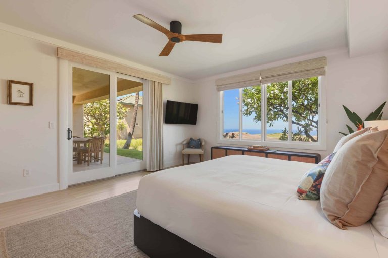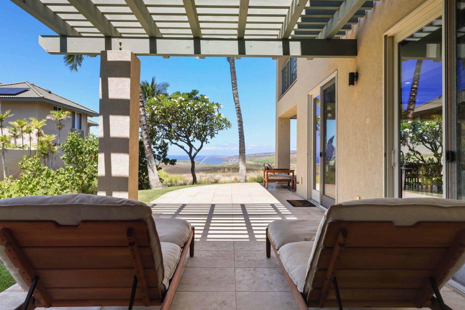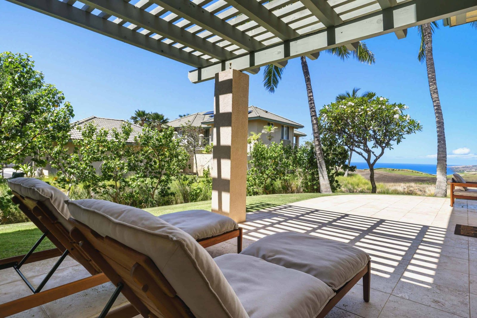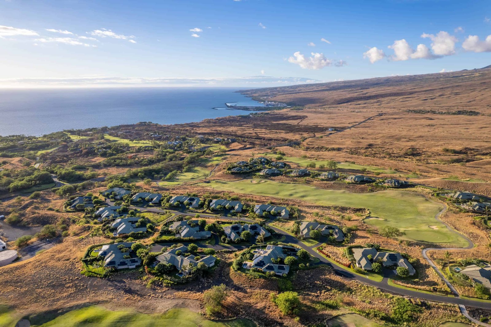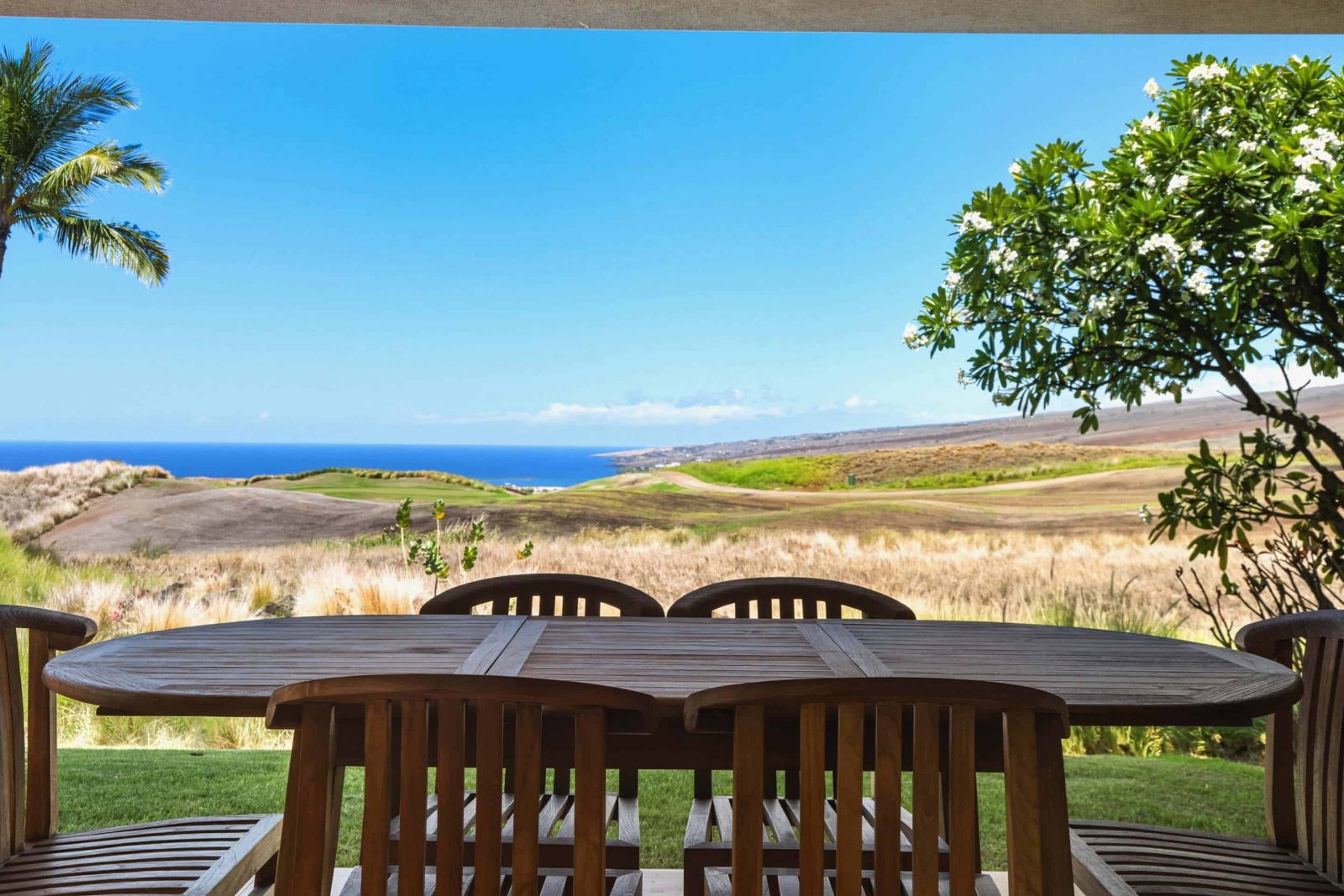 Perched in the uplands of the prestigious Mauna Kea Resort, this stunning villa offers sweeping views of the Kohala Coast, where breathtaking sunsets and lush golf course vistas create an unforgettable backdrop. Designed for seamless indoor-outdoor living, the home features an expansive covered lanai with ample seating and an open-concept living space—perfect for relaxing or entertaining. Inside, the inviting living room opens to a fully equipped kitchen and bar area with seating for eight, making hosting effortless. The villa offers three beautifully appointed suites: the primary suite includes a king-size bed, spa tub, and separate walk-in shower; the second suite features a king-size bed, dual vanity, soaking tub, and large walk-in shower; and the third bedroom provides flexibility with a king bed and twin bunk, plus access to a full hallway bathroom with a walk-in shower. Additional amenities include a laundry room, air conditioning, and ceiling fans throughout, ensuring comfort and convenience in this luxurious island retreat.