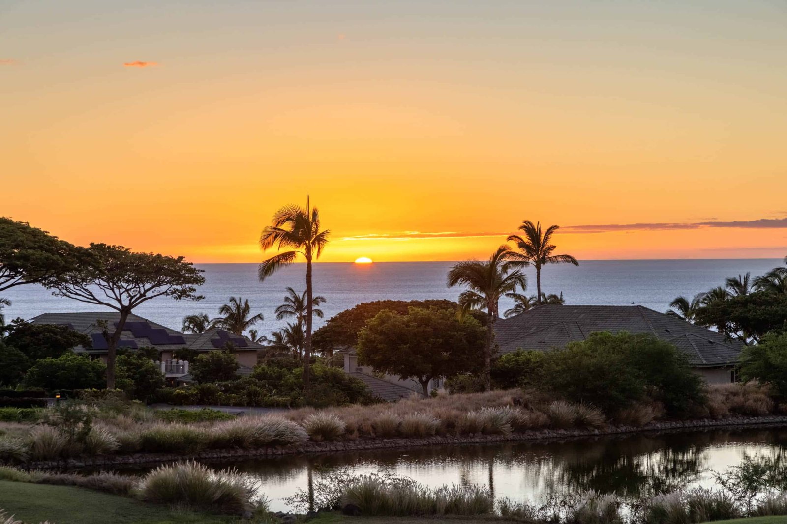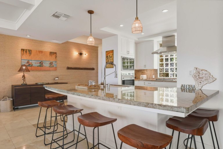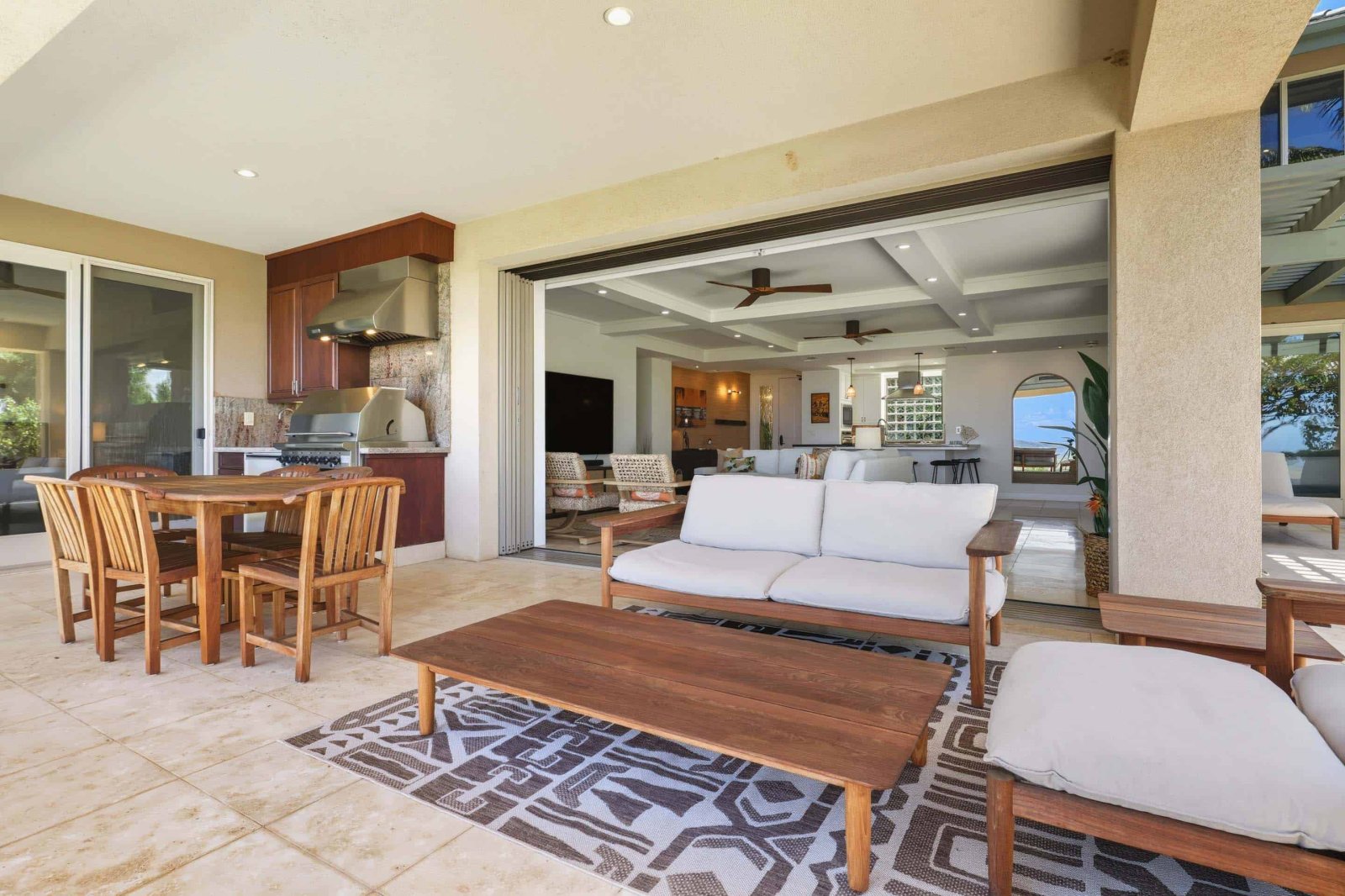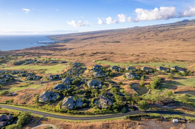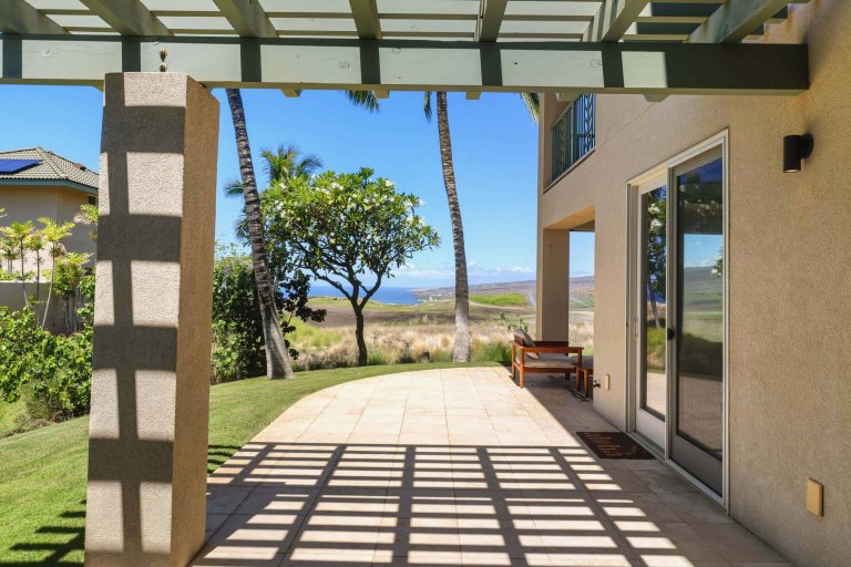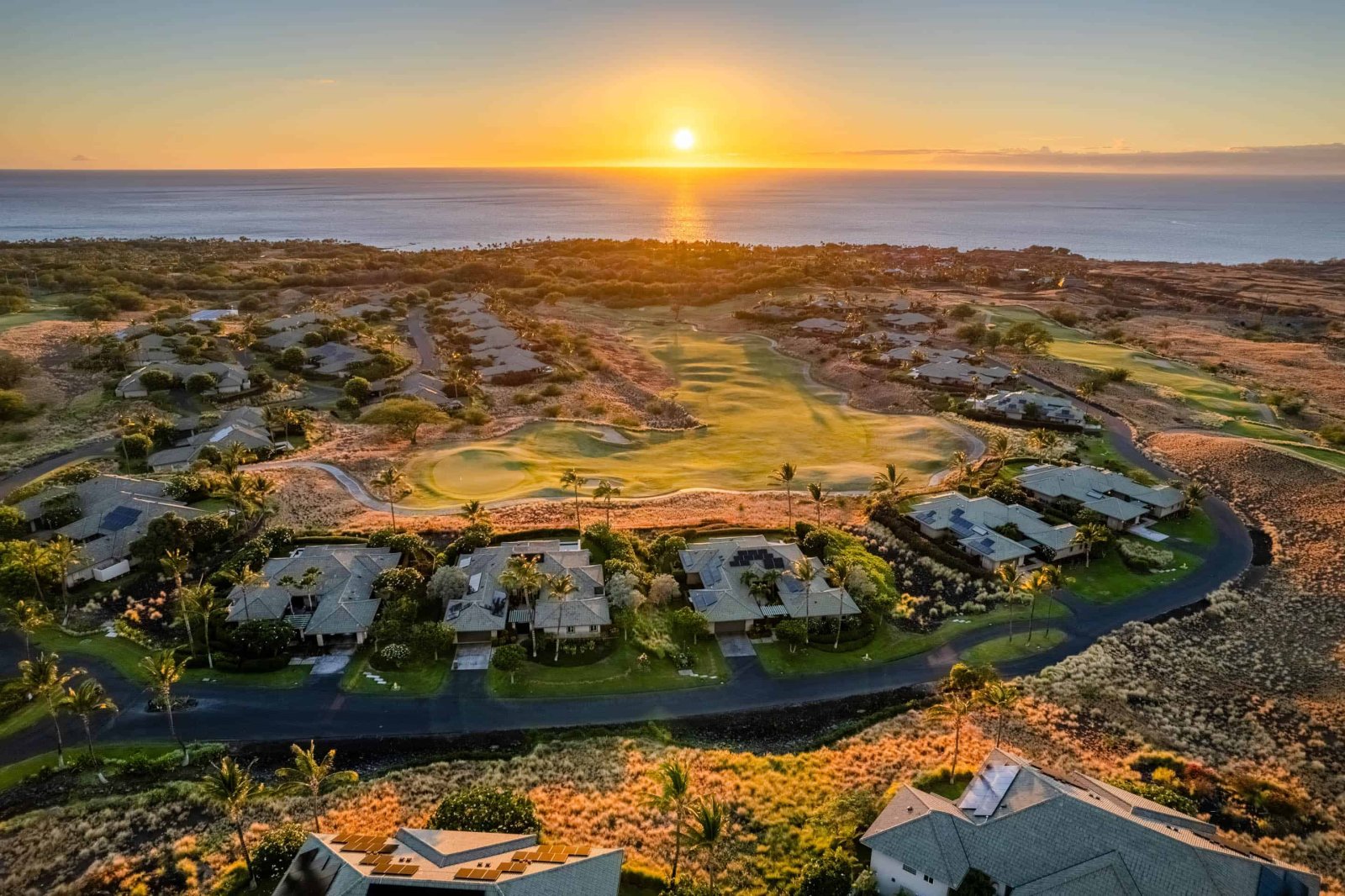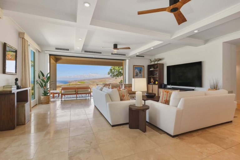 Perched in the uplands of the prestigious Mauna Kea Resort, this stunning villa offers sweeping views of the Kohala Coast, where breathtaking sunsets and lush golf course vistas create an unforgettable backdrop. Designed for seamless indoor-outdoor living, the home features an expansive covered lanai with ample seating and an open-concept living space—perfect for relaxing or entertaining. Inside, the inviting living room opens to a fully equipped kitchen and bar area with seating for eight, making hosting effortless. The villa offers three beautifully appointed suites: the primary suite includes a king-size bed, spa tub, and separate walk-in shower; the second suite features a king-size bed, dual vanity, soaking tub, and large walk-in shower; and the third bedroom provides flexibility with a king bed and twin bunk, plus access to a full hallway bathroom with a walk-in shower. Additional amenities include a laundry room, air conditioning, and ceiling fans throughout, ensuring comfort and convenience in this luxurious island retreat.