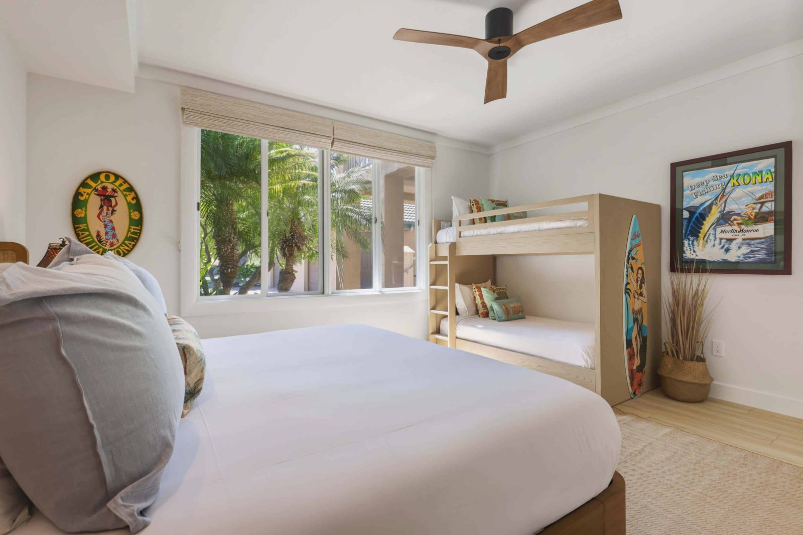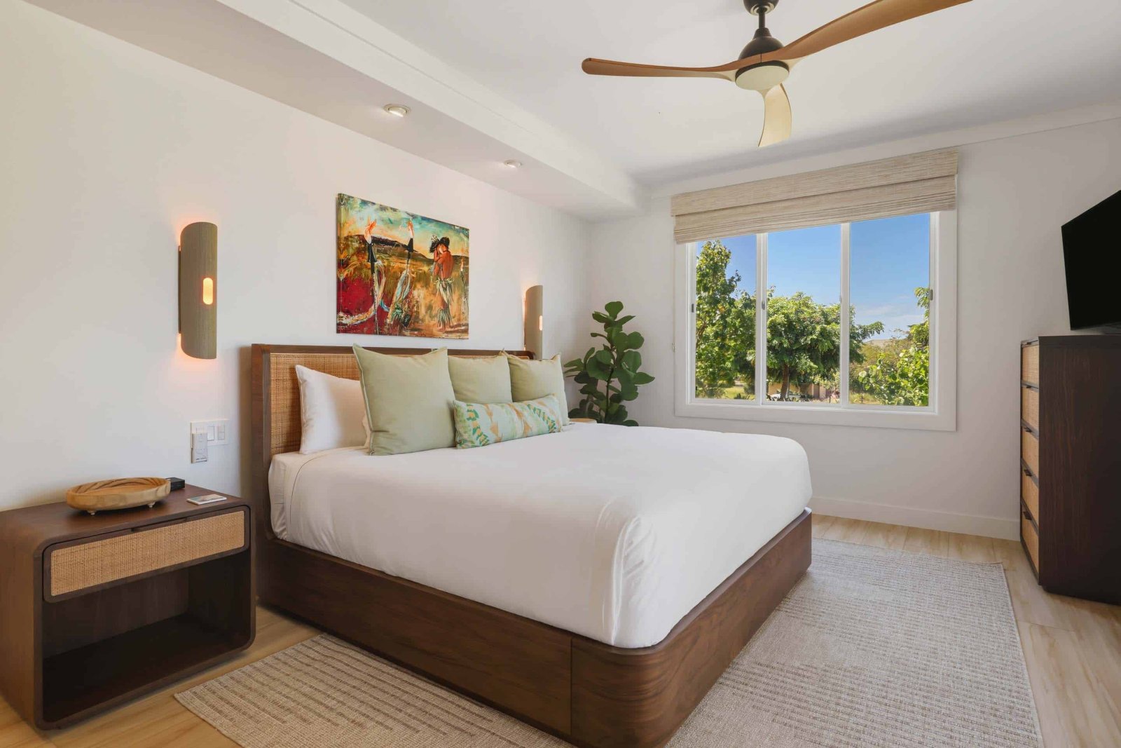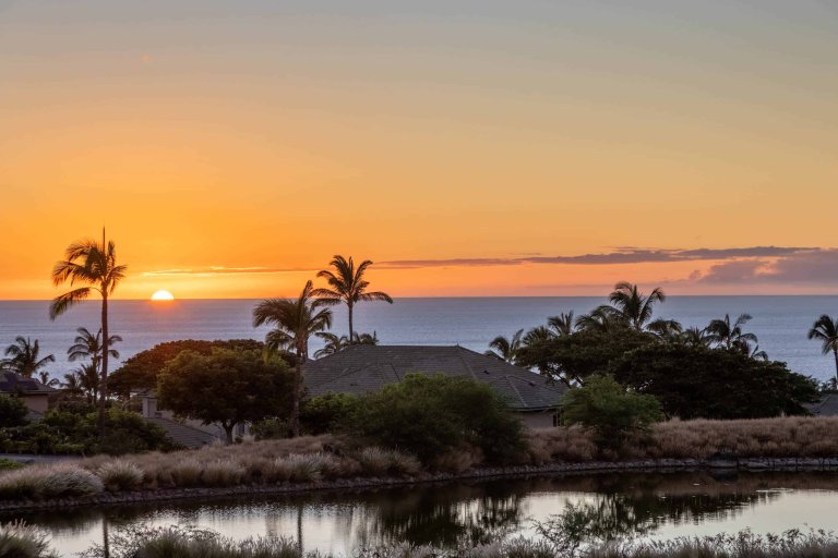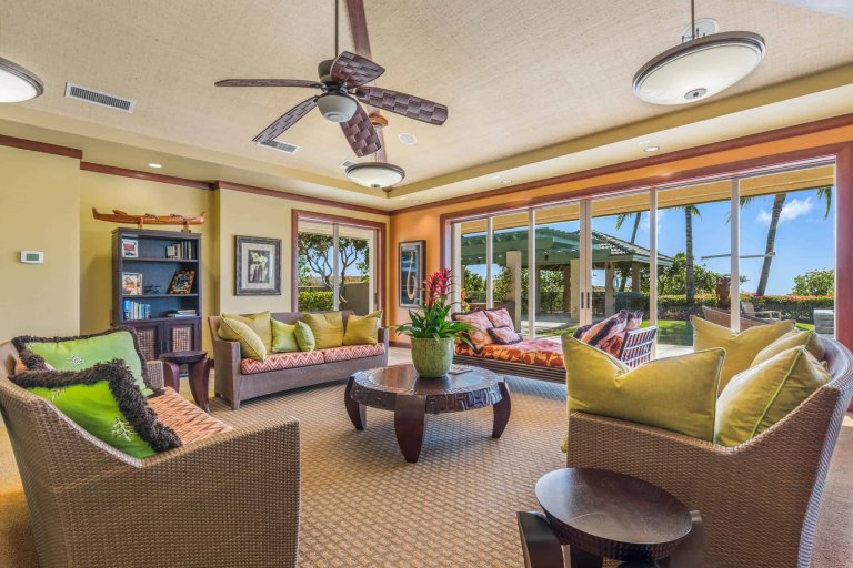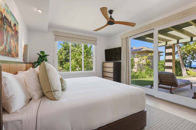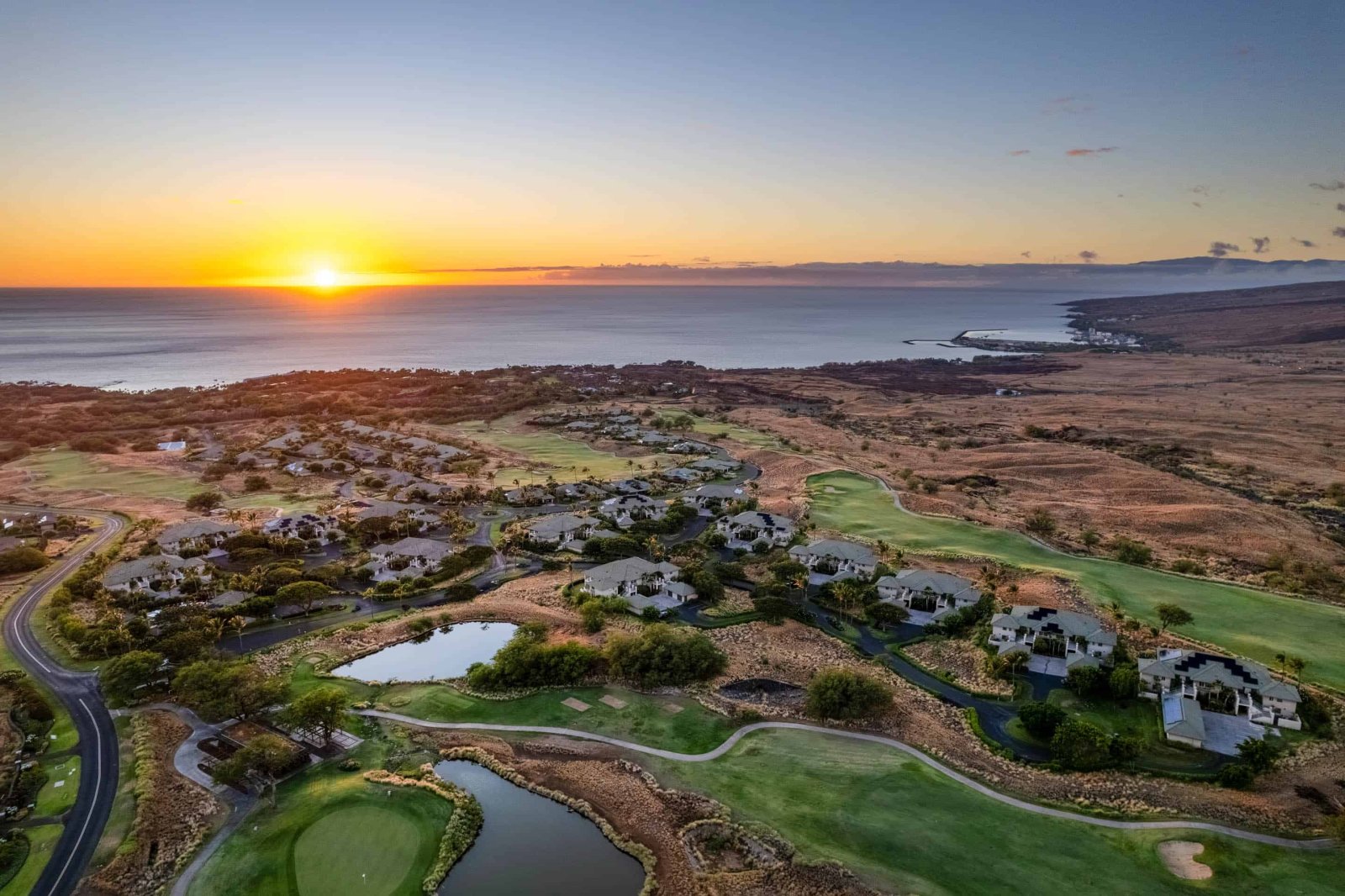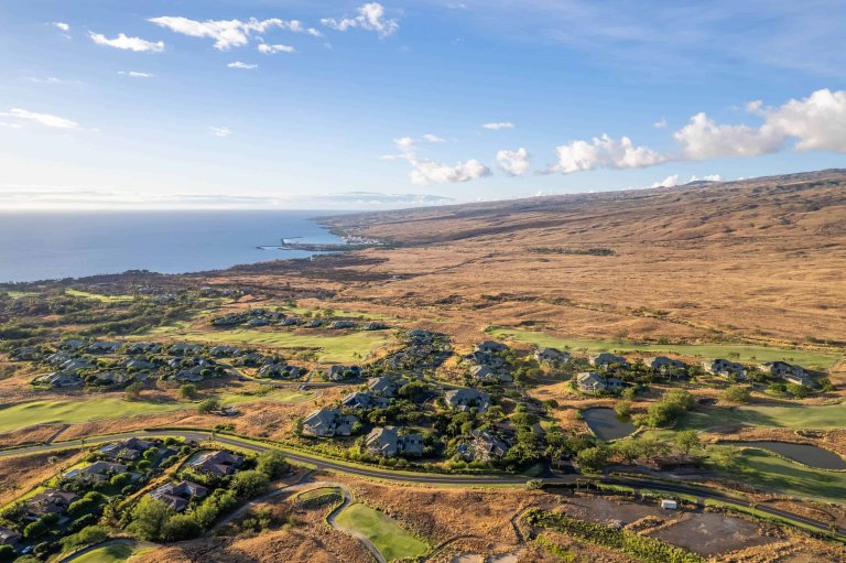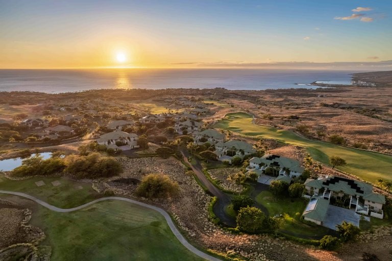 Perched in the uplands of the prestigious Mauna Kea Resort, this stunning villa offers sweeping views of the Kohala Coast, where breathtaking sunsets and lush golf course vistas create an unforgettable backdrop. Designed for seamless indoor-outdoor living, the home features an expansive covered lanai with ample seating and an open-concept living space—perfect for relaxing or entertaining. Inside, the inviting living room opens to a fully equipped kitchen and bar area with seating for eight, making hosting effortless. The villa offers three beautifully appointed suites: the primary suite includes a king-size bed, spa tub, and separate walk-in shower; the second suite features a king-size bed, dual vanity, soaking tub, and large walk-in shower; and the third bedroom provides flexibility with a king bed and twin bunk, plus access to a full hallway bathroom with a walk-in shower. Additional amenities include a laundry room, air conditioning, and ceiling fans throughout, ensuring comfort and convenience in this luxurious island retreat.