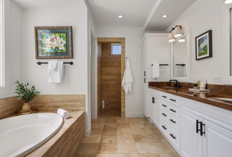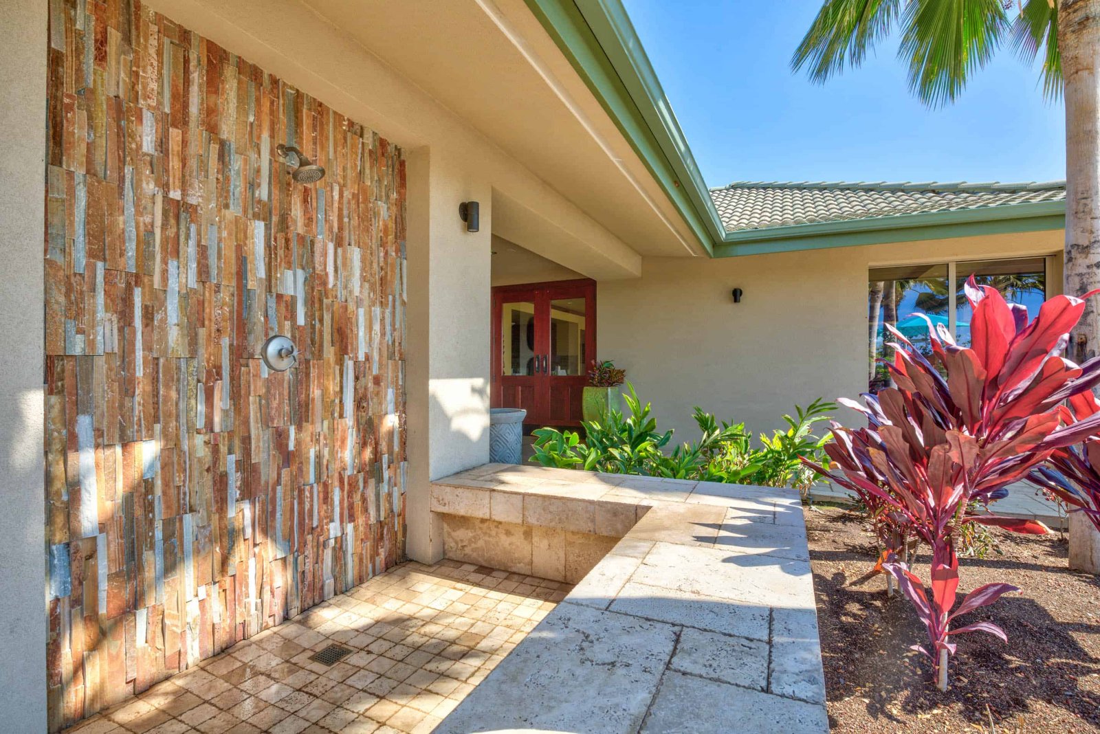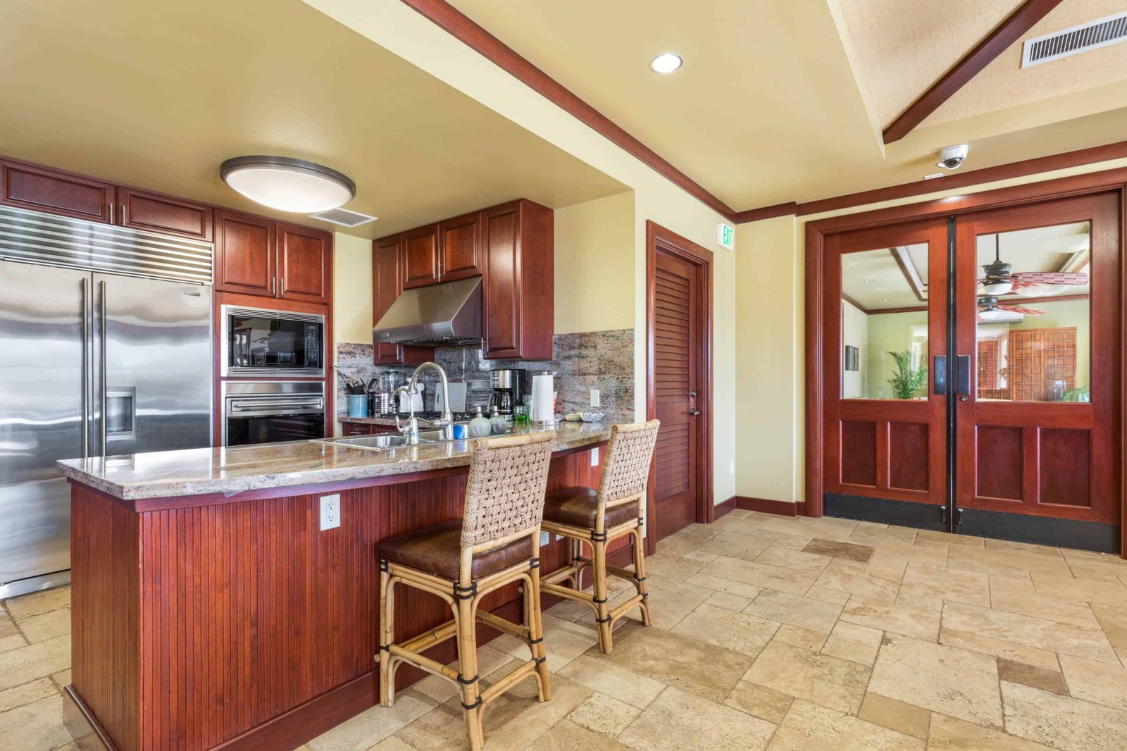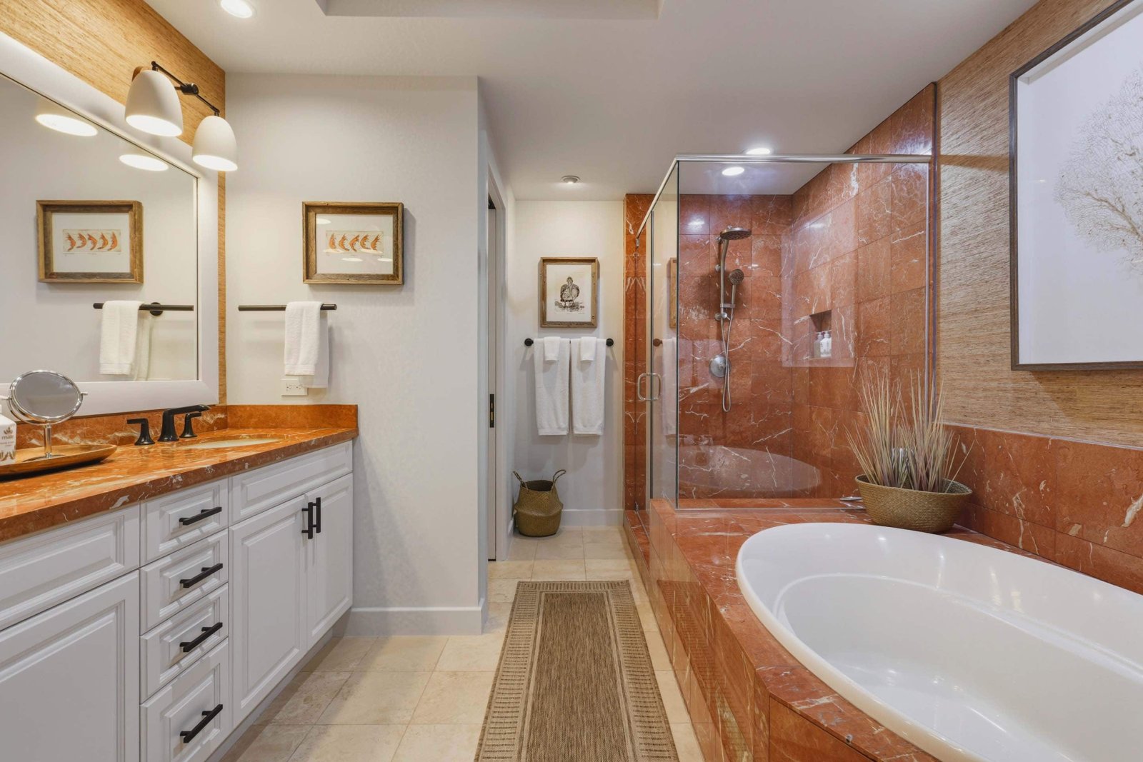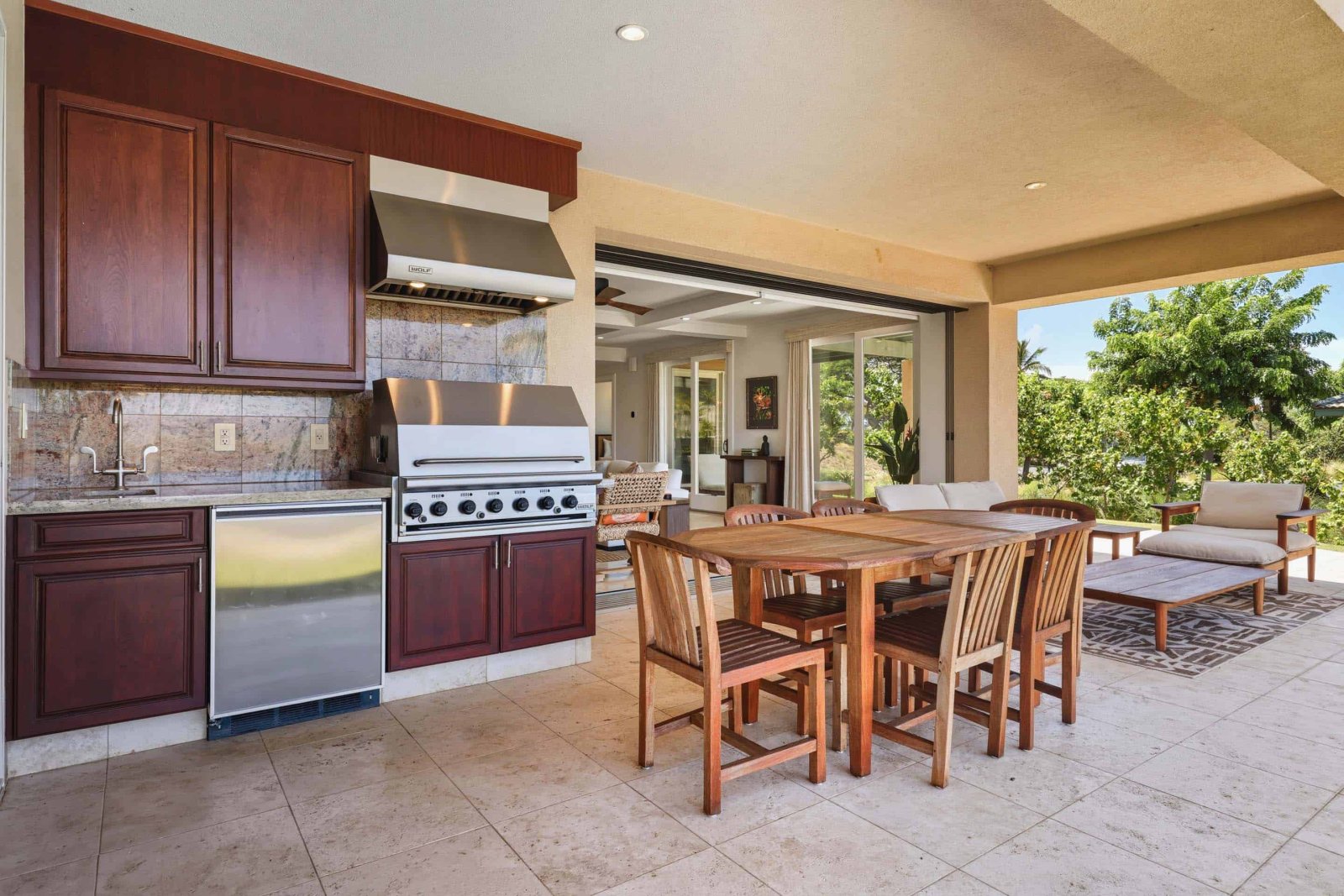 Perched in the uplands of the prestigious Mauna Kea Resort, this stunning villa offers sweeping views of the Kohala Coast, where breathtaking sunsets and lush golf course vistas create an unforgettable backdrop. Designed for seamless indoor-outdoor living, the home features an expansive covered lanai with ample seating and an open-concept living space—perfect for relaxing or entertaining. Inside, the inviting living room opens to a fully equipped kitchen and bar area with seating for eight, making hosting effortless. The villa offers three beautifully appointed suites: the primary suite includes a king-size bed, spa tub, and separate walk-in shower; the second suite features a king-size bed, dual vanity, soaking tub, and large walk-in shower; and the third bedroom provides flexibility with a king bed and twin bunk, plus access to a full hallway bathroom with a walk-in shower. Additional amenities include a laundry room, air conditioning, and ceiling fans throughout, ensuring comfort and convenience in this luxurious island retreat.