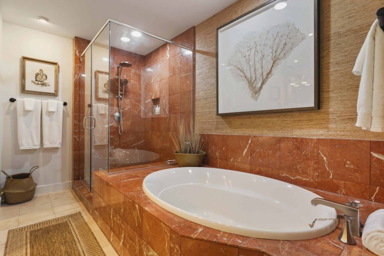 Bed: King Bed • En-Suite Bath with Walk-In Shower, Bathtub and Dual Vanity • TV • Ceiling Fan • Direct Access to Terrace • Ocean View *