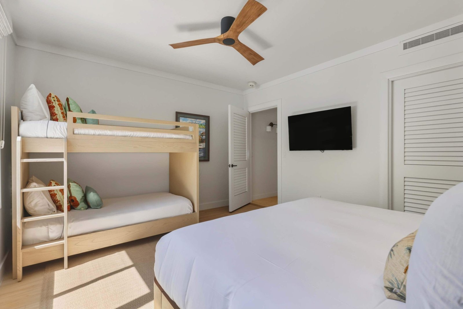 Bed: King Bed • Bed: Twin Bunk Bed • En-Suite Bath with Walk-In Shower • TV • Ceiling Fan