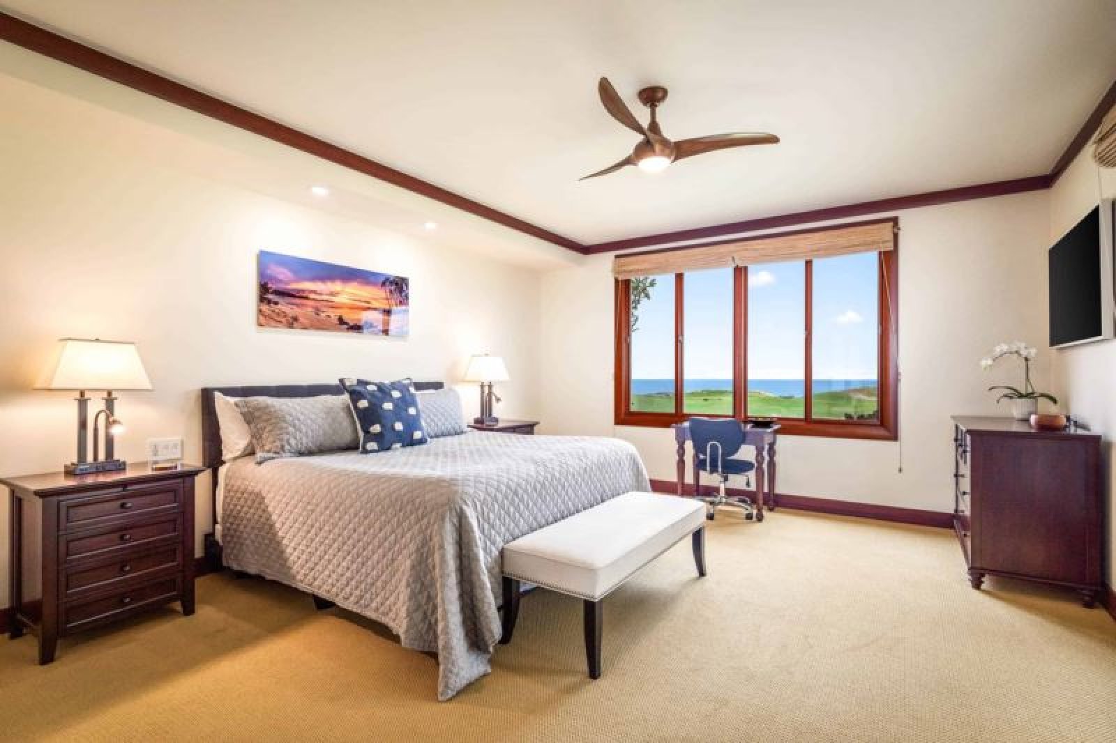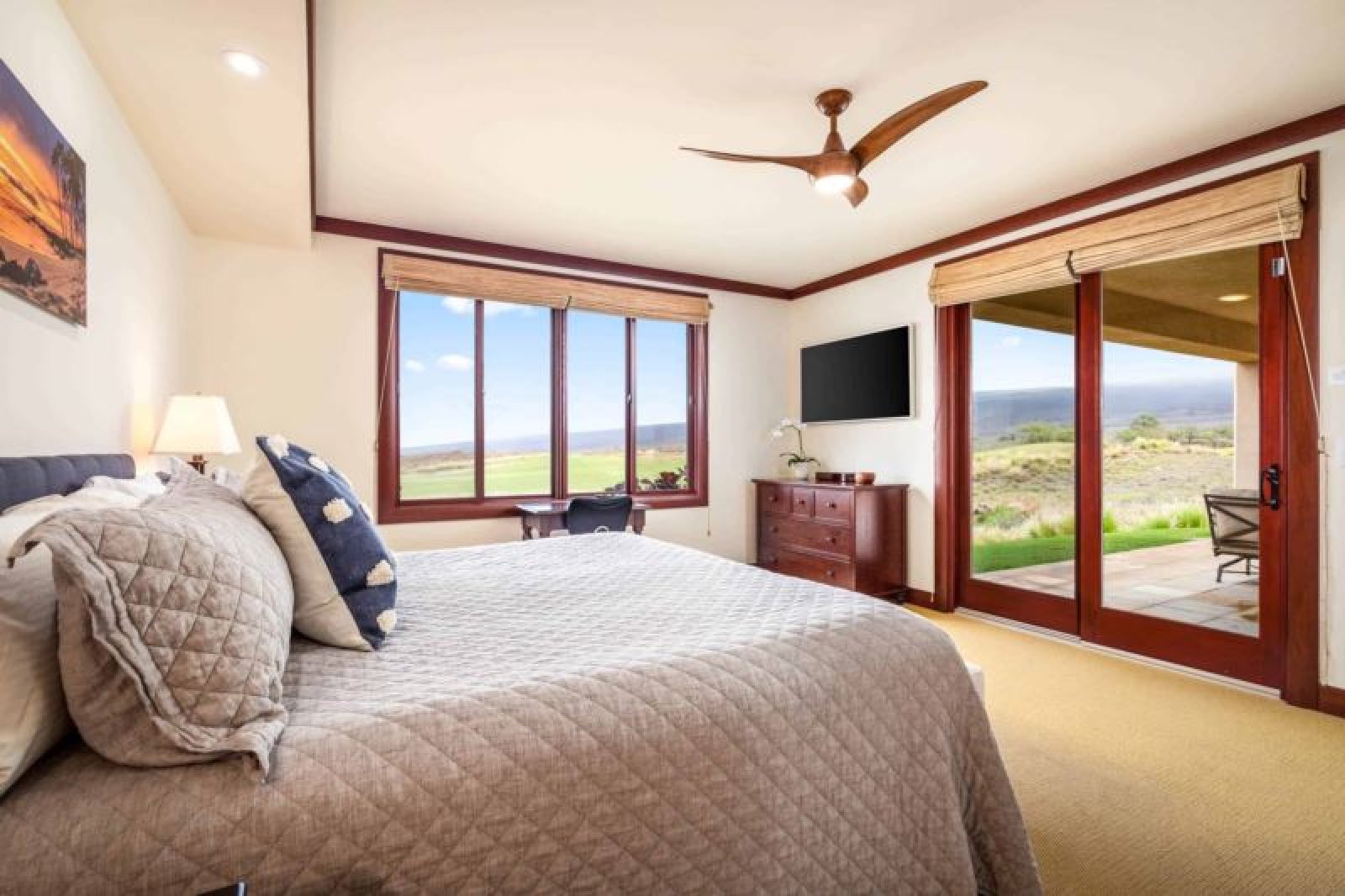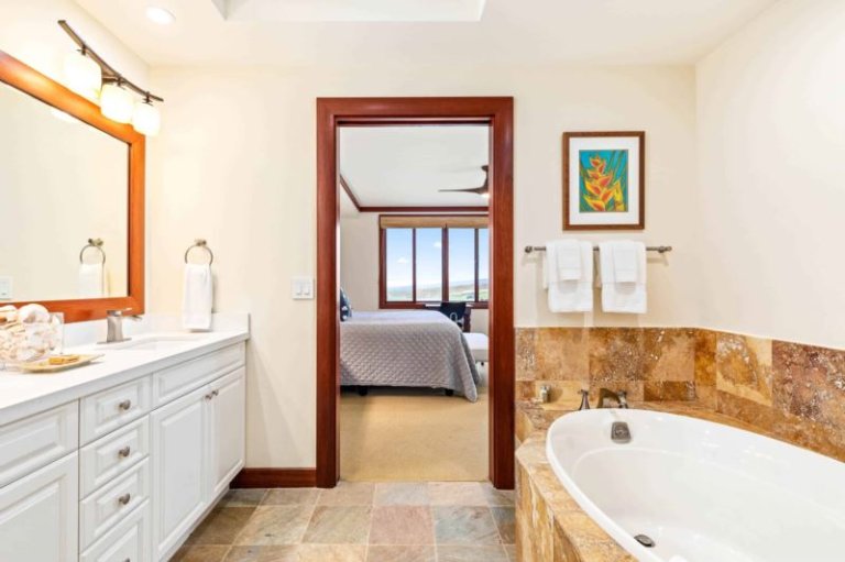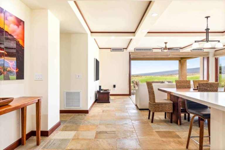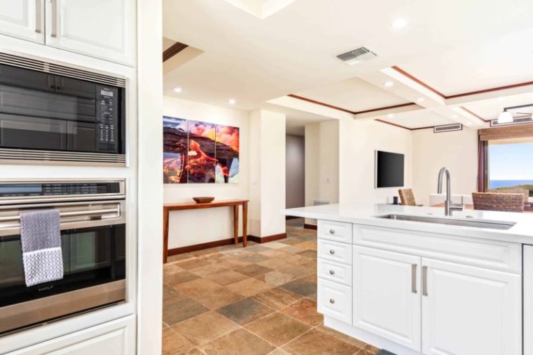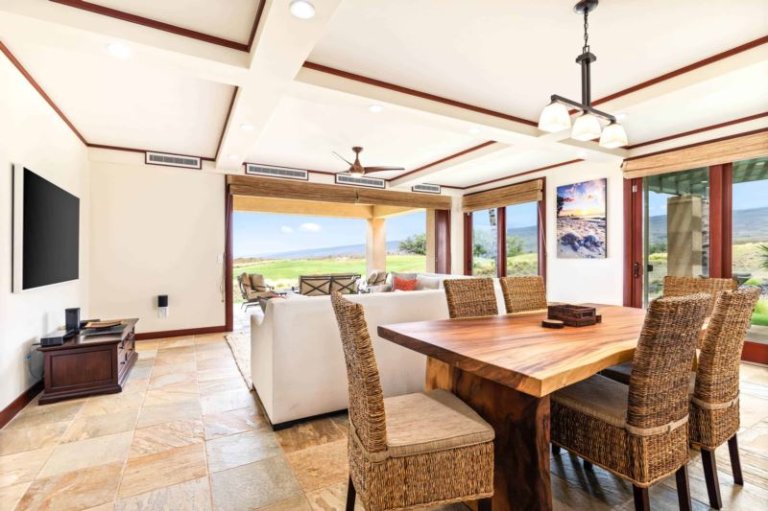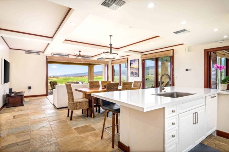 This beautifully-renovated, ground-level residence is adjacent to Hapuna Golf Course’s 11th fairway and showcases breathtaking, unobstructed ocean and mountains views within an ultra-spacious, corner layout (sleeps 10). Re-imagined by renowned designer Michele Turner, this home’s sliding glass walls provide indoor/outdoor island living while the luxe kitchen is outfitted with a Sub-Zero gas range and Wolf appliances. Savor a meal on the custom, monkey pod wood dining table. There are three guest suites, two with ocean vistas, a king size bed and attached bathroom with a rain shower and oversized bathtub; the third hosts a queen size bed. Additional features include a furnished, wrap around lanai with Wolf outdoor kitchen (BBQ, refrigerator), artwork from world-famous, local photographer C.J. Kale, a sleeper sofa, twin pull out ottomans, washer/dryer, Daikin air conditioners, and a one-car garage with extra parking. This residence is less than 1 mile from the ocean. Guests will enjoy resort charging privileges plus rare access to Hale Ikena Recreation Center, just a short walk from this residence.