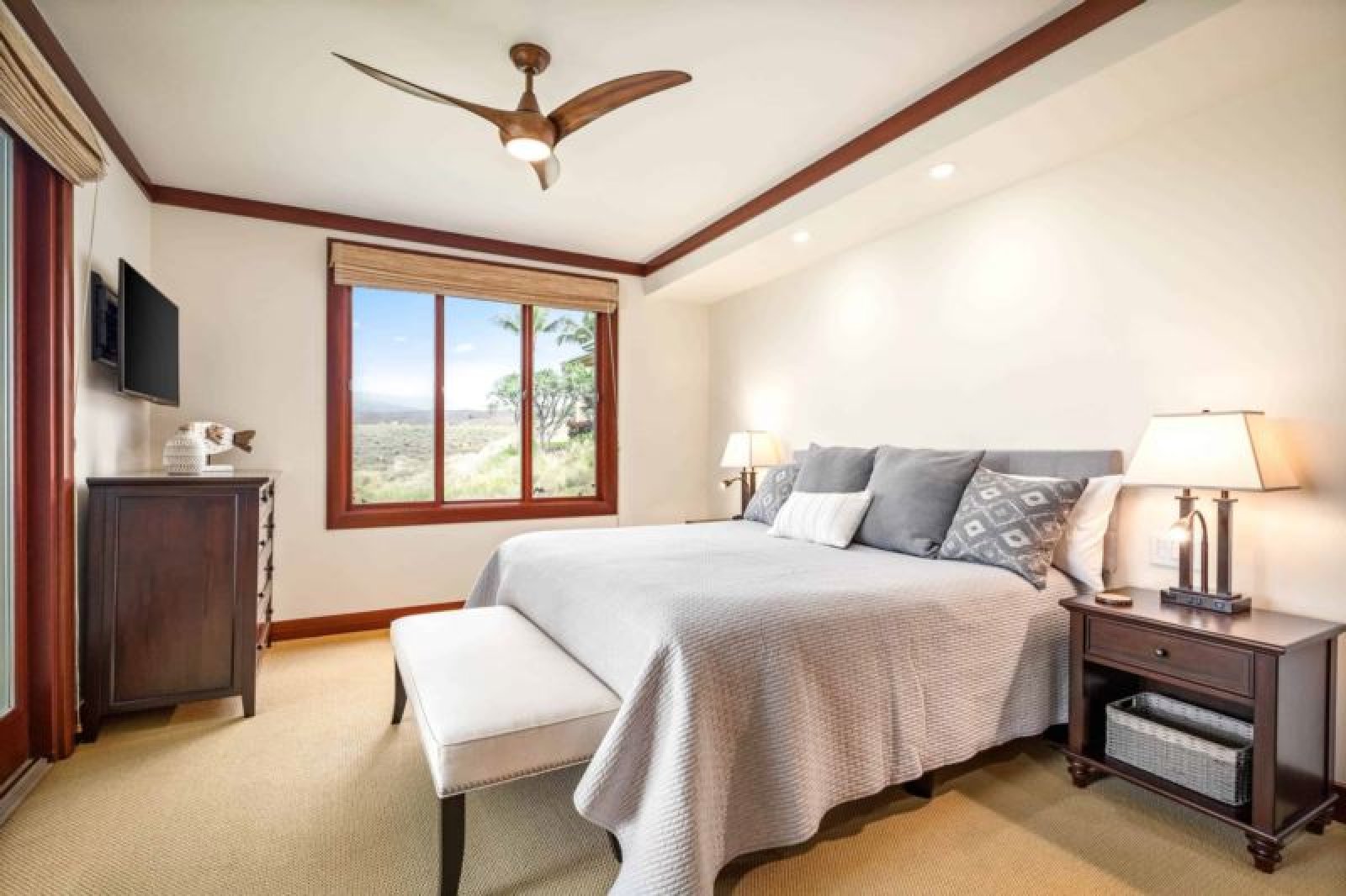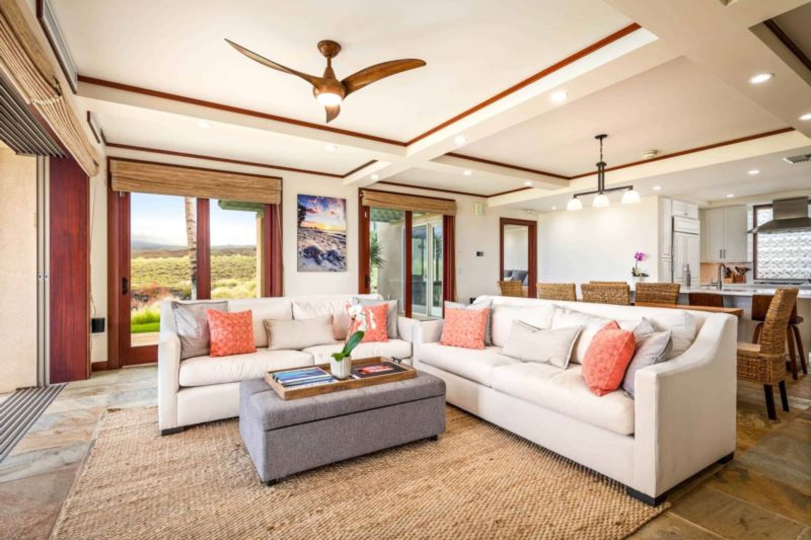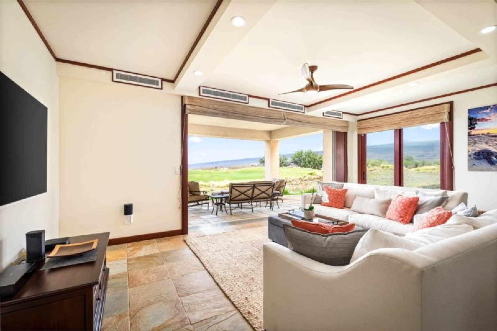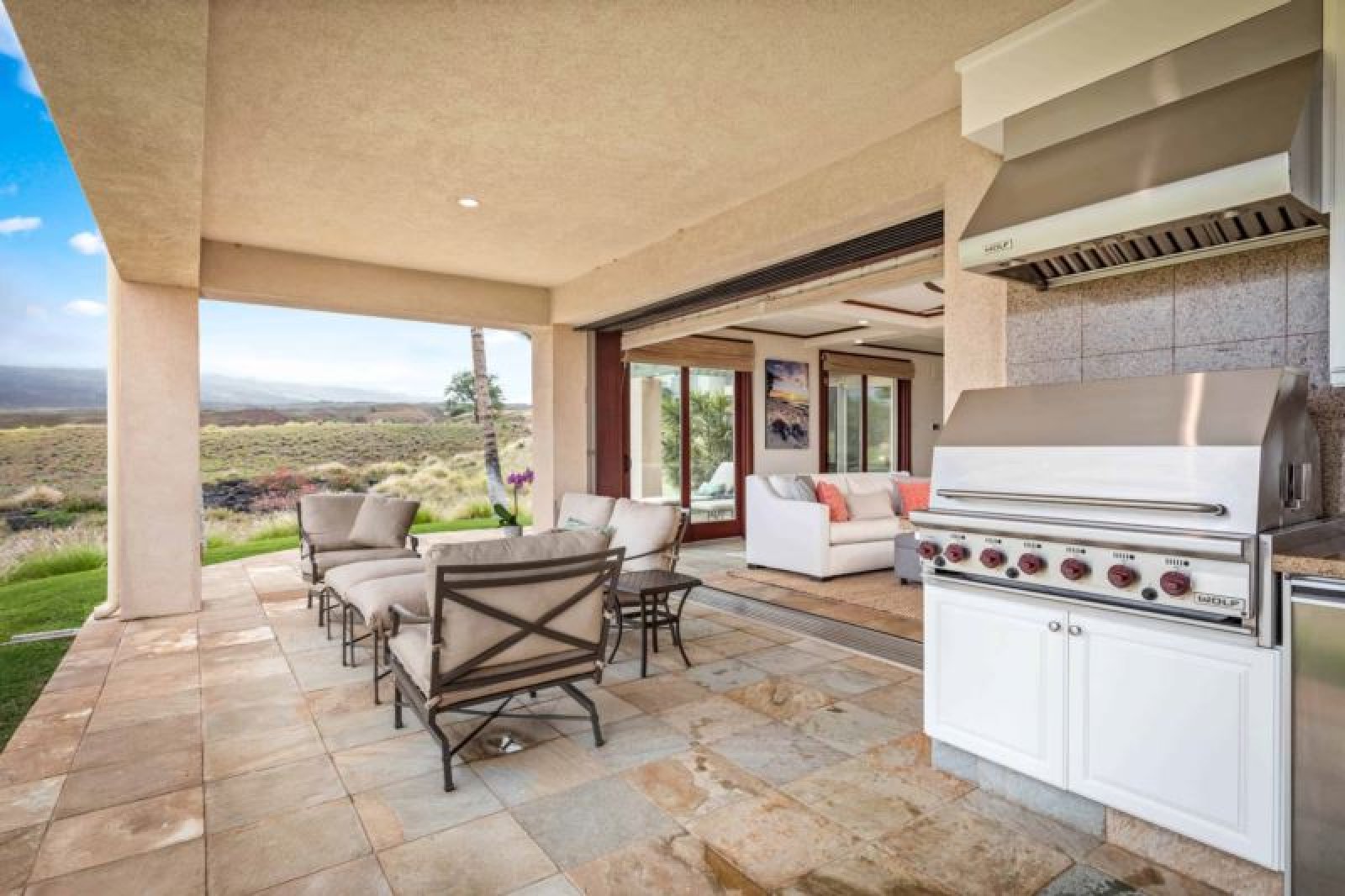 This beautifully-renovated, ground-level residence is adjacent to Hapuna Golf Course’s 11th fairway and showcases breathtaking, unobstructed ocean and mountains views within an ultra-spacious, corner layout (sleeps 10). Re-imagined by renowned designer Michele Turner, this home’s sliding glass walls provide indoor/outdoor island living while the luxe kitchen is outfitted with a Sub-Zero gas range and Wolf appliances. Savor a meal on the custom, monkey pod wood dining table. There are three guest suites, two with ocean vistas, a king size bed and attached bathroom with a rain shower and oversized bathtub; the third hosts a queen size bed. Additional features include a furnished, wrap around lanai with Wolf outdoor kitchen (BBQ, refrigerator), artwork from world-famous, local photographer C.J. Kale, a sleeper sofa, twin pull out ottomans, washer/dryer, Daikin air conditioners, and a one-car garage with extra parking. This residence is less than 1 mile from the ocean. Guests will enjoy resort charging privileges plus rare access to Hale Ikena Recreation Center, just a short walk from this residence.