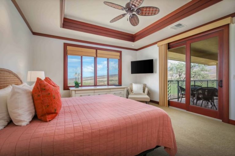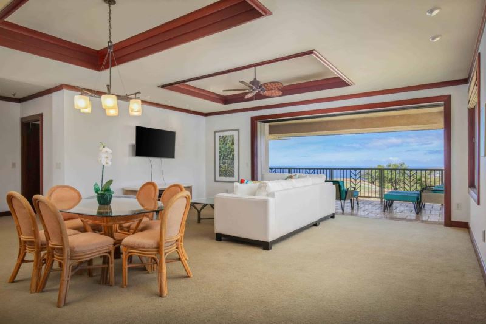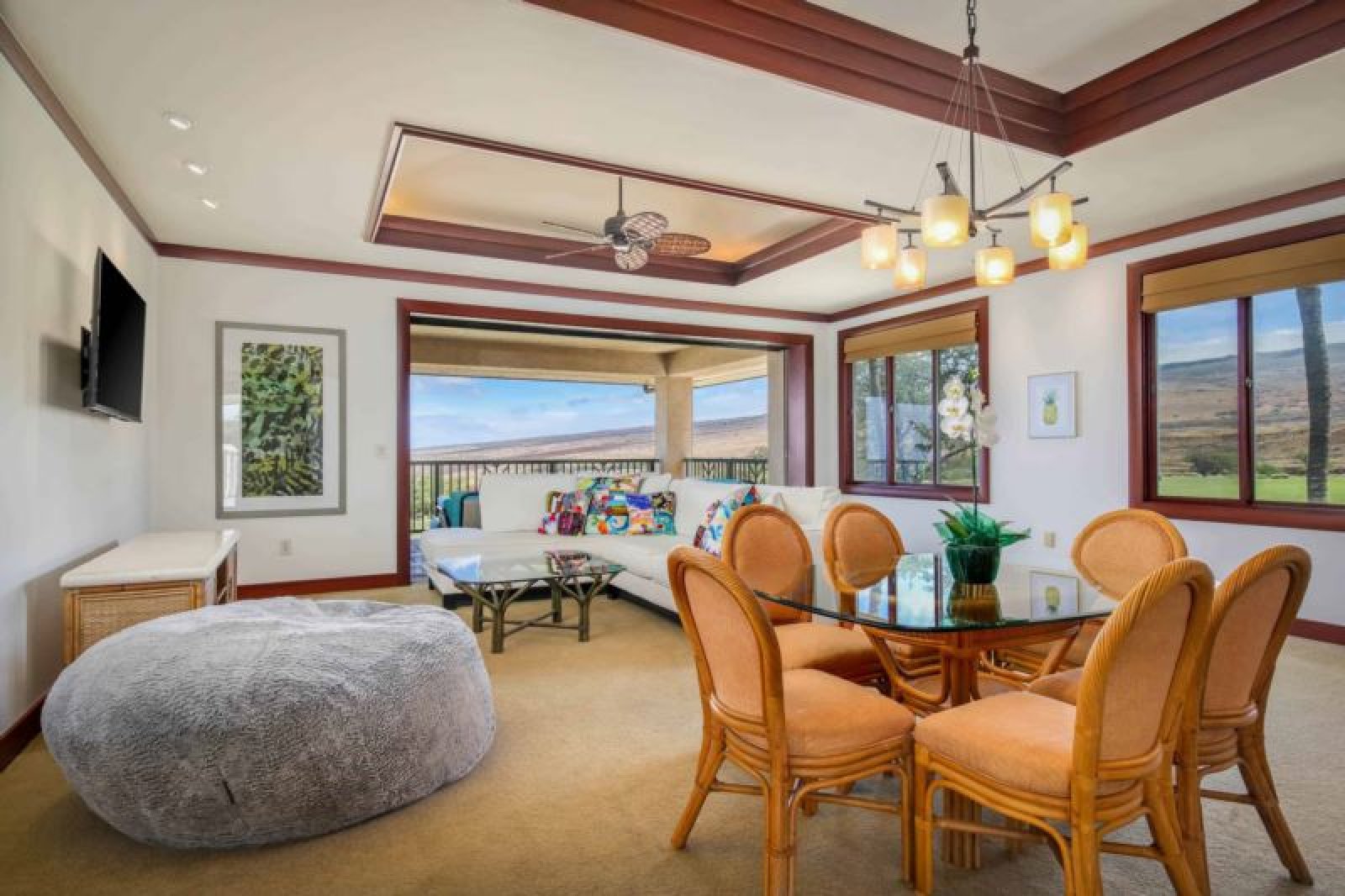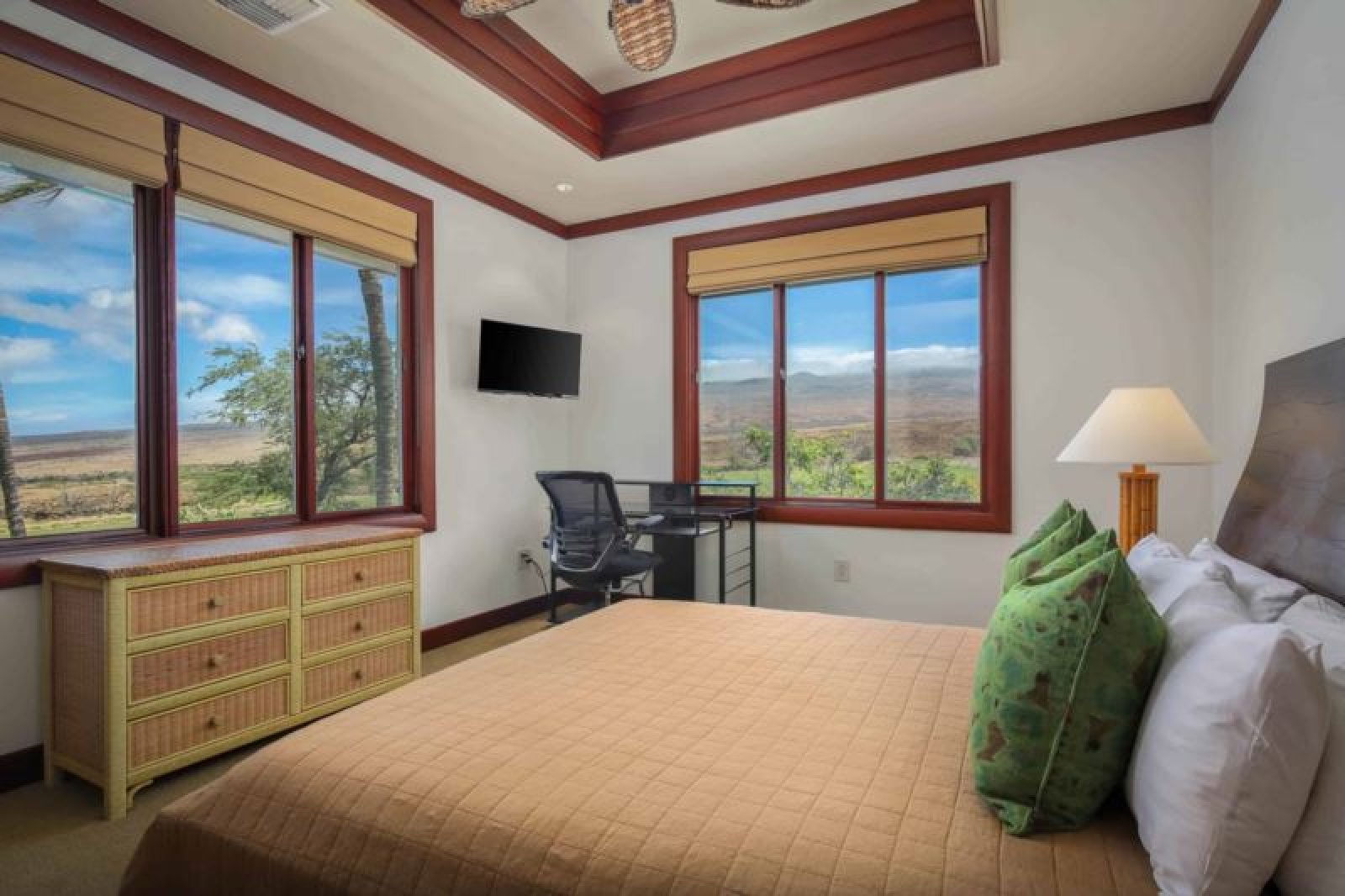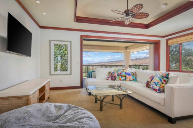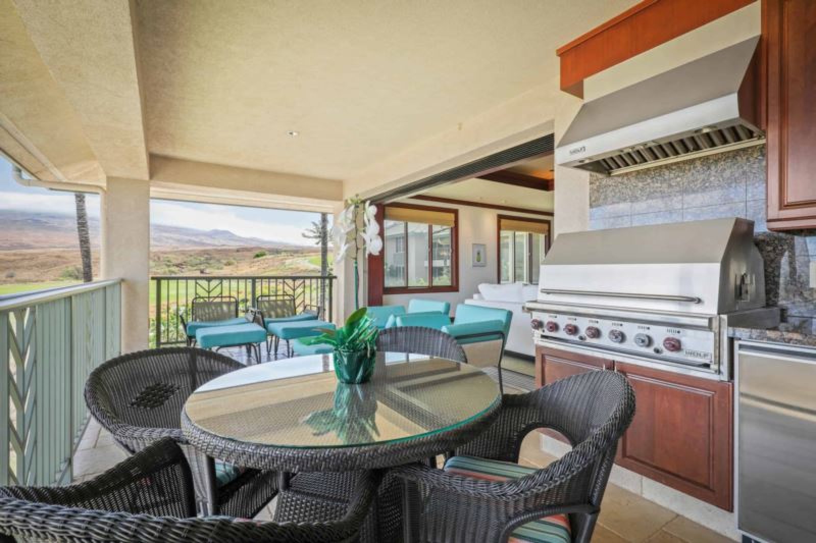 This lovely, upper-level, upcountry, oceanview residence offers a great room with sliding glass pocket doors for indoor/outdoor island living, a superior kitchen outfitted with Wolf and Sub-Zero stainless steel appliances/gas range, and a dining table for six. Additional features include dual master suites, each with an attached, well-appointed bathroom, a guest bedroom with two queen beds, a desk/work space, Hisense TVs throughout, air conditioning, ceiling fans and a laundry room. There’s also an expansive, furnished lanai with a Wolf outdoor kitchen and one-car garage. This residence is about a mile from the ocean. Guests will enjoy unobstructed ocean, golf and mountain vistas, resort charging privileges and access to Hale Ikena Recreation Center, which is walking distance from this residence.