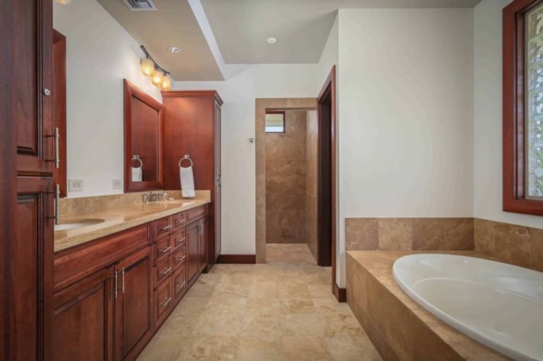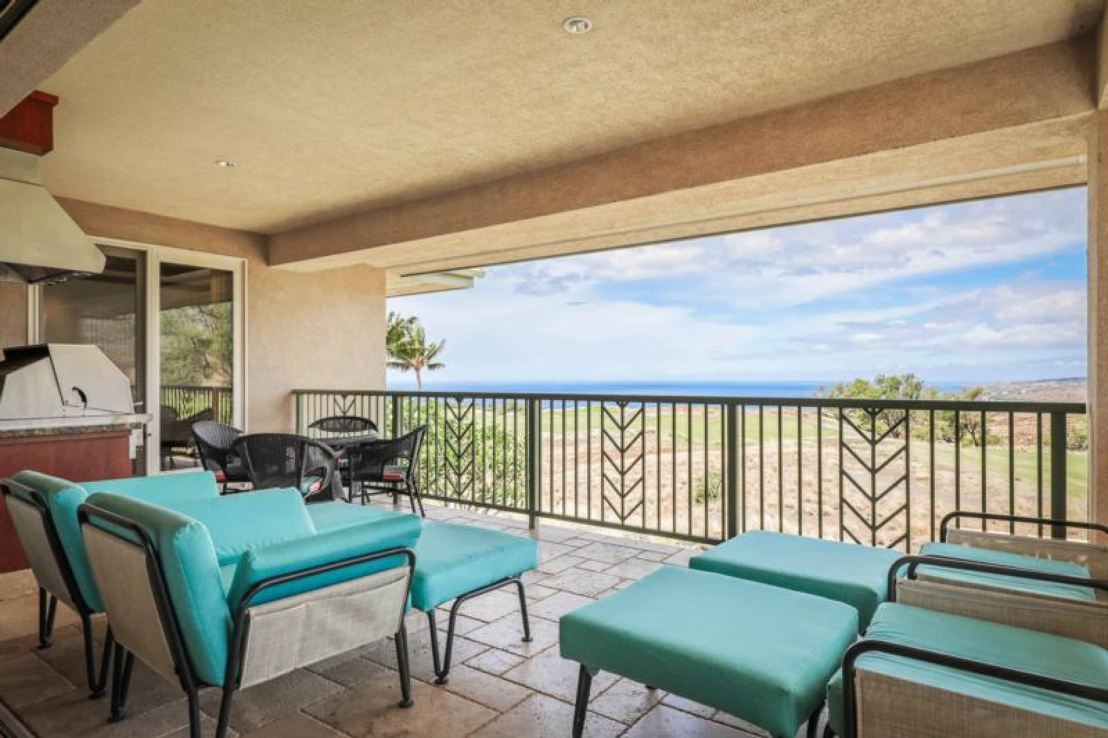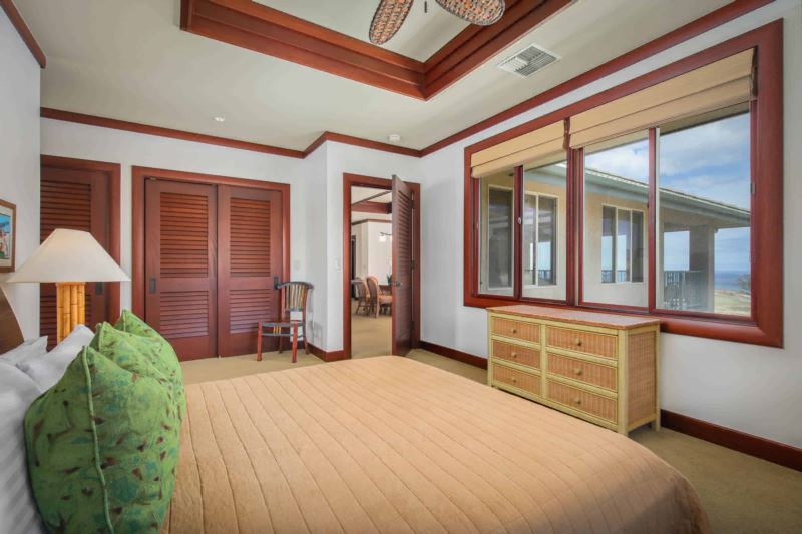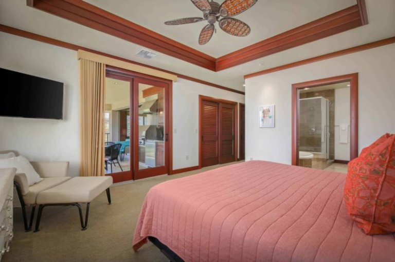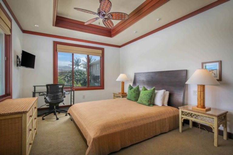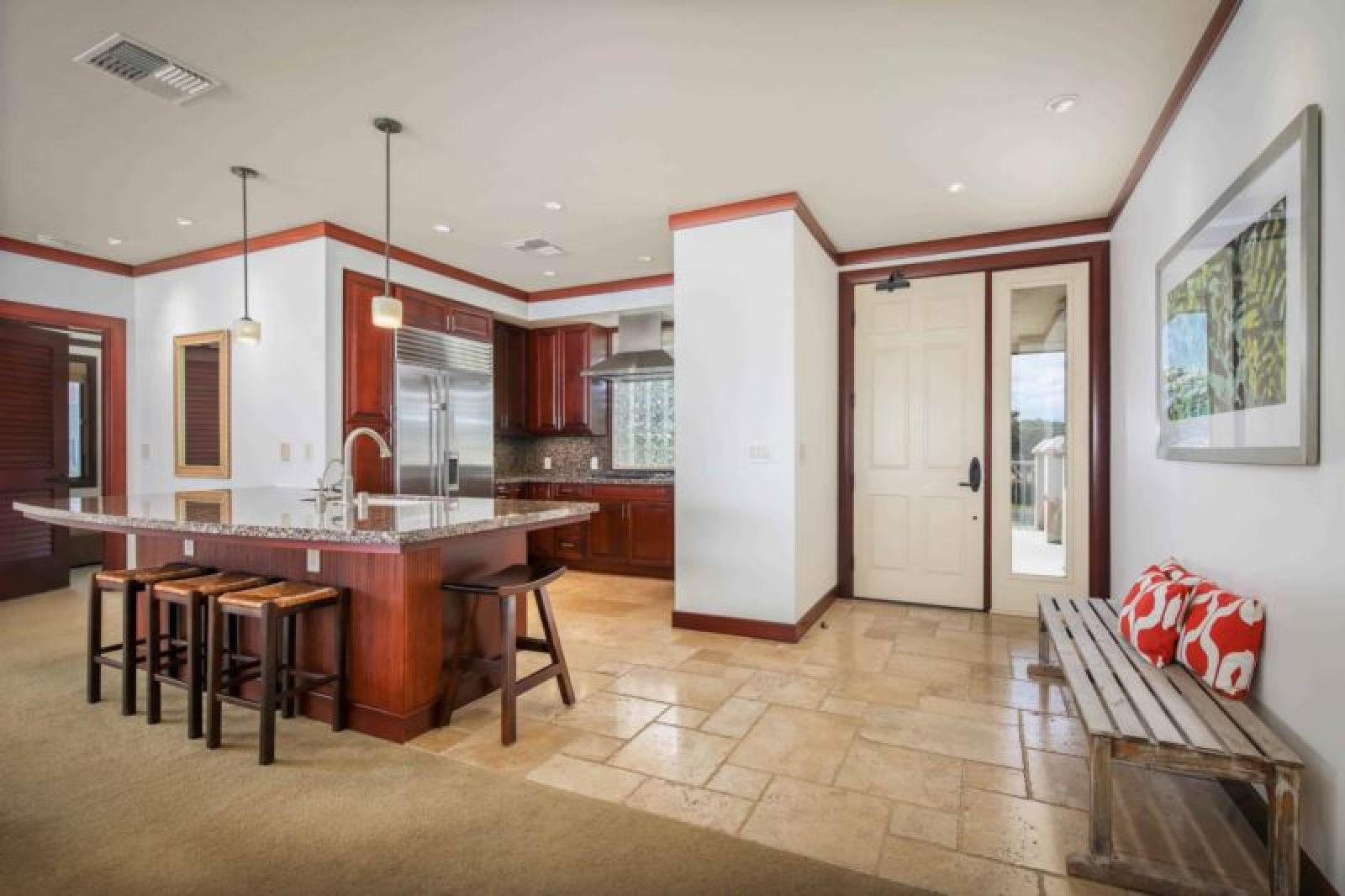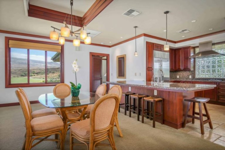 This lovely, upper-level, upcountry, oceanview residence offers a great room with sliding glass pocket doors for indoor/outdoor island living, a superior kitchen outfitted with Wolf and Sub-Zero stainless steel appliances/gas range, and a dining table for six. Additional features include dual master suites, each with an attached, well-appointed bathroom, a guest bedroom with two queen beds, a desk/work space, Hisense TVs throughout, air conditioning, ceiling fans and a laundry room. There’s also an expansive, furnished lanai with a Wolf outdoor kitchen and one-car garage. This residence is about a mile from the ocean. Guests will enjoy unobstructed ocean, golf and mountain vistas, resort charging privileges and access to Hale Ikena Recreation Center, which is walking distance from this residence.
