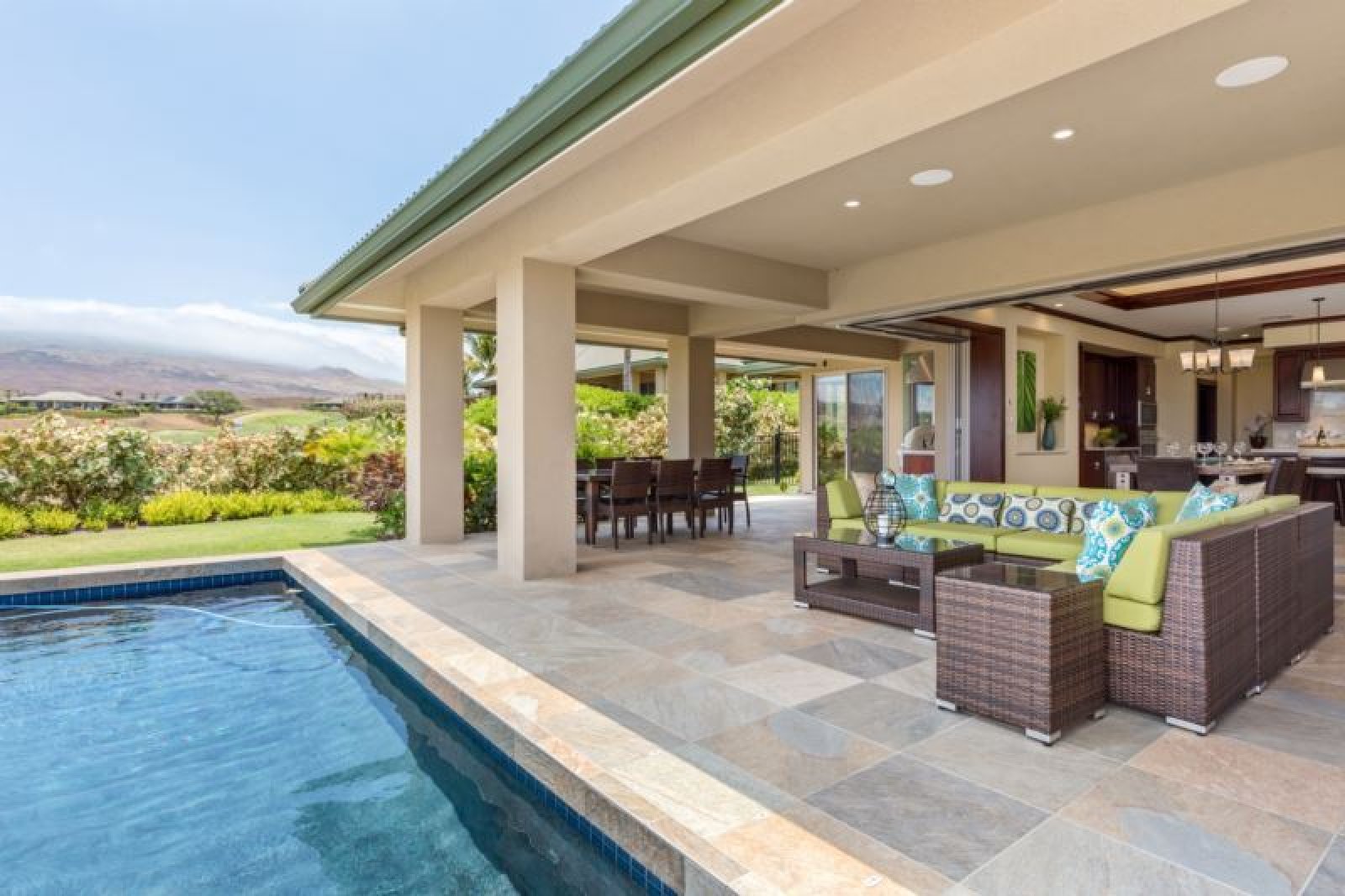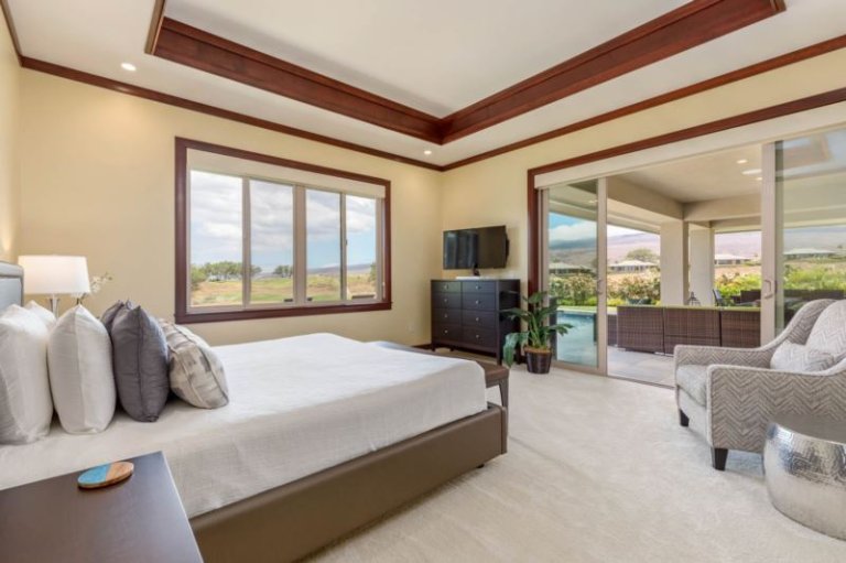 This luxe, ‘upcountry’, oceanview residence offers a great room with sliding glass pocket doors for indoor/outdoor island living, a chef’s kitchen outfitted with Wolf and Sub-Zero appliances, including a double oven and wine refrigerator, dual master suites and a spacious guest bedroom with 2 queen beds. Additional features include air conditioning and ceiling fans, washer/dryer, an outdoor shower, private unheated swimming pool, hot tub and furnished lanai with Wolf outdoor kitchen (BBQ, refrigerator), plus a two-car garage brimming with beach toys. This residence is about 1 mile from the ocean. Guests will enjoy unobstructed ocean, golf and mountain views, resort charging privileges and access to Hale Ikena Recreation Center.