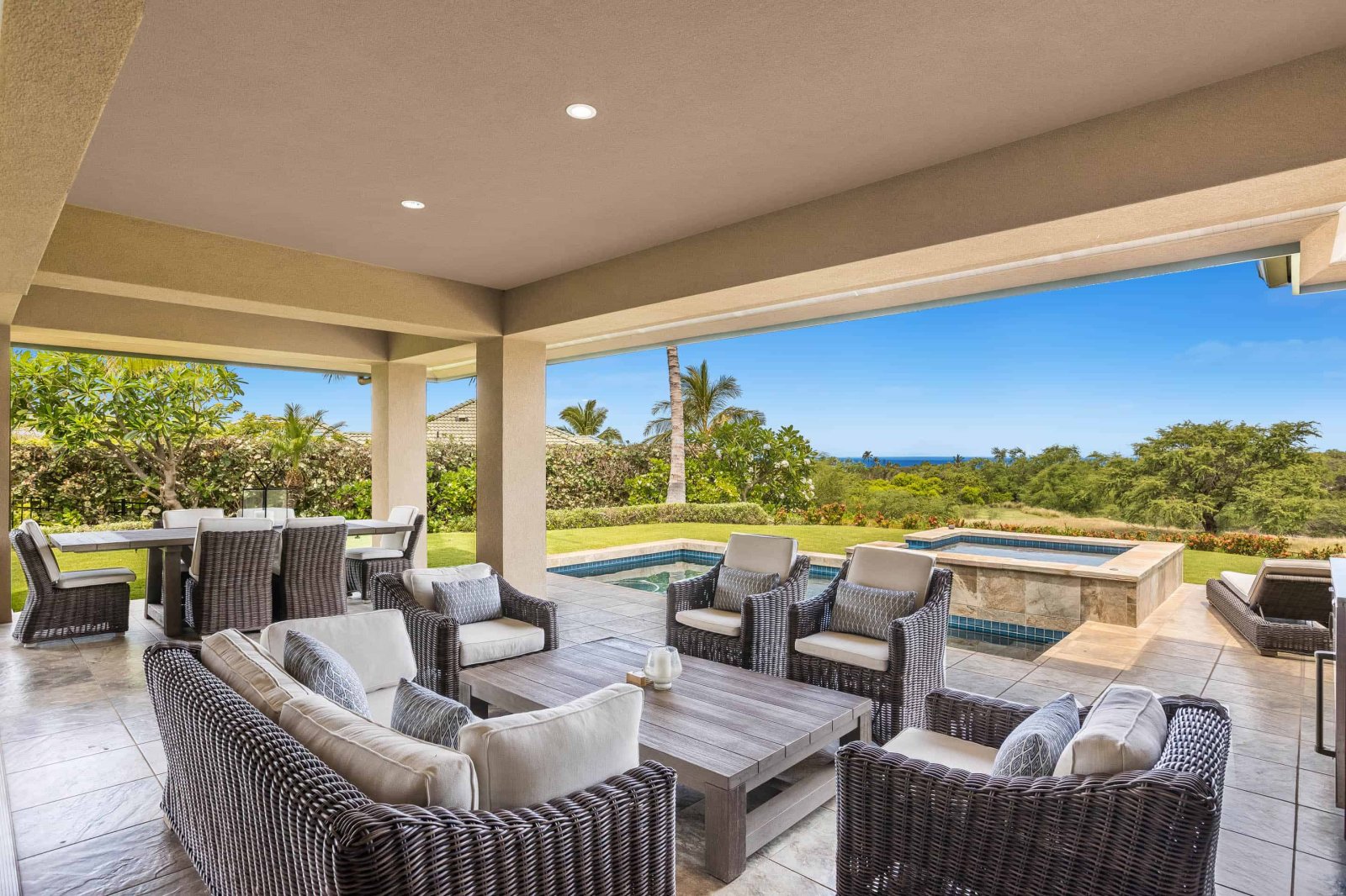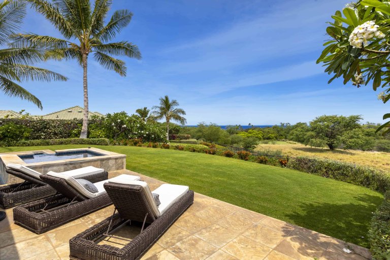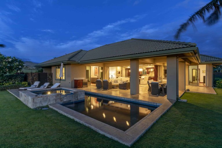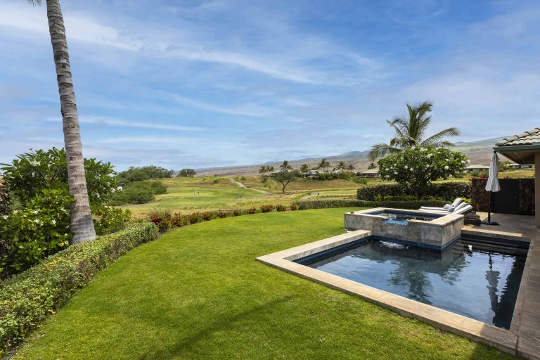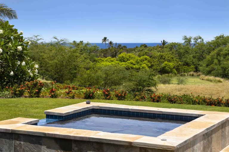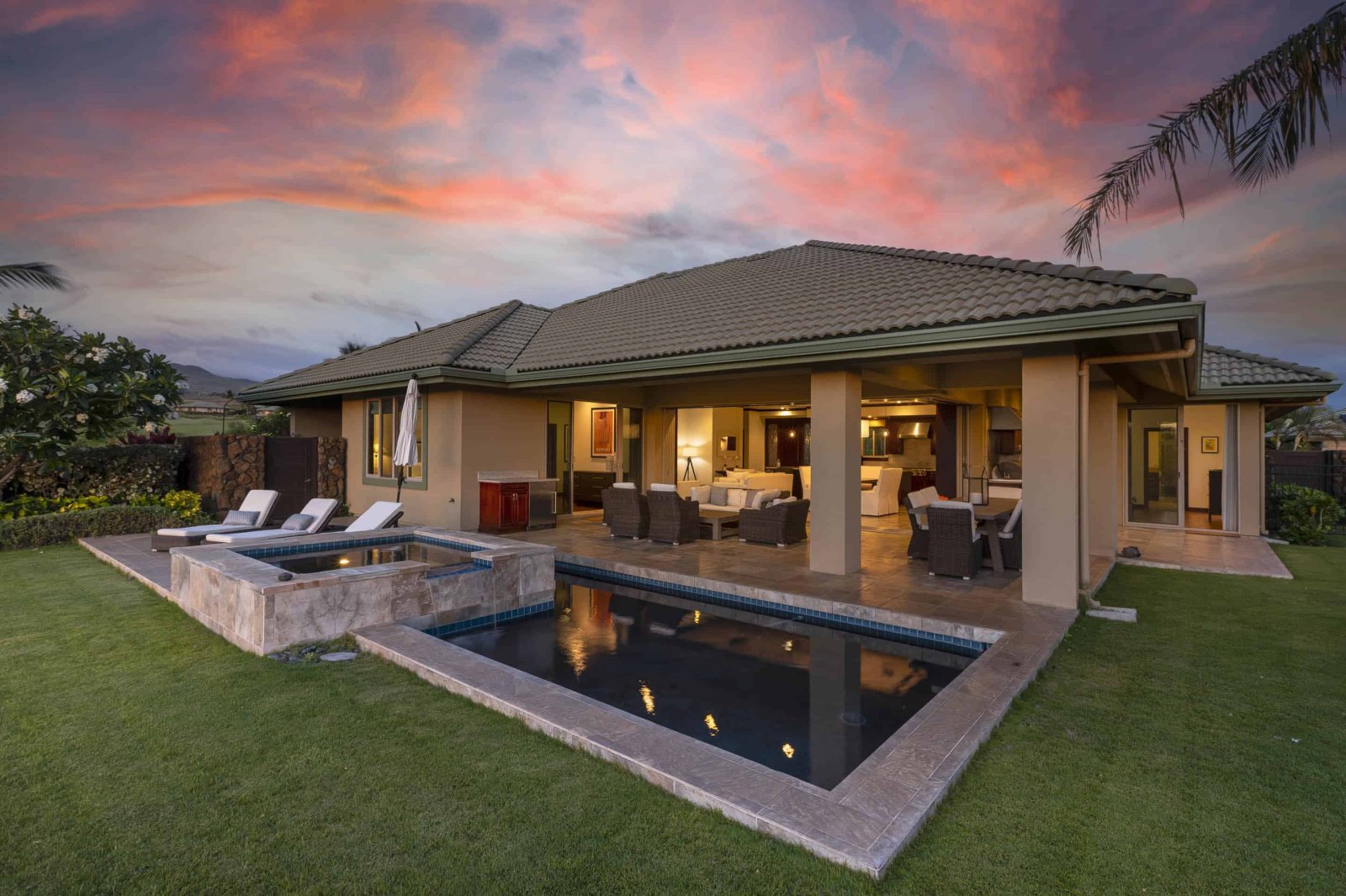This discerning, upcountry, oceanview residence offers a great room with sliding glass pocket doors that invite indoor/outdoor island living; a chef’s kitchen outfitted with slab granite countertops and premium stainless steel appliances (including a wine refrigerator); plus a dining table for six. Additional features include: three guest suites, each with a flatscreen TV and attached, spa-inspired bathroom (primary has a king size bed, double vanity and outdoor shower, secondary has a king size bed, double vanity and soaking tub, the third suite has two full size beds), air conditioning and ceiling fans, a laundry room, and Savor idyllic Hawaiian sunsets from the private plunge pool, hot tub and covered lanai finished with an outdoor kitchen, dining and lounge furniture. This residence is about 1 mile from the ocean. Guests will enjoy ocean, golf and mountain views, resort charging privileges, and access to Hale Ikena Recreation Center.