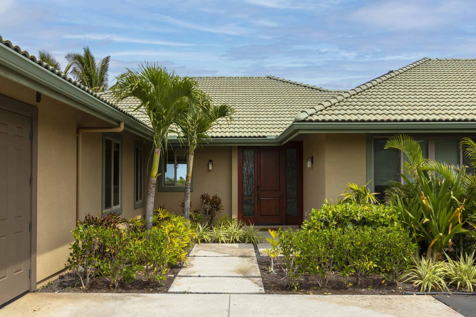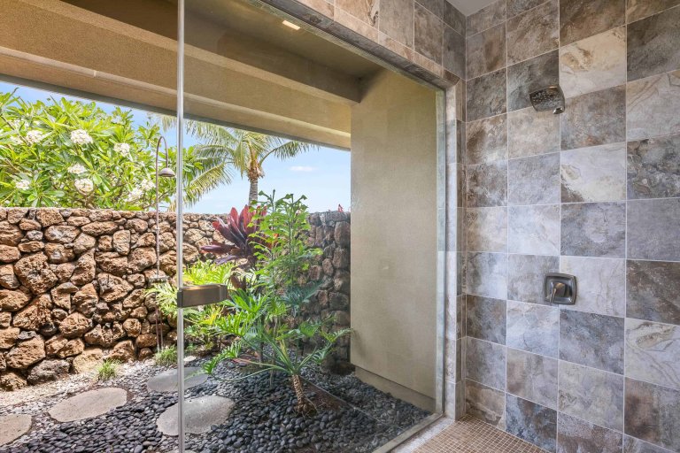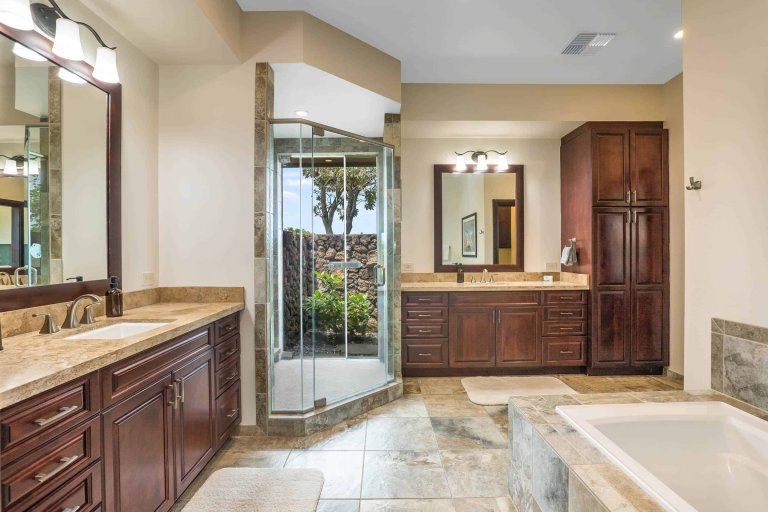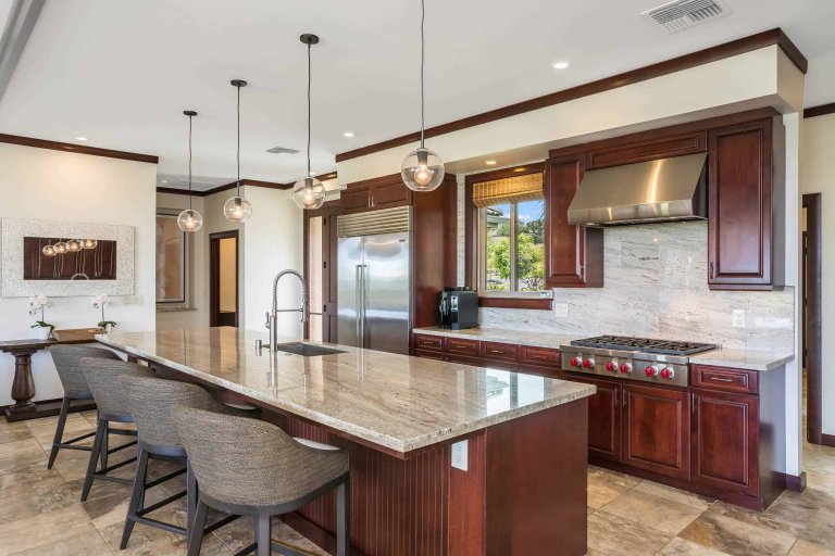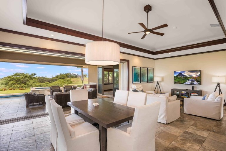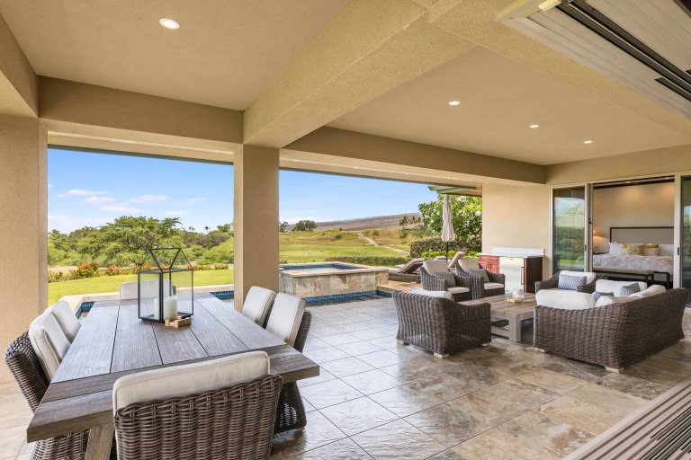This discerning, upcountry, oceanview residence offers a great room with sliding glass pocket doors that invite indoor/outdoor island living; a chef’s kitchen outfitted with slab granite countertops and premium stainless steel appliances (including a wine refrigerator); plus a dining table for six. Additional features include: three guest suites, each with a flatscreen TV and attached, spa-inspired bathroom (primary has a king size bed, double vanity and outdoor shower, secondary has a king size bed, double vanity and soaking tub, the third suite has two full size beds), air conditioning and ceiling fans, a laundry room, and Savor idyllic Hawaiian sunsets from the private plunge pool, hot tub and covered lanai finished with an outdoor kitchen, dining and lounge furniture. This residence is about 1 mile from the ocean. Guests will enjoy ocean, golf and mountain views, resort charging privileges, and access to Hale Ikena Recreation Center.