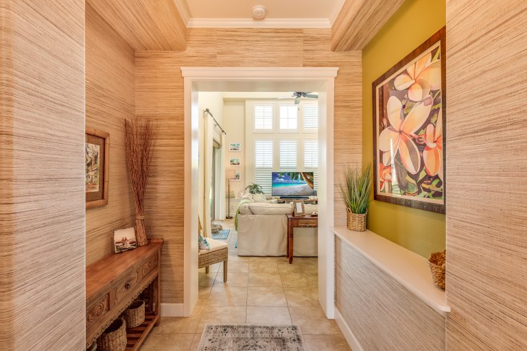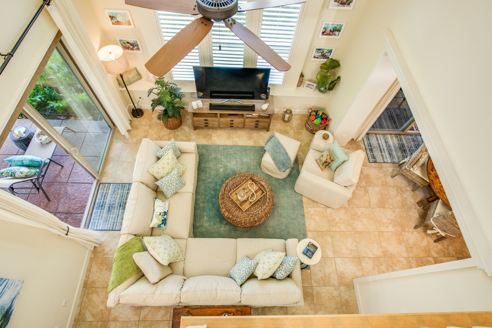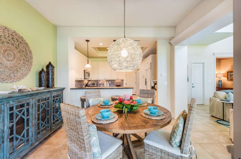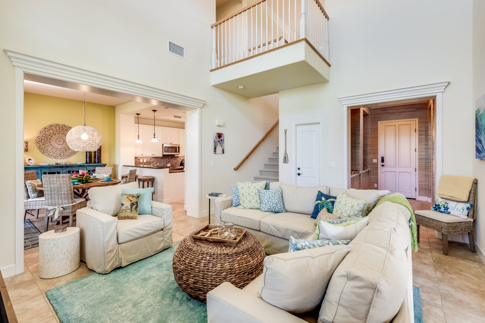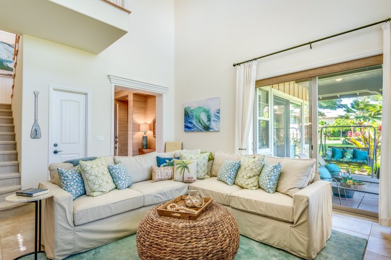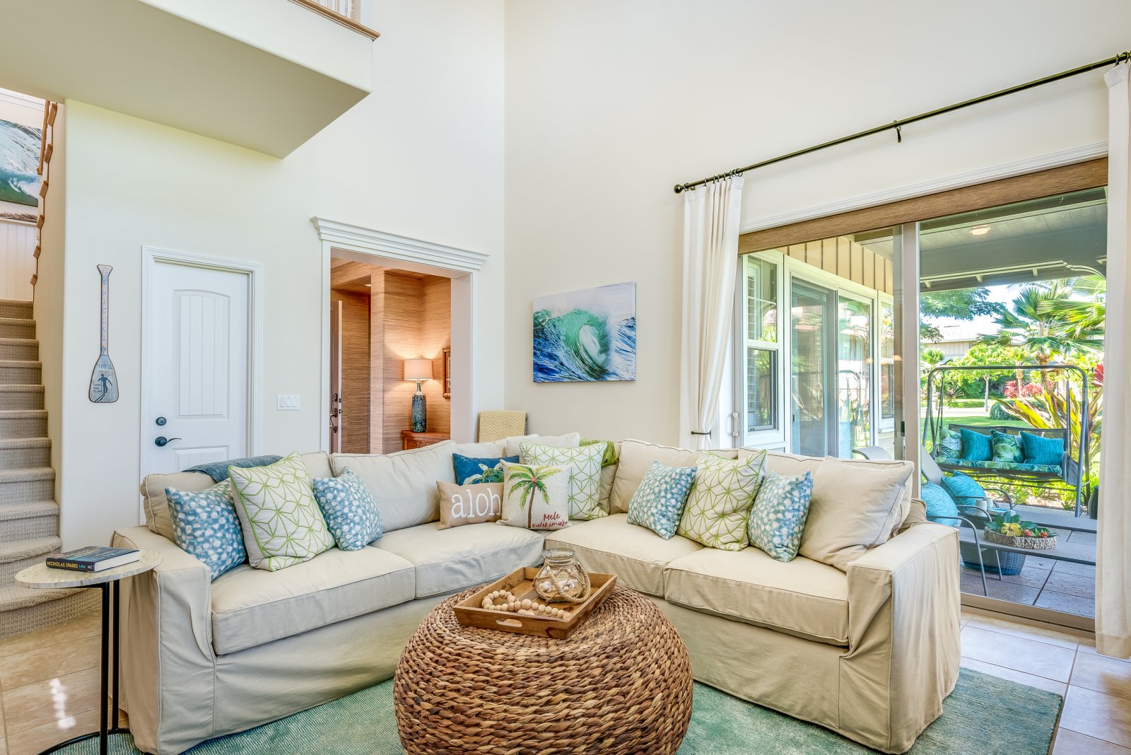 Step into the welcoming entry hall and into a bright, open-concept living room where two-story ceilings, tall windows, and soft coastal tones create an inviting gathering space. Plush seating is arranged around the TV, perfect for movie nights after a day at the Mauna Lani Beach Club. The adjacent dining area seats four, with sliding doors that open directly to a covered lanai for seamless indoor outdoor living.