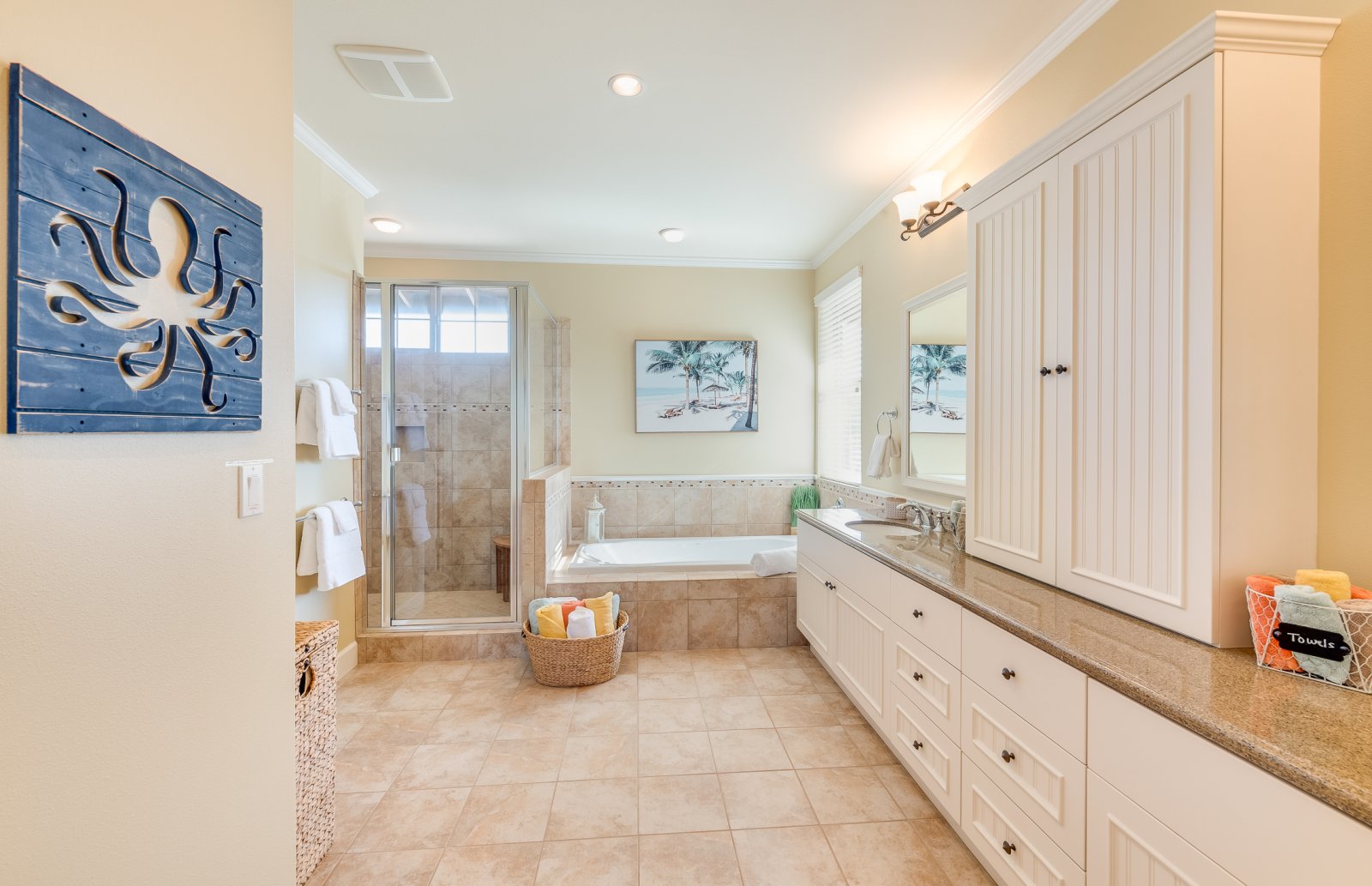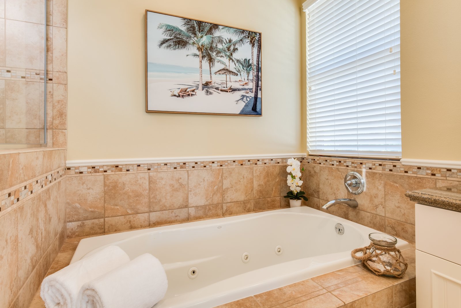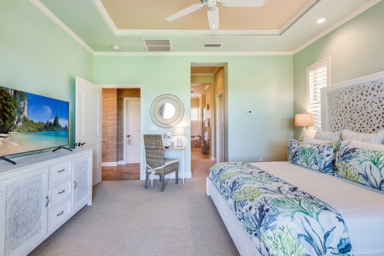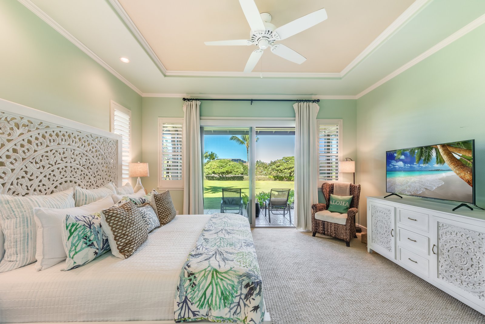 • Primary Suite, Ground Floor – King bed, garden view, lanai access, central A/C, ceiling fan, ensuite bath with dual sink vanity, jacuzzi tub, walk-in shower, separate water closet, and views and access to the private outdoor shower garden