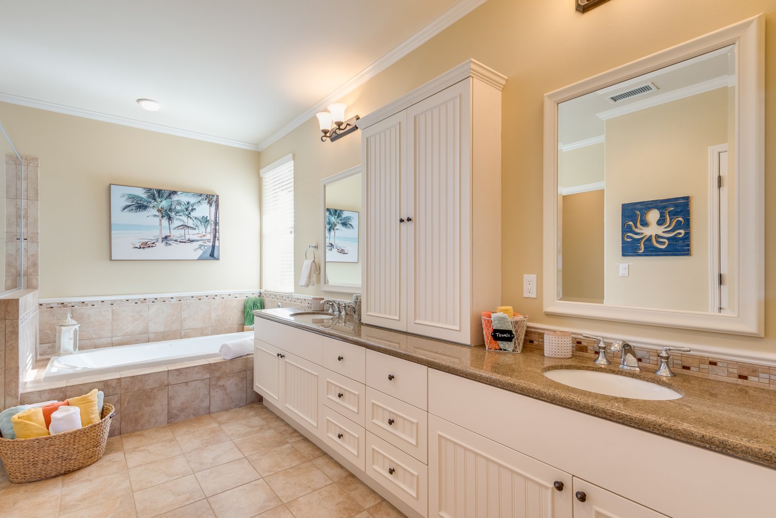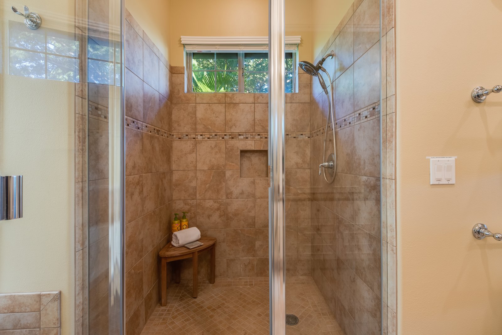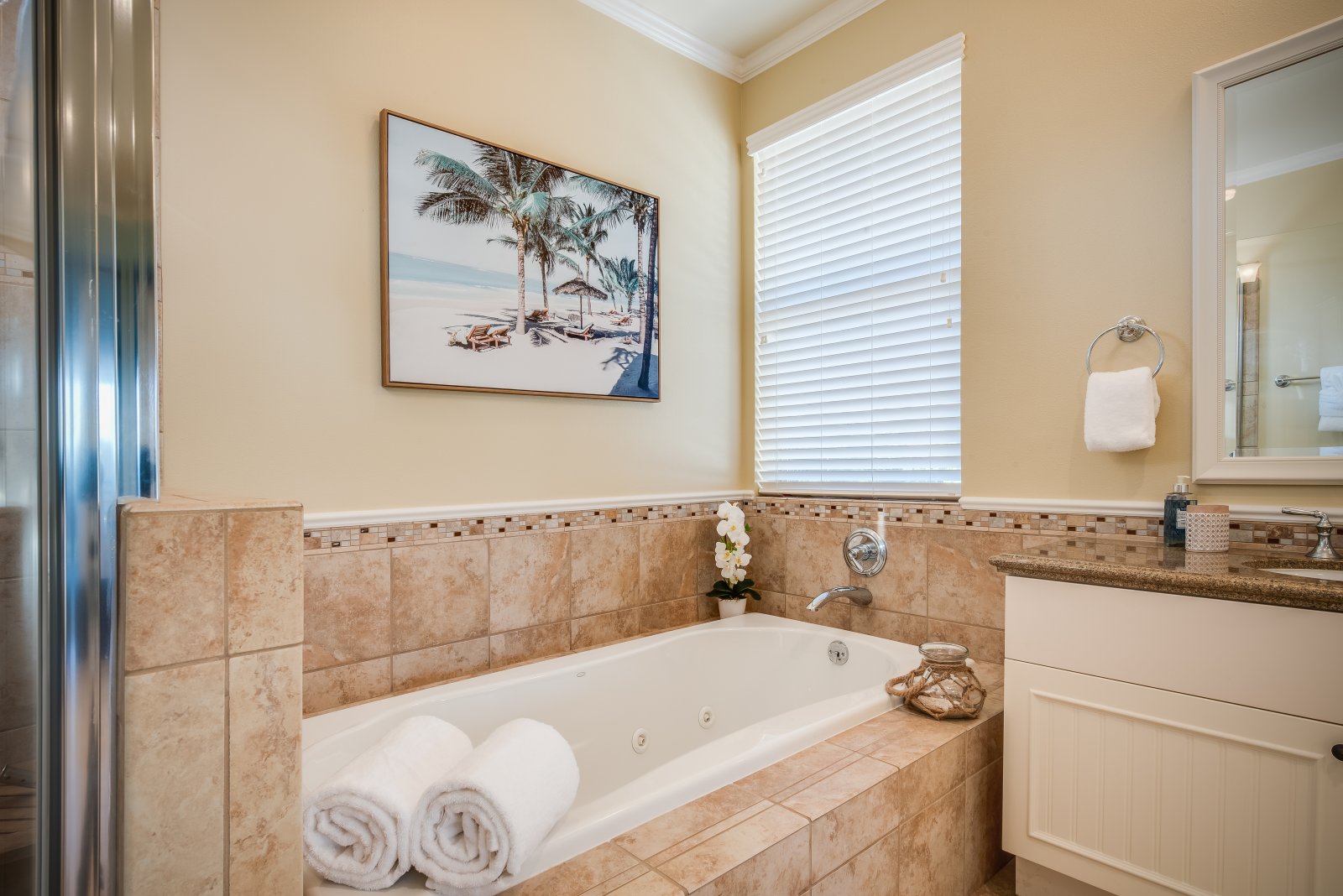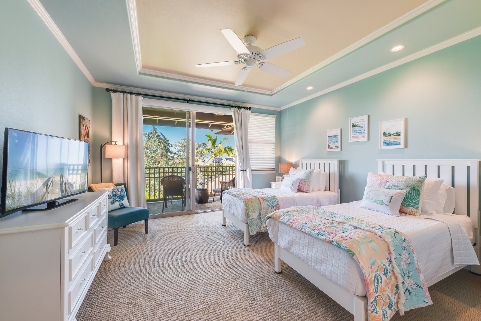 • Guest Suite, Upper Level – Two twin beds that can be converted to a king, garden and lawn views, private lanai, central A/C, ceiling fan, walk-in closet, TV with Netflix, twin air-bed and bedding in closet, spacious ensuite bath with dual sinks, jacuzzi tub, walk-in shower, and separate water closet