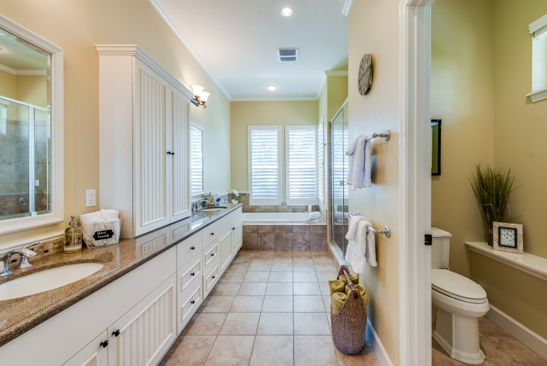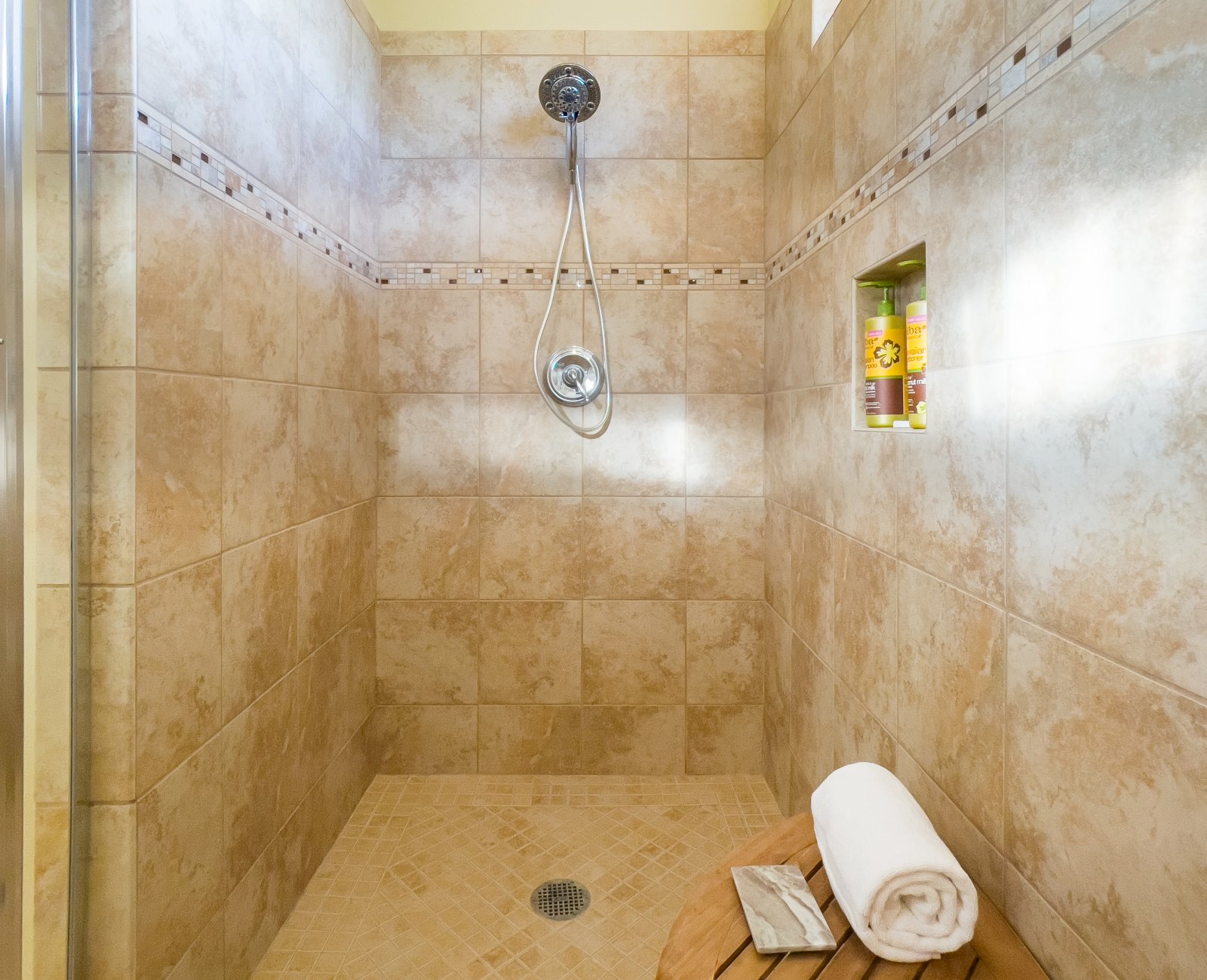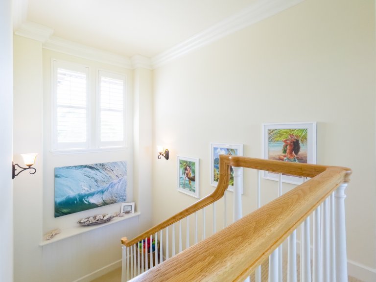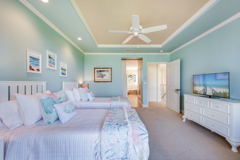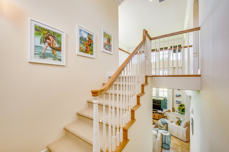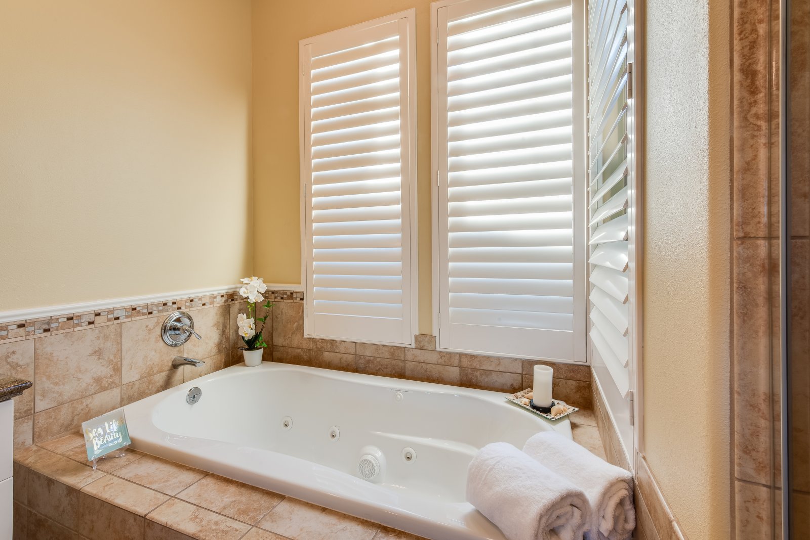 • Guest Suite, Upper Level – Two twin beds that can be converted to a king, garden and lawn views, private lanai, central A/C, ceiling fan, walk-in closet, TV with Netflix, twin air-bed and bedding in closet, spacious ensuite bath with dual sinks, jacuzzi tub, walk-in shower, and separate water closet