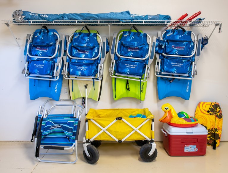 • Garage parking for one car and ample beach gear including chairs, umbrellas, coolers, boogie boards, beach towels, and a beach bag