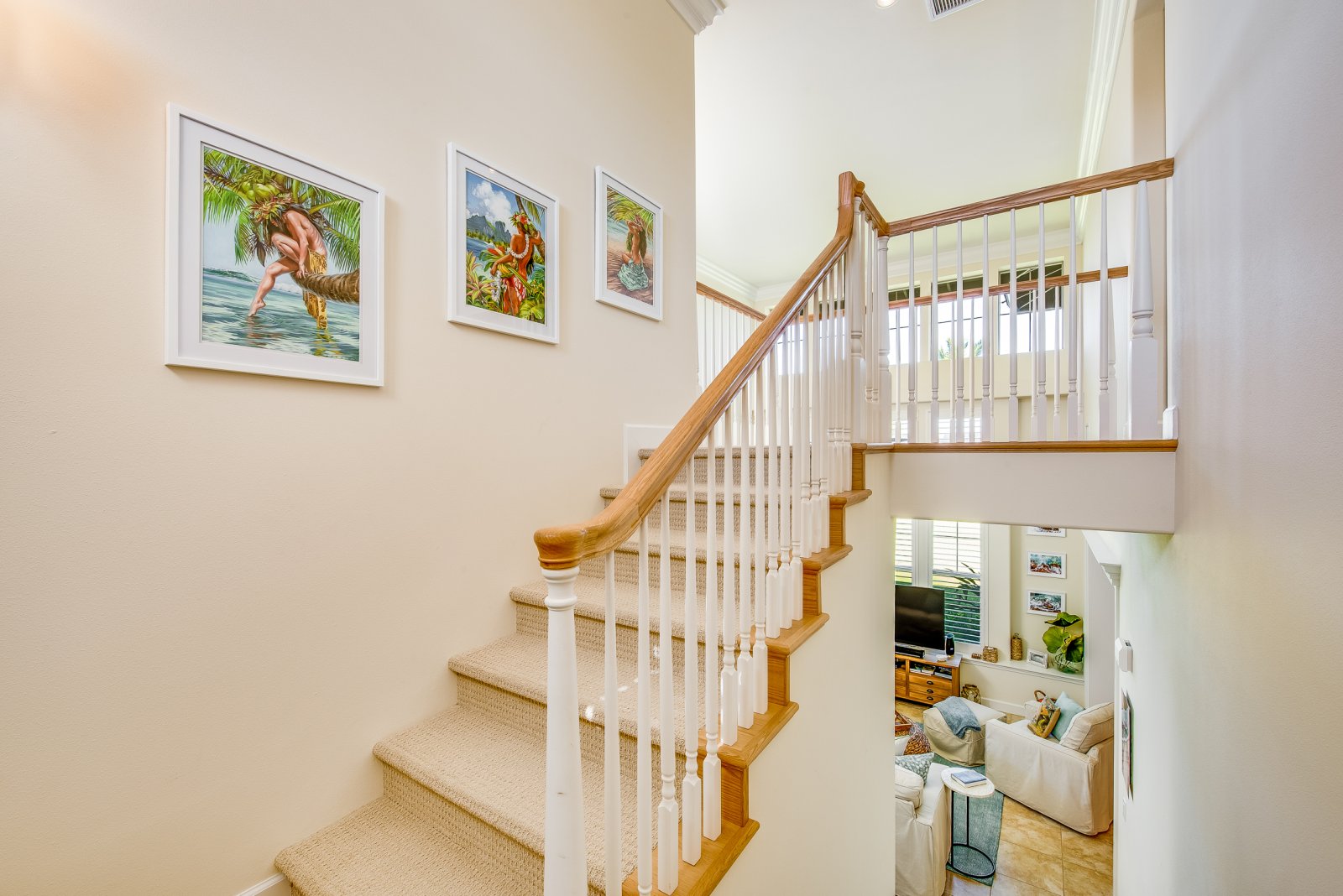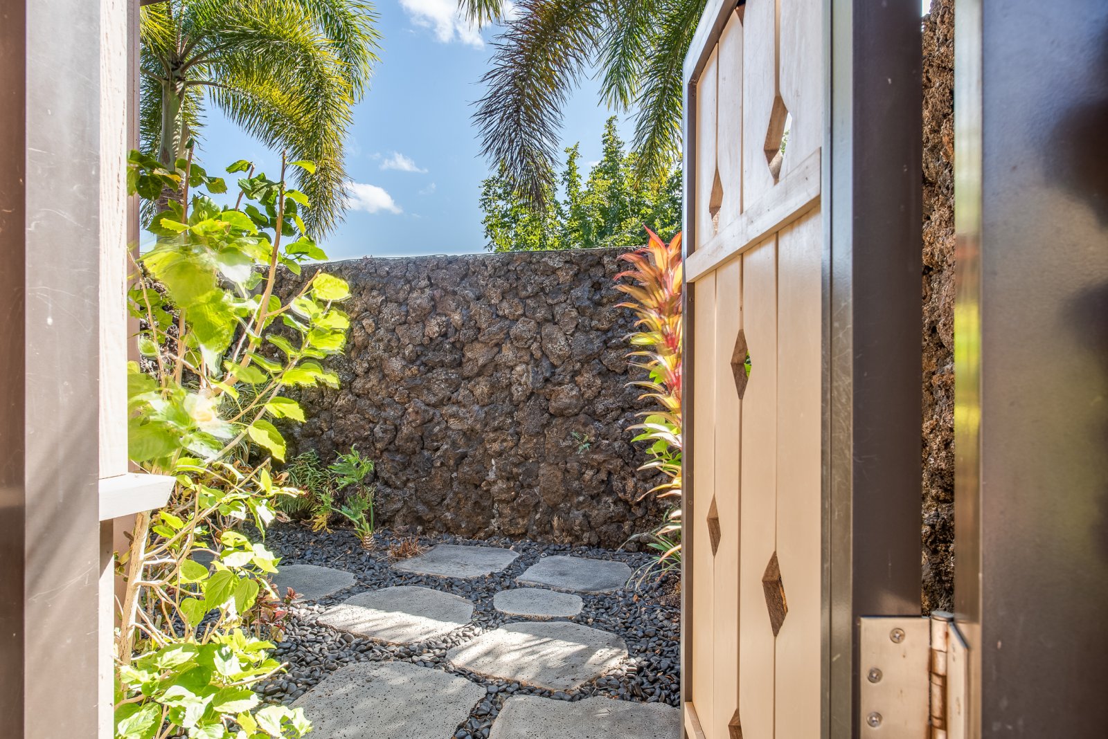 Multiple lanais and a private garden make outdoor time a highlight here. Off the living room and primary suite, a ground-level lanai offers chaise lounges where you can unwind and listen to the palm trees sway over the expansive lawn. The dining lanai features a gas grill and table for four, perfect for relaxed evenings at home. Tucked beyond the primary bath is a walled secret garden with a private outdoor shower, a tropical sanctuary that feels wonderfully secluded. Upstairs, the second bedroom enjoys its own balcony overlooking the gardens.