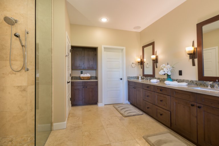 Large sliding doors dissolve the boundary between the great room and the covered lanai, creating a breezy, open-air living experience. Thoughtful upgrades like whole-home audio, automated lighting, smart climate controls, and premium beds elevate comfort while keeping the home’s atmosphere relaxed, inviting, and easy to settle into.