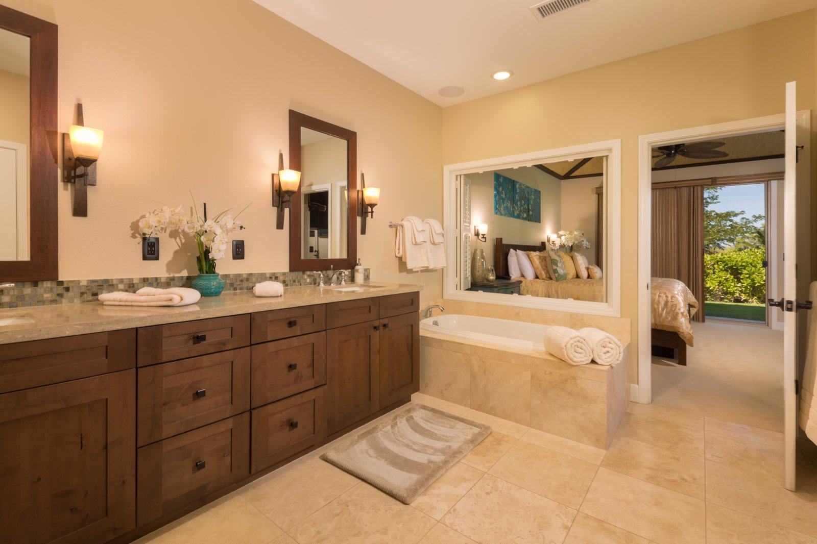 • Primary Suite – King bed, ensuite bath with soaking tub, walk-in shower with dual shower heads, dual sinks, lanai access, mountain views, central AC