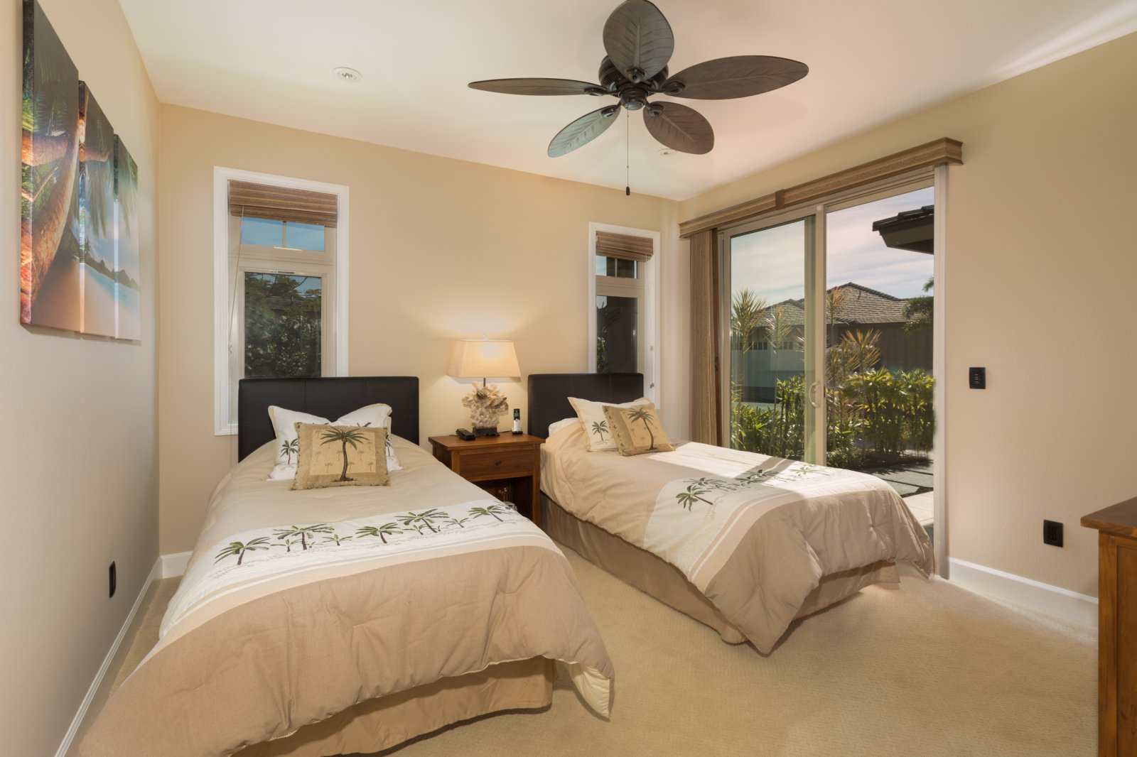 • Bedroom 2 – Two twin beds, lanai access, mountain views, central AC