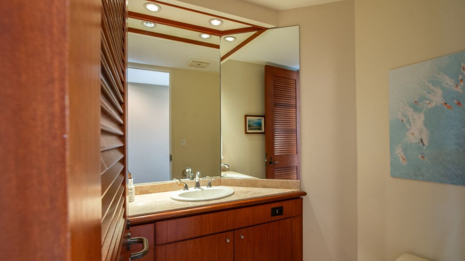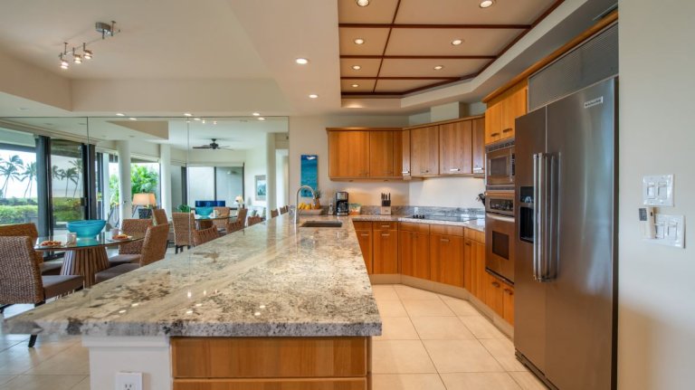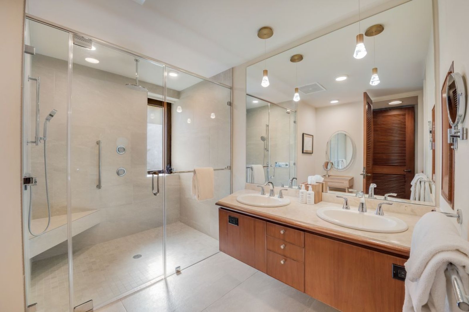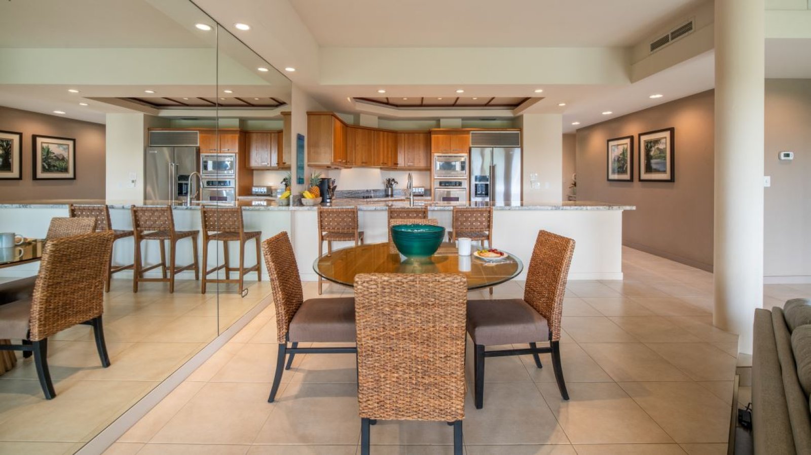 The private primary bedroom offers a plush king-size bed and direct access to the lanai, allowing you to step outside and enjoy ocean views at any time. The en-suite bathroom is styled as a spa-like retreat with a dual vanity and an oversized walk-in shower, providing a luxurious space to unwind.Kitchen & Dining