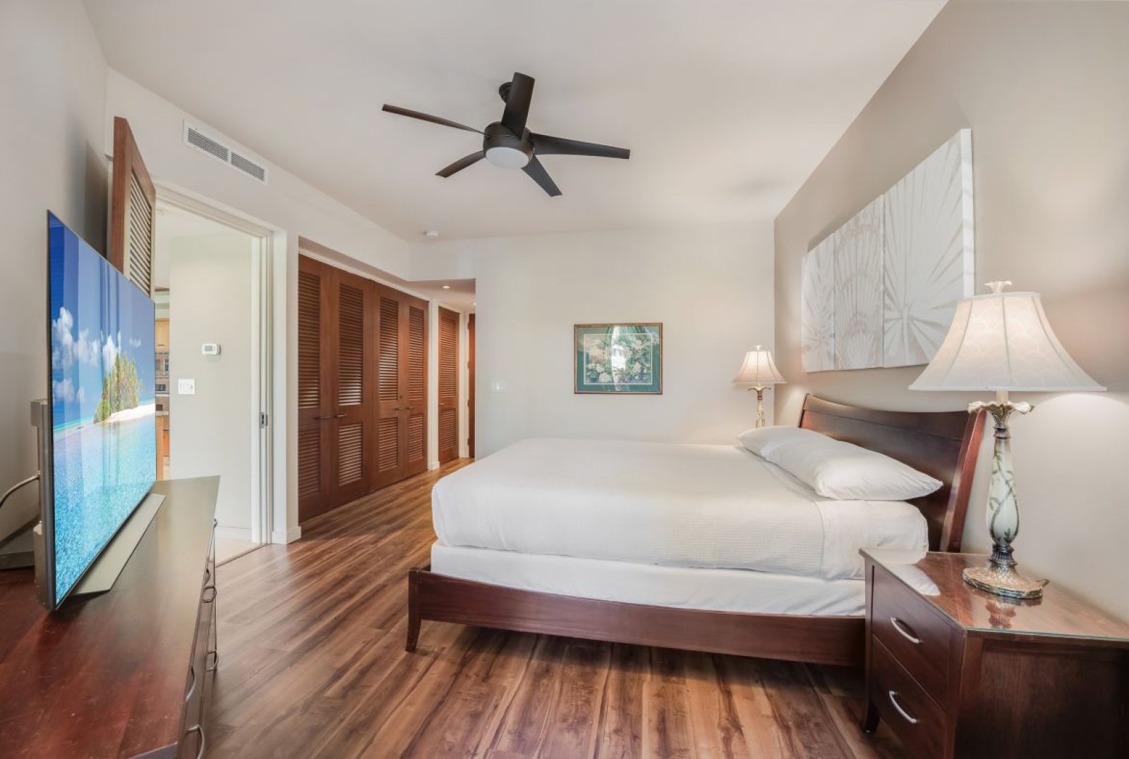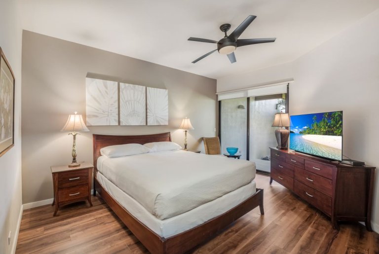 The living area is comfortably furnished and designed to highlight the surrounding scenery. Whether you are enjoying a movie, reading a favorite book, or simply taking in the views, the seamless flow between interior spaces and the lanai enhances the sense of calm and connection to nature.Sleeping Accommodations | Up to 4 Guests
