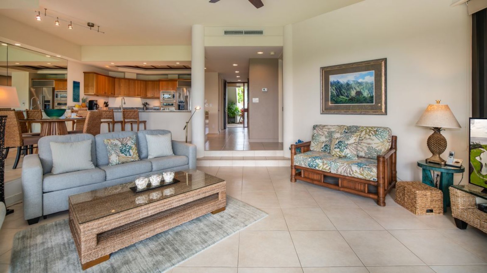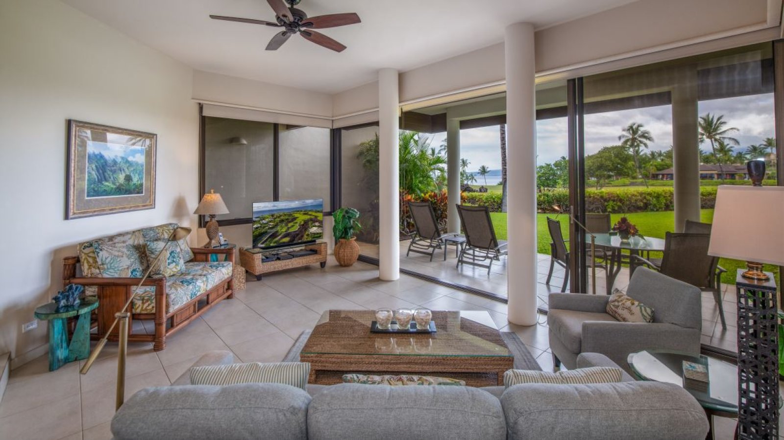 Welcome to Mauna Lani Point B101, a refined ground-floor residence offering peaceful ocean views and direct access to the renowned Mauna Lani Golf South Course just moments from your lanai. Thoughtfully renovated and designed for effortless indoor-outdoor living, this one-bedroom retreat captures the relaxed elegance of the Kohala Coast.The open floor plan connects the gourmet kitchen, dining area, and living room to a spacious private lanai, creating an inviting setting for both relaxation and entertaining. Floor-to-ceiling windows fill the residence with natural light and frame lush tropical surroundings with the Pacific Ocean beyond. Begin your mornings listening to birdsong over coffee outdoors, and end your days with sunset dinners cooled by gentle ocean breezes.
