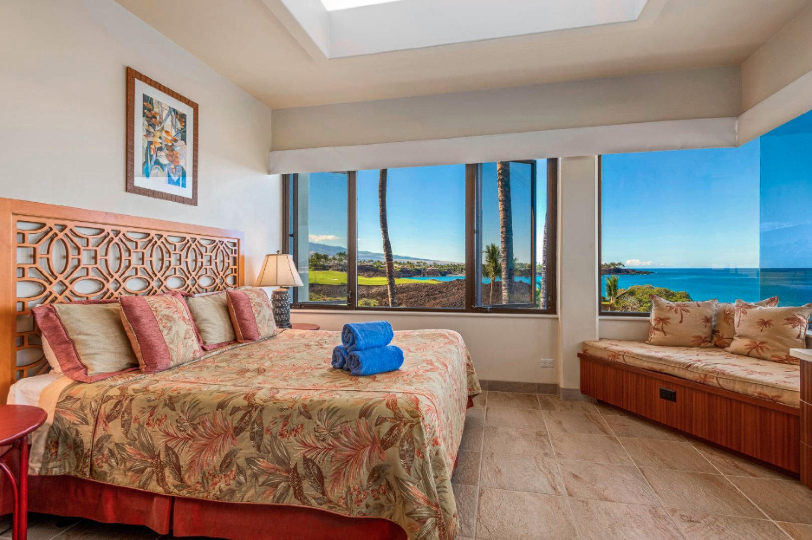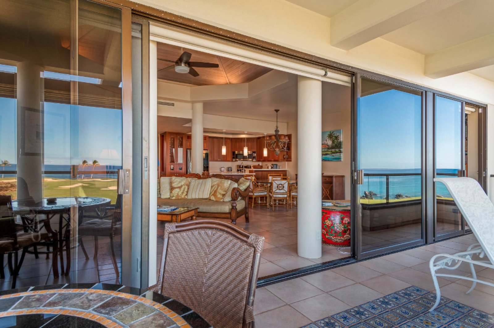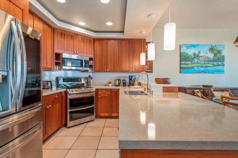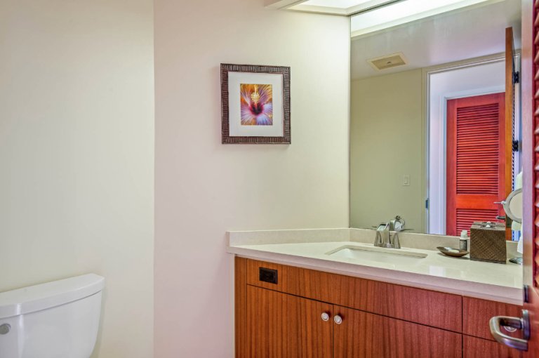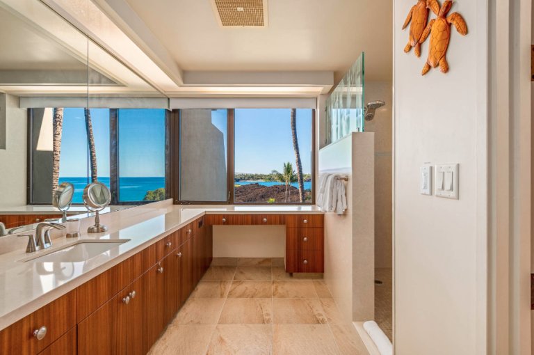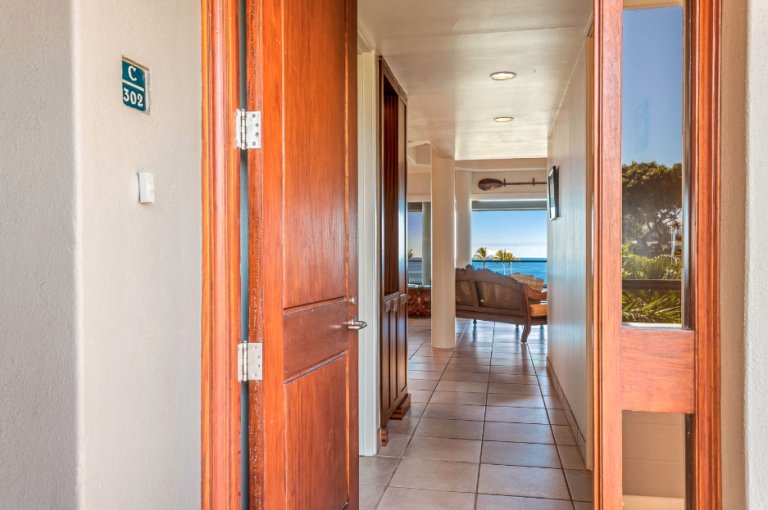 Residence C302 has a remarkable third-floor view overlooking the blue Pacific and Mauna Lani’s famous Par 3 Signature Hole. This vacation rental comfortably sleeps four with two spacious bedrooms and two and one-half bathrooms. The fully equipped kitchen flows into the open-plan living room with a flat-screen TV, a dining room that seats six, and an office space. Cook up Hawaiian-inspired cuisine and enjoy with family and friends from the comfort of your spacious private lanai. The master bedroom boasts a king-size bed. While the second bedroom offers two queen size beds. The master bath features a walk-in shower. This magnificent residence has it all, including the picturesque ocean views Hawaii is known for.