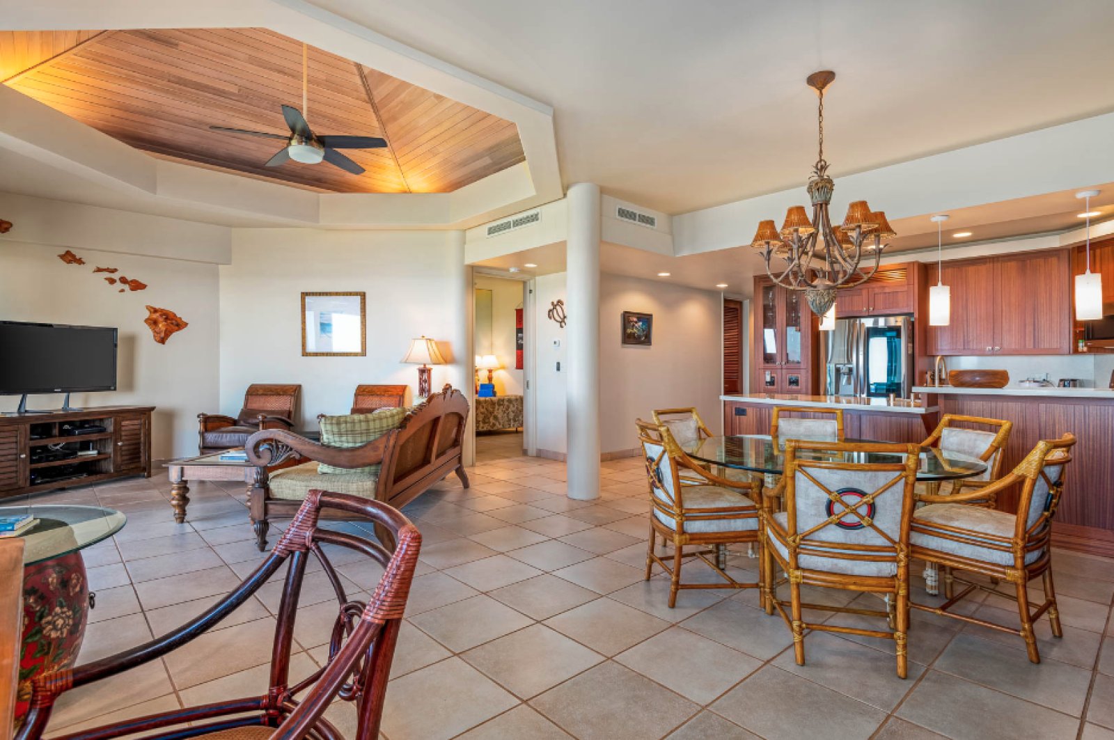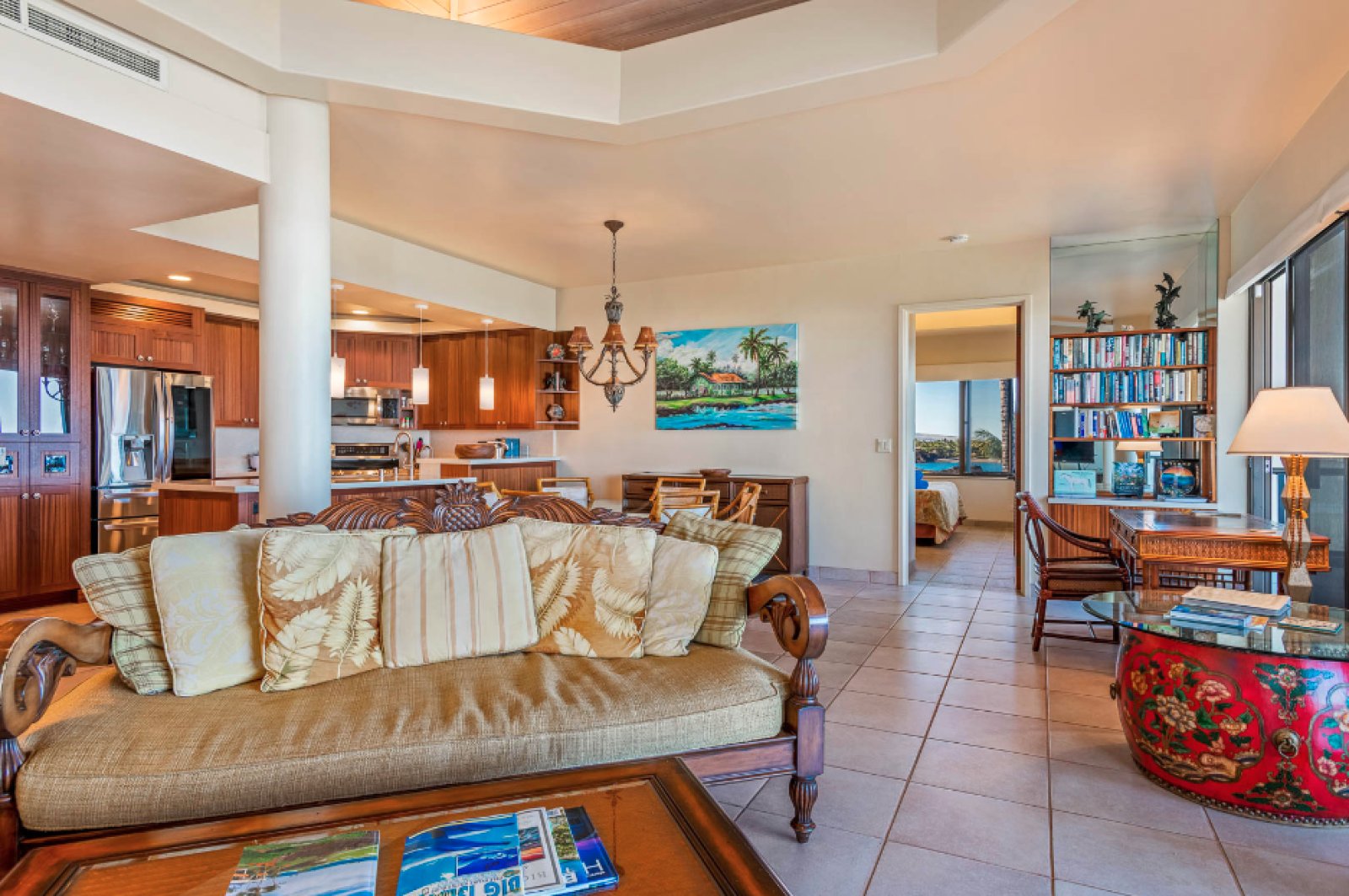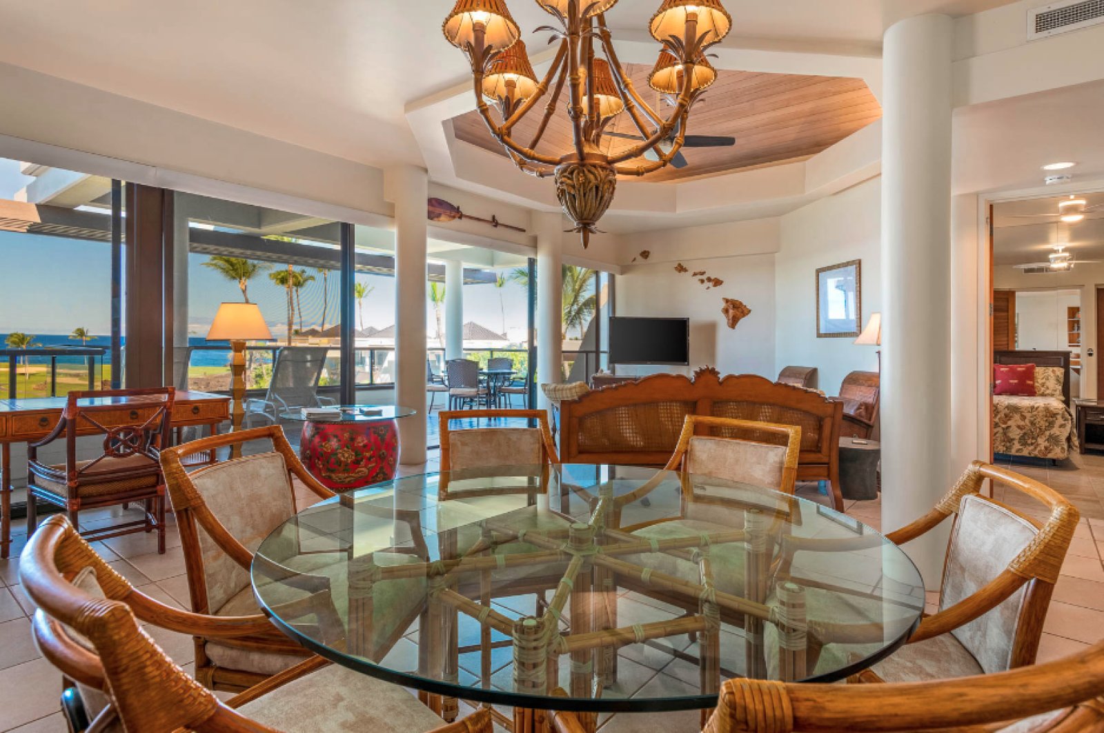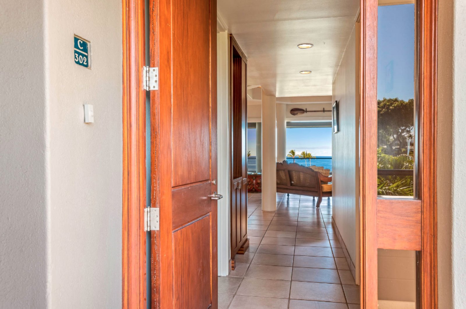 Residence C302 has a remarkable third-floor view overlooking the blue Pacific and Mauna Lani’s famous Par 3 Signature Hole. This vacation rental comfortably sleeps four with two spacious bedrooms and two and one-half bathrooms. The fully equipped kitchen flows into the open-plan living room with a flat-screen TV, a dining room that seats six, and an office space. Cook up Hawaiian-inspired cuisine and enjoy with family and friends from the comfort of your spacious private lanai. The master bedroom boasts a king-size bed. While the second bedroom offers two queen size beds. The master bath features a walk-in shower. This magnificent residence has it all, including the picturesque ocean views Hawaii is known for.