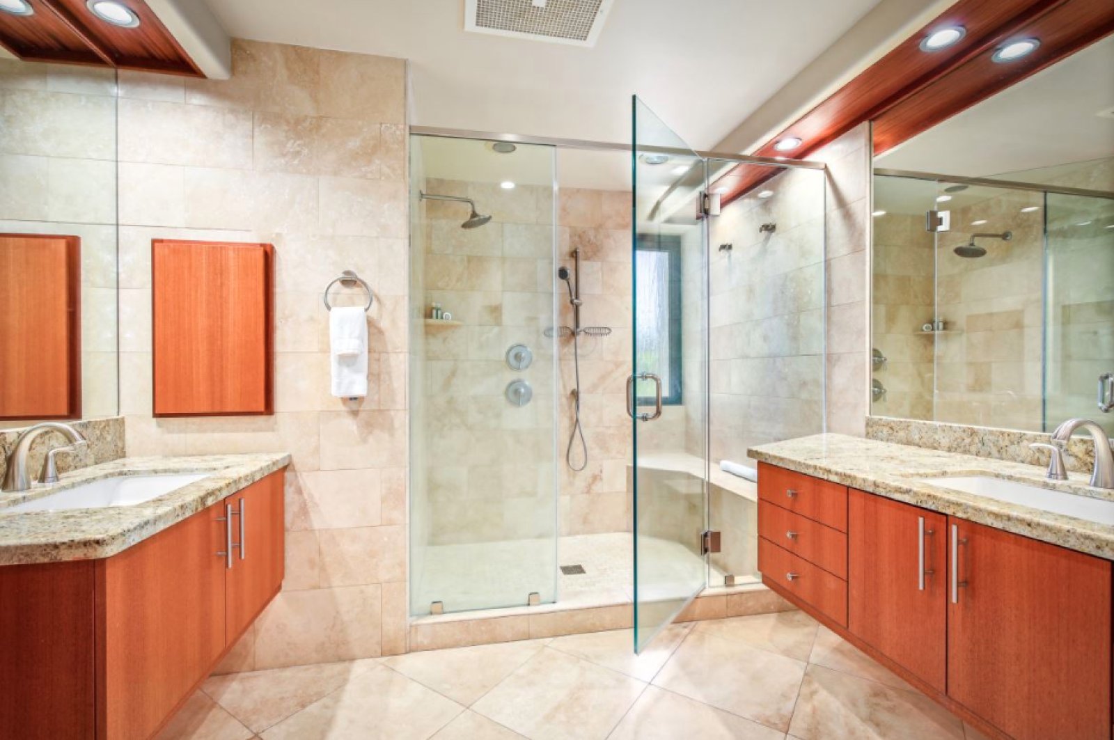 The spacious primary suite features a king bed and private access to the oceanview lanai, allowing you to wake each morning to coastal scenery. A leather chaise lounge positioned by the window creates an inviting nook for reading or quiet reflection.The en-suite bathroom includes dual vanities and an impressively large walk-in shower with multiple shower heads, offering a spa-like experience.