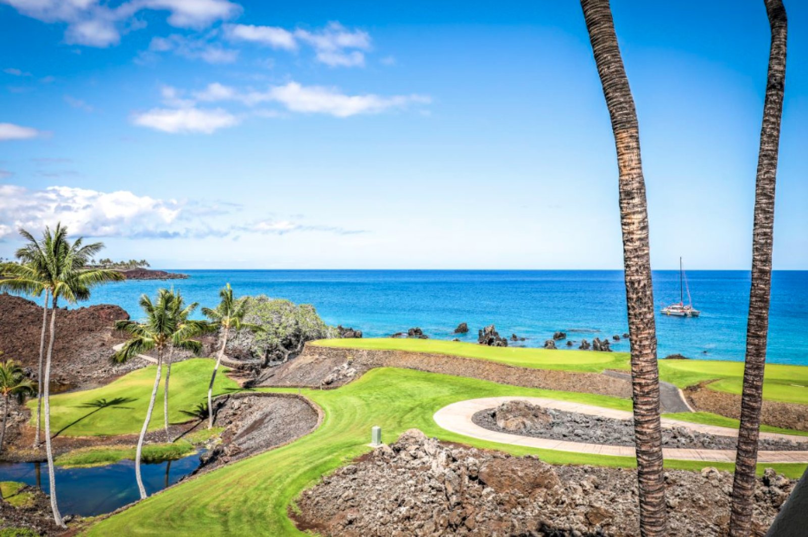 Perched on a privileged third-floor vantage point, Mauna Lani Point C303 delivers some of the most dramatic and elevated views on the property. From the moment you open the front door, sweeping vistas of the Pacific Ocean and championship golf course set the tone for an exceptional Kohala Coast escape. Step onto the open-air lanai to admire a striking blend of emerald fairways, turquoise water, and rugged black lava rock that defines this iconic coastline.This residence overlooks Mauna Lani’s most famous golf hole, where golfers attempt a legendary tee shot over the ocean to an isolated green. From your lanai, enjoy a front-row seat to this world-renowned challenge and the ever-changing colors of sea and sky beyond.