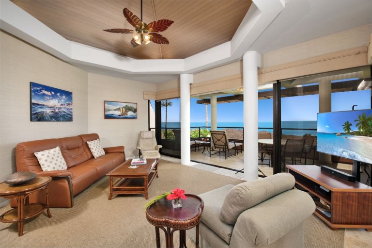 Spanning approximately 1,509 square feet, the residence features a spacious open floor plan that seamlessly connects the living room, dining area, and kitchen. Large glass doors open to a private lanai where sweeping views of the ocean and golf course create an ever-changing backdrop. The lanai is ideal for morning coffee, afternoon relaxation, or sunset cocktails while watching golfers tee off over the ocean toward the distant green.The interior design balances comfort and elegance, with high-end furnishings, central air conditioning, and thoughtful details that make the home equally suited for extended stays or memorable vacations.