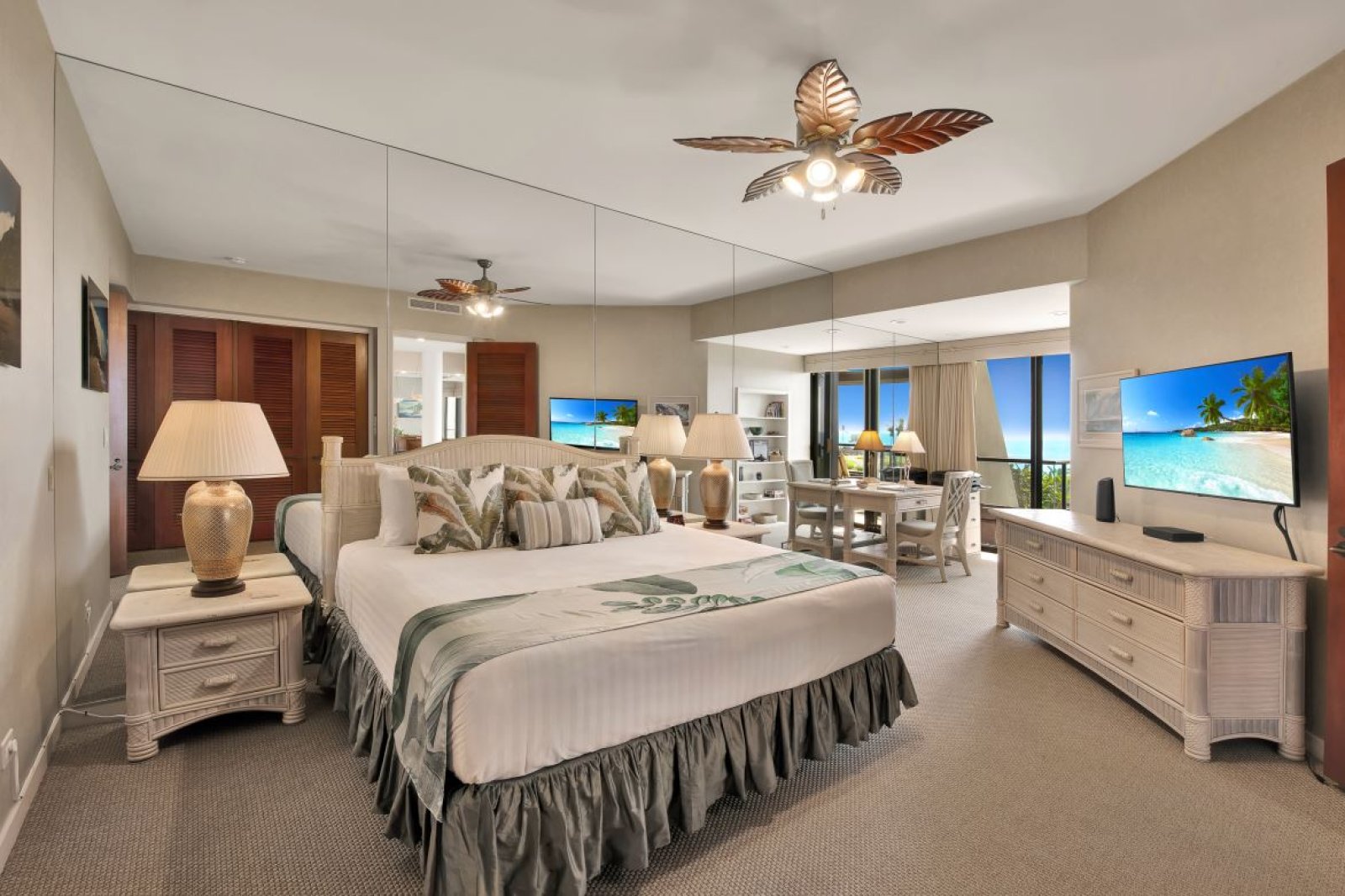 Bed: King Bed • En-Suite Bath with Shower and Bathtub • Ceiling Fan • Cable TV • Desk • Additional Seating • Direct Access to Private Balcony • Ocean View