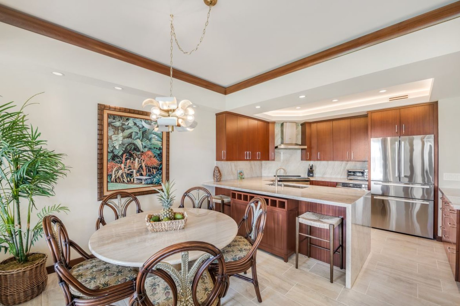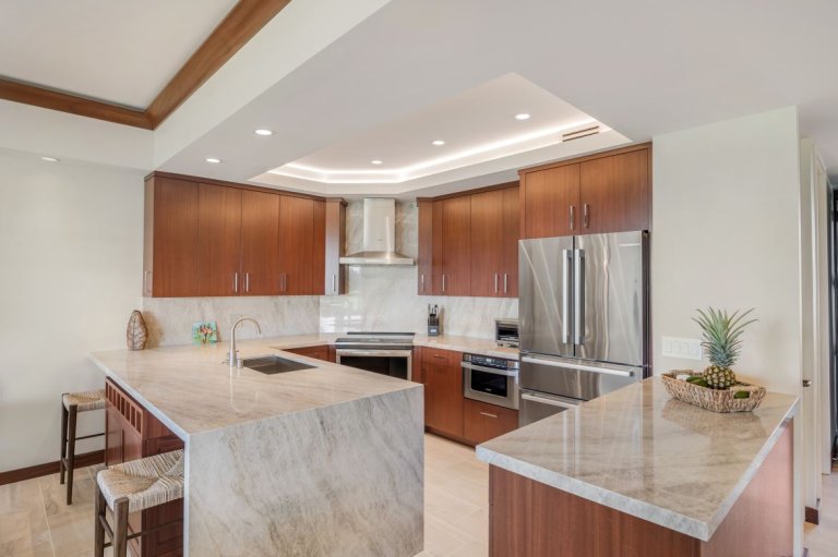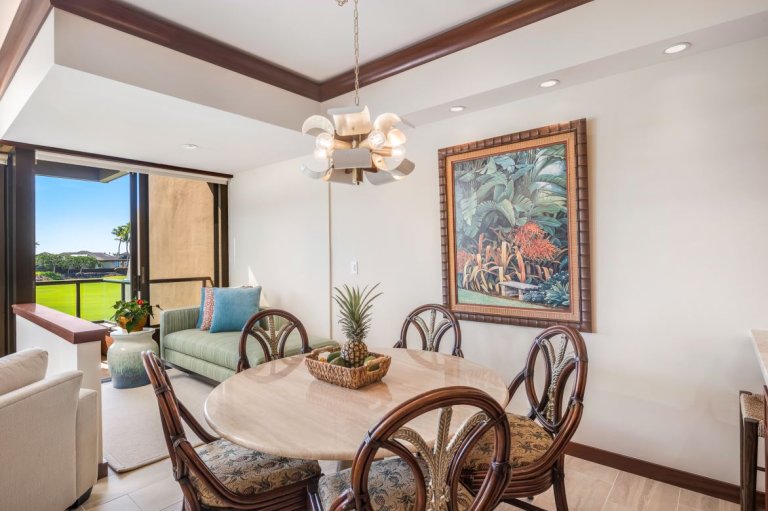 The full kitchen is well appointed with modern appliances, granite countertops, and generous cabinetry. Whether preparing meals with fresh island ingredients or enjoying takeout from nearby restaurants, the kitchen offers ease and flexibility. Indoor dining is complemented by alfresco meals on the lanai, framed by ocean and fairway views.Resort-Style Amenities