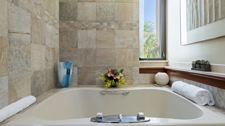 The inviting bedroom features a plush king-sized bed and a 50” Samsung Smart TV—your personal retreat for restful nights. Wake to golden sunlight and the soothing sounds of the island. The en-suite bathroom offers a spa-like experience with a large soaking tub, walk-in shower, and dual vanities. A convenient half bath is located off the main living area.Private Lanai & Views
