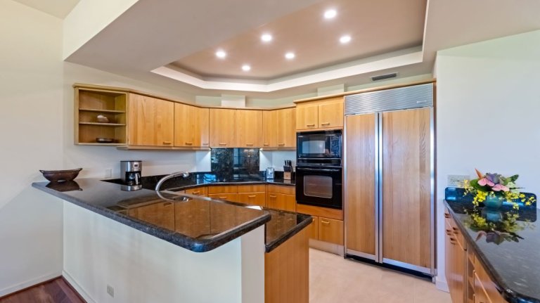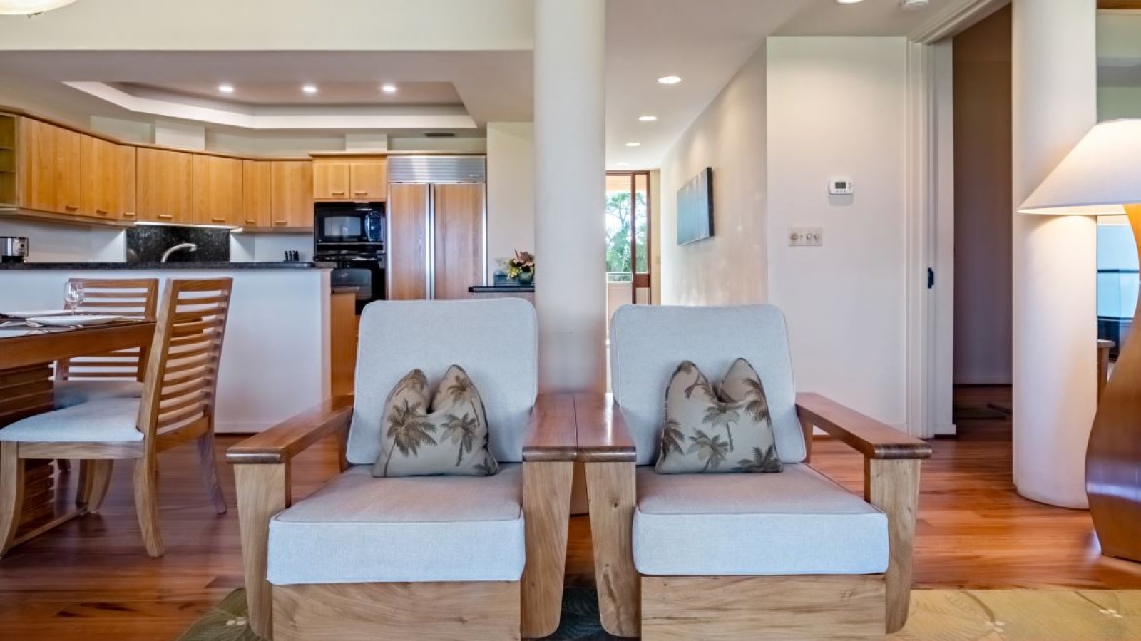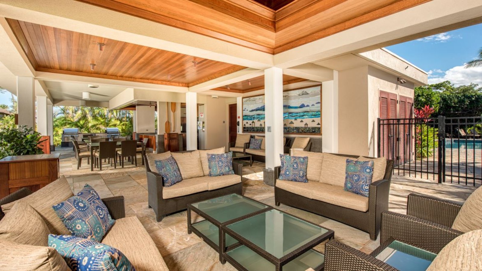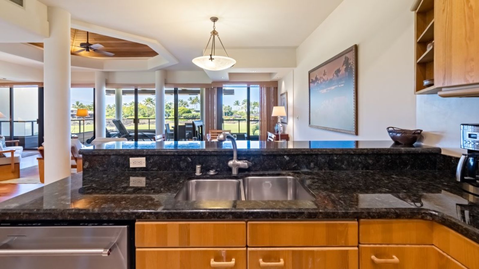 Step inside to a spacious, thoughtfully designed living area furnished for comfort and relaxation. Large windows and sliding doors open to an expansive private lanai, filling the home with natural light and cooling island breezes. With multiple seating options, the living room is ideal for unwinding after a day of island adventures.The fully equipped kitchen features modern appliances and granite countertops, making it easy to prepare meals at home. Enjoy dining indoors or savor your culinary creations alfresco on the lanai while soaking in the spectacular ocean and golf course views.