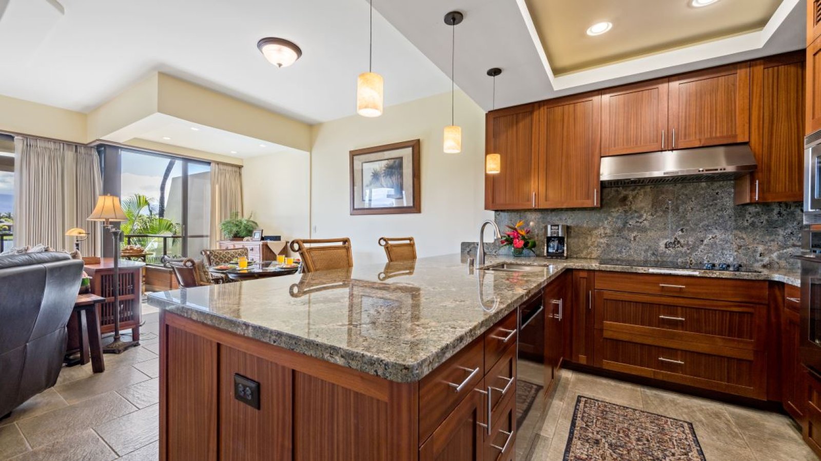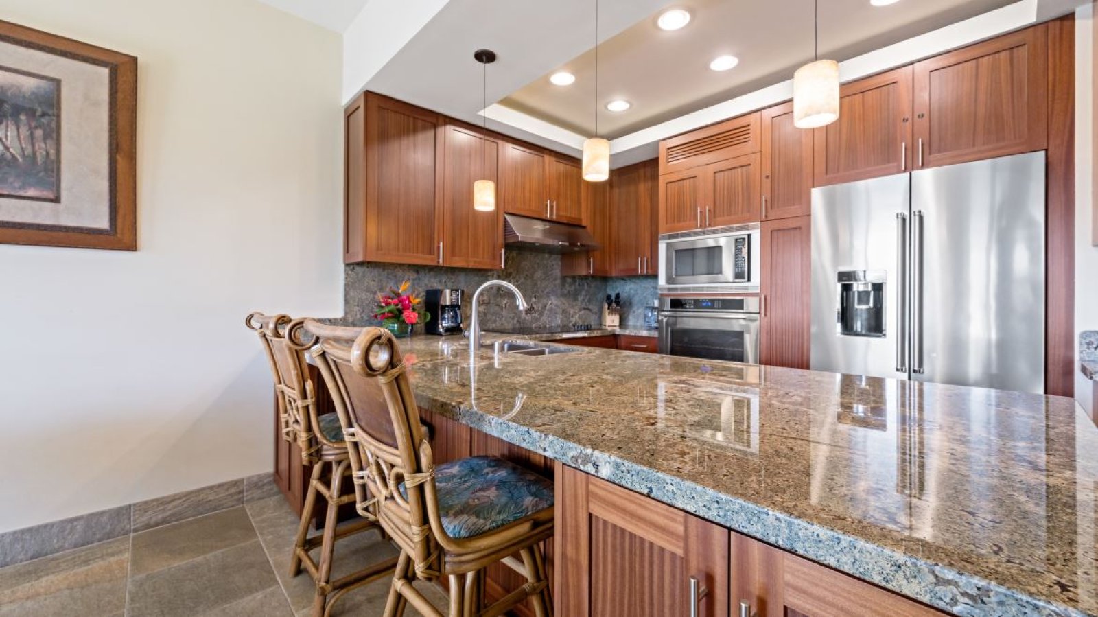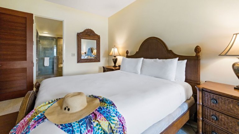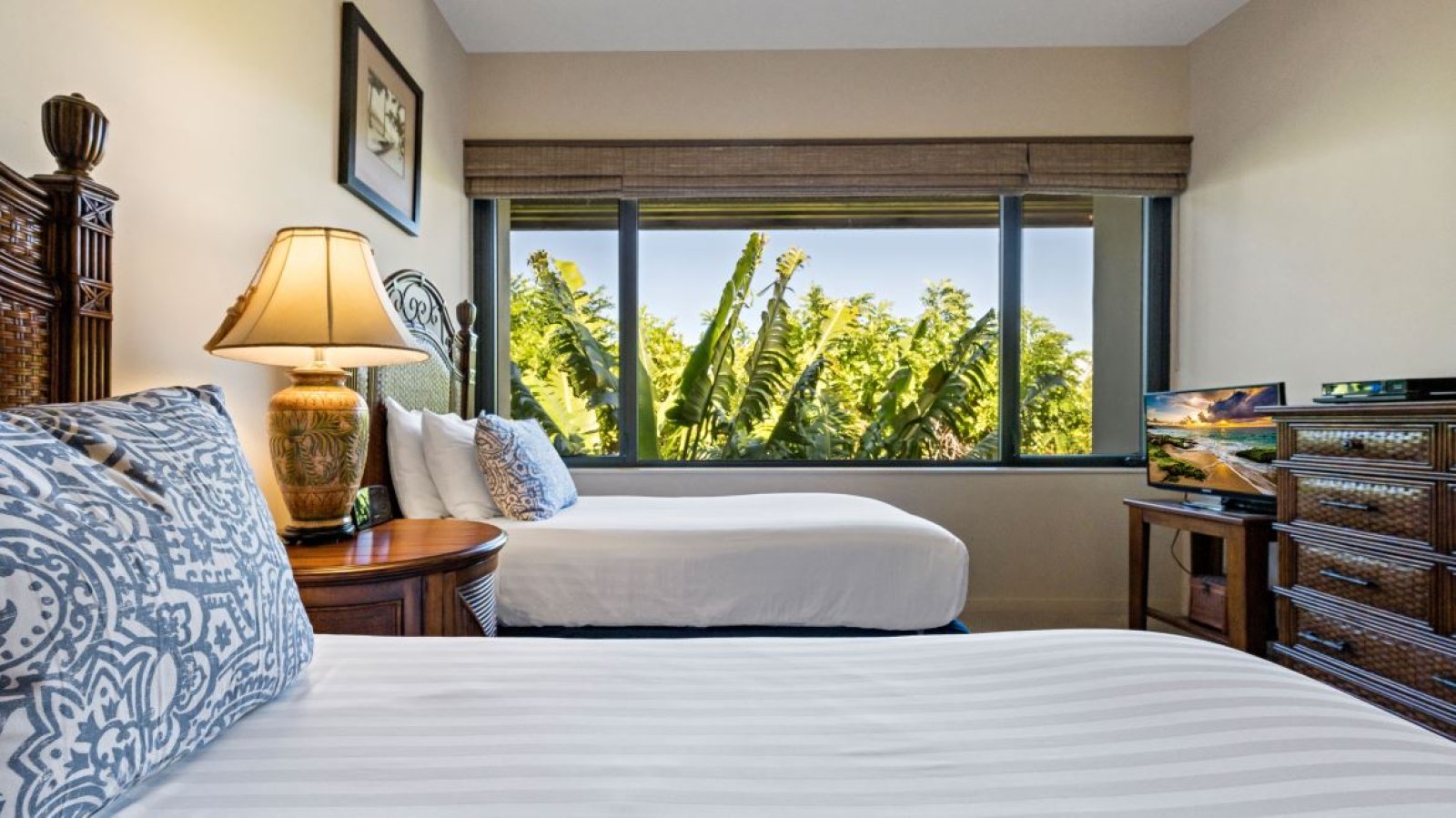 The fully equipped kitchen features granite countertops and modern appliances, making meal prep a pleasure. Enjoy dining indoors at the elegant table or take meals outside to the lanai, where gentle trade winds and lush views elevate every bite.Sleeping Accommodations | Up to 6 Guests