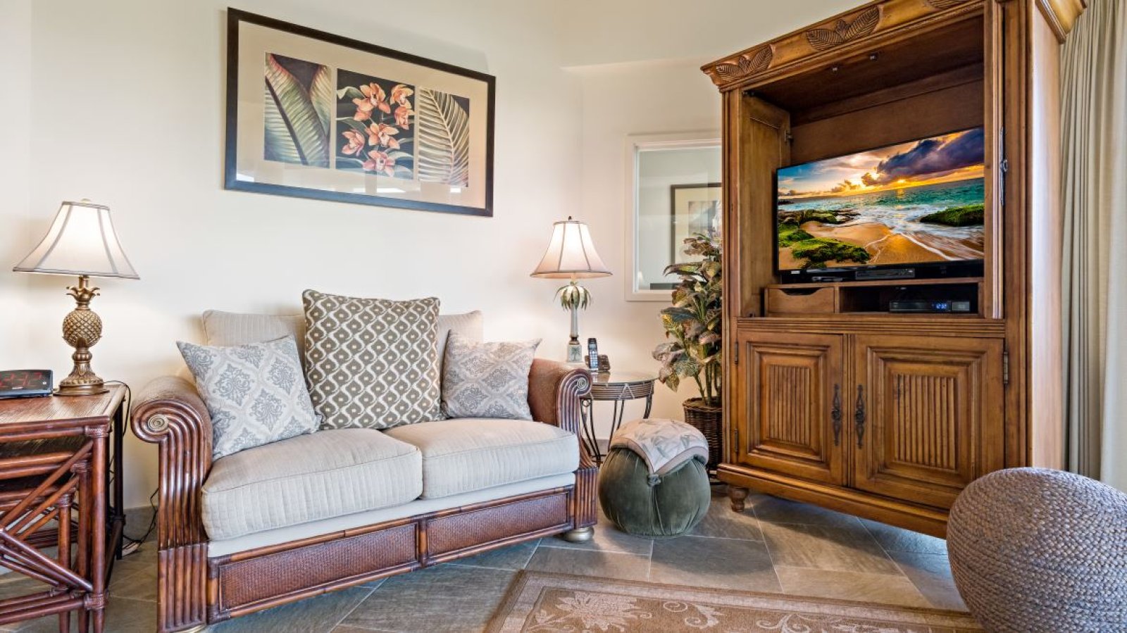 Step inside to an inviting, light-filled living area accented with modern furnishings and subtle Hawaiian touches. Expansive windows frame views of manicured fairways, creating a tranquil backdrop for relaxation. The open layout flows seamlessly to your private lanai—ideal for morning coffee, evening cocktails, and watching golfers navigate the greens.Kitchen & Dining