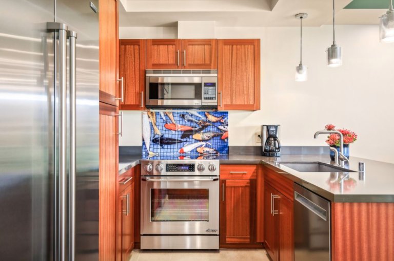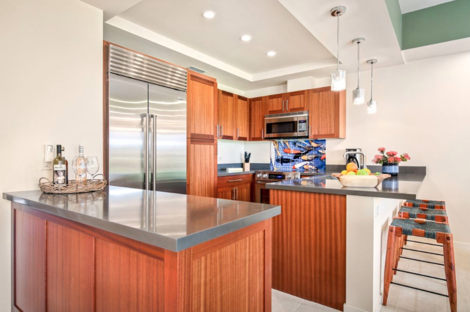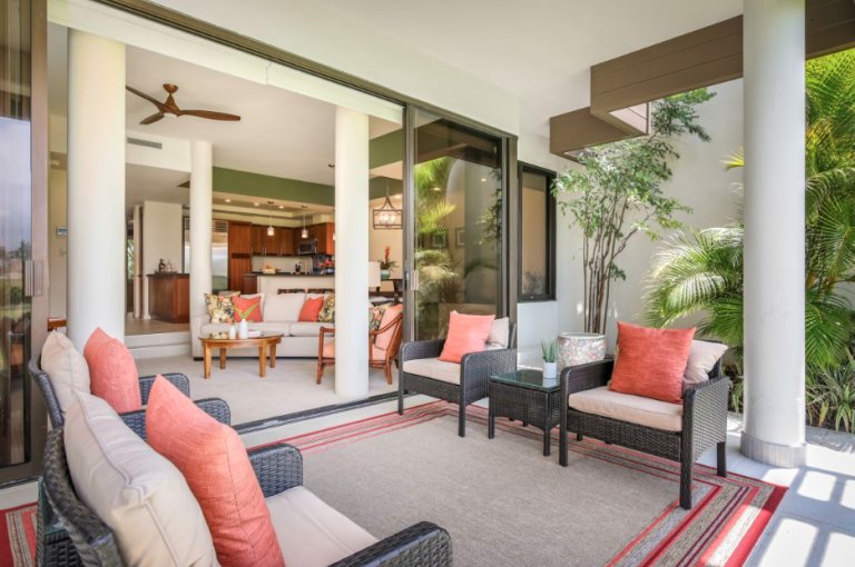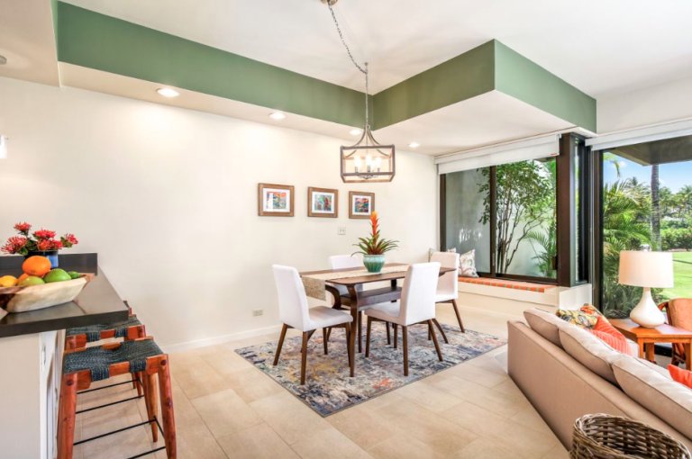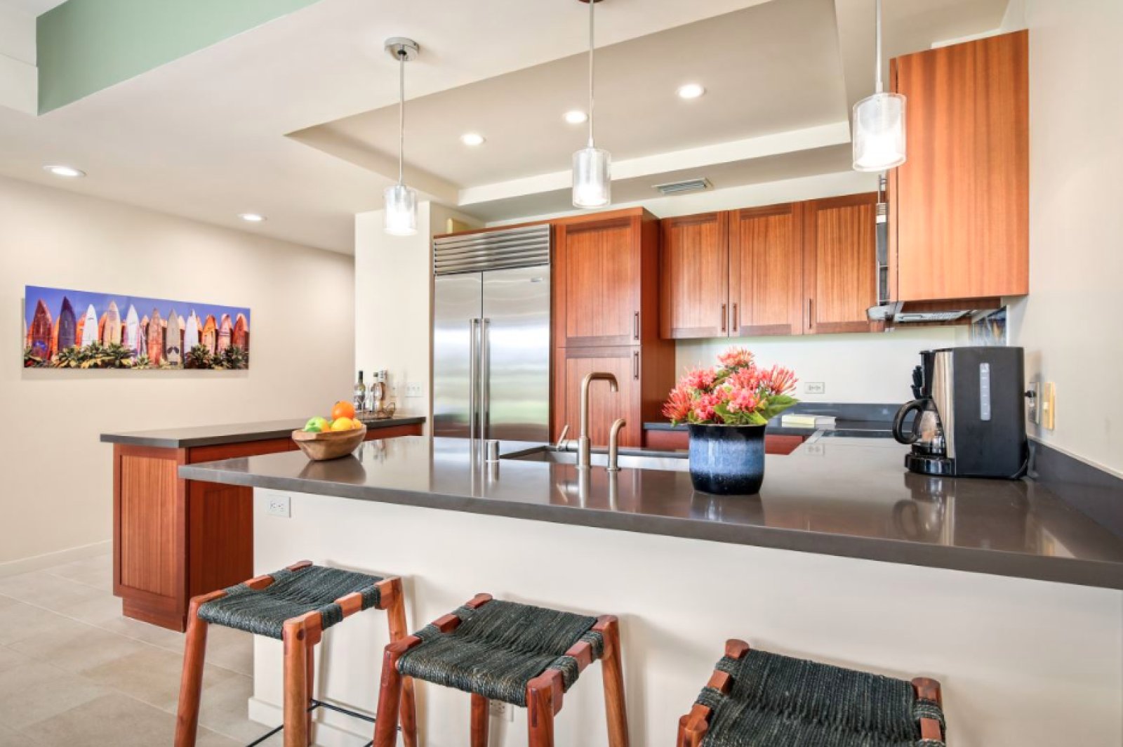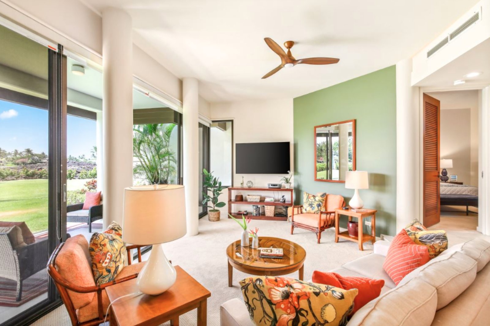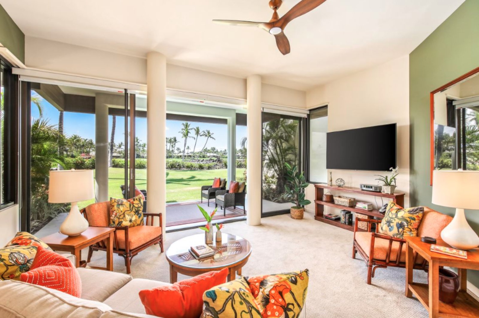 Mauna Lani Point J102 is a spacious 1,306 square foot two bedroom, two bath condo. This recently updated ground floor vacation rental features an open floor plan with plenty of space for everyone to gather and unwind. The island-inspired décor has a modern aesthetic with warm and inviting tones.
