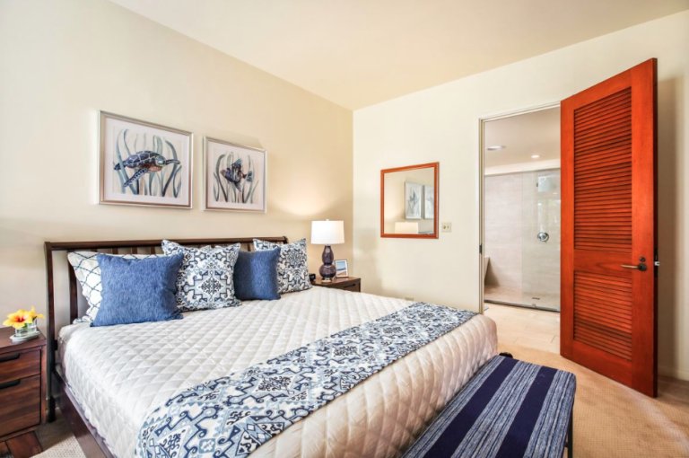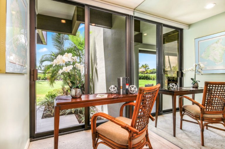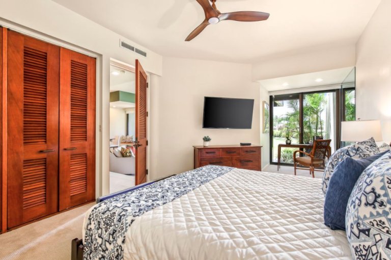 The fully equipped kitchen opens up to the dining room and living room with extra bar seating so you can keep the ‘chef’ company while they prepare the day’s catch. The private covered lanai is a perfect spot to take in sweeping fairway views while you enjoy your morning coffee.