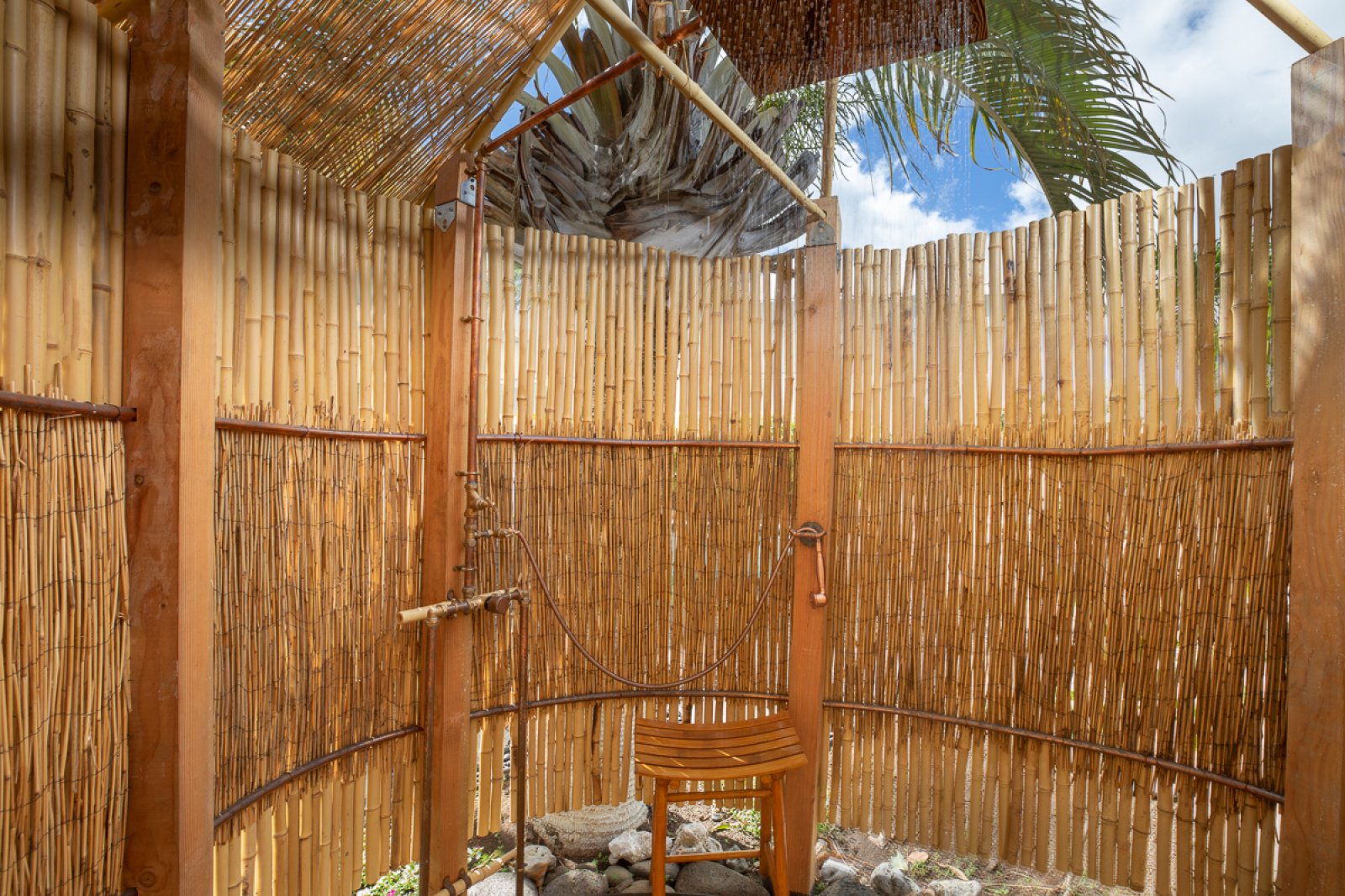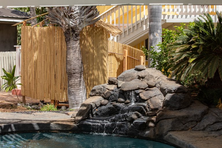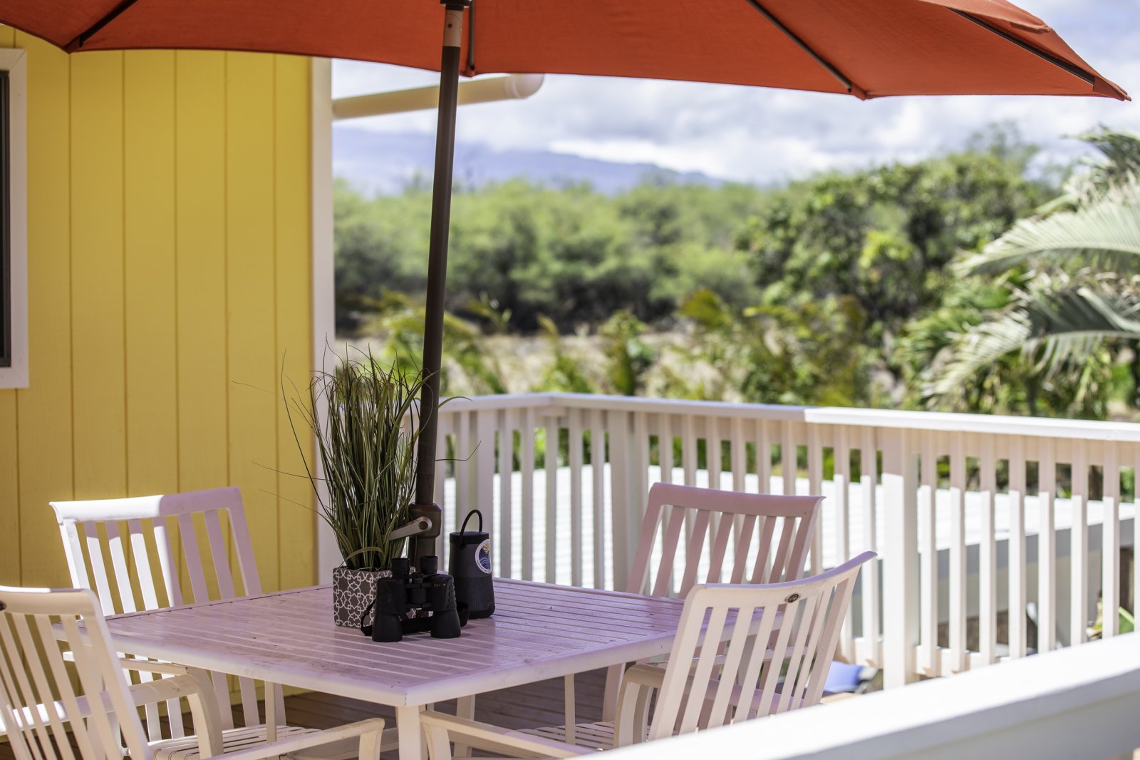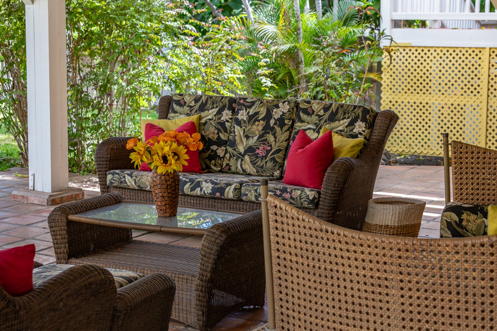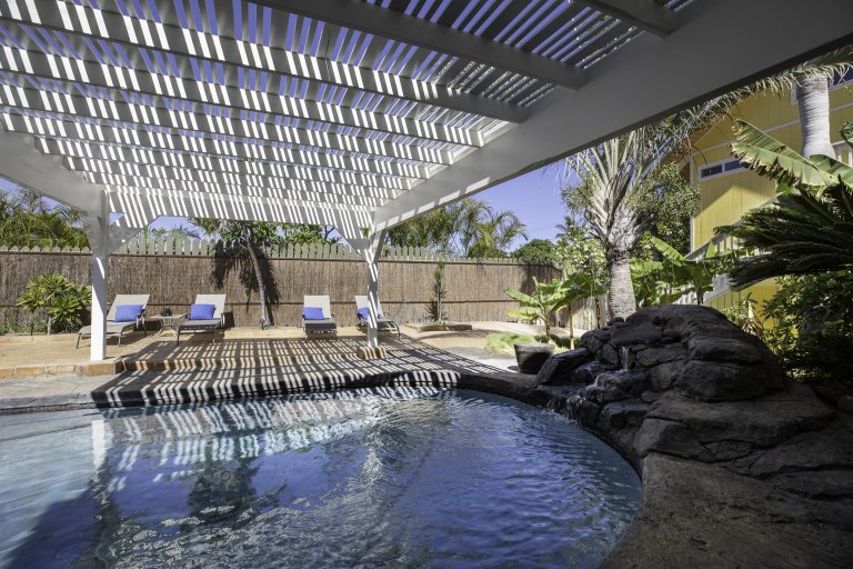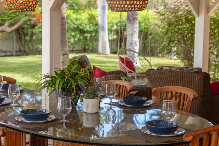Step outside to your private pool oasis, where shaded seating provides a serene escape from the sun. The outdoor dining area is surrounded by greenery, perfect for enjoying meals with an island breeze.